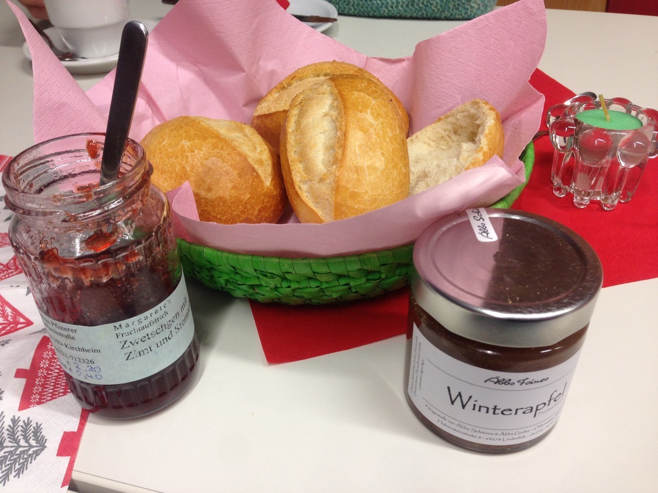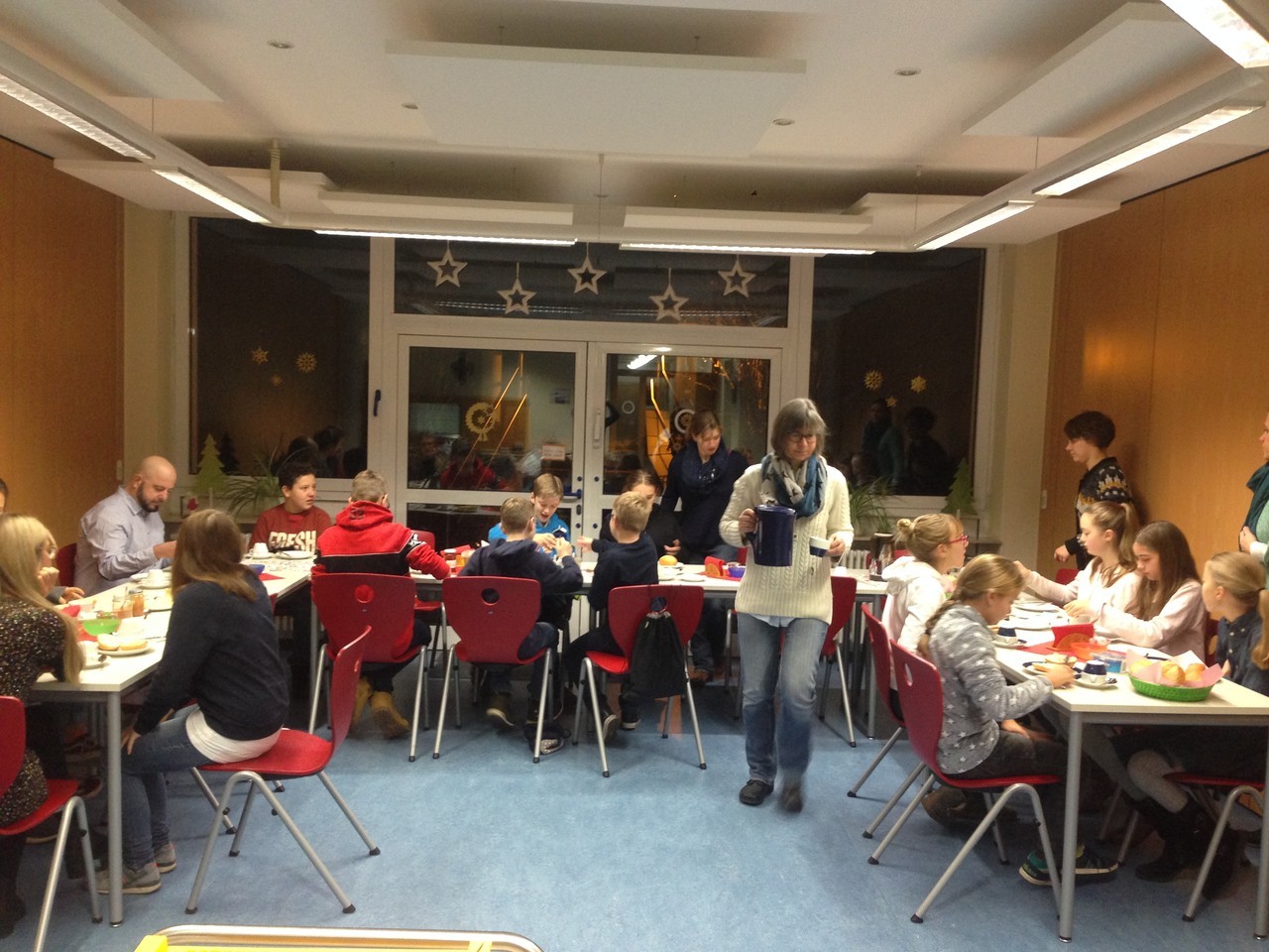Im Anschluss gehen alle, die möchten, zum gemeinsamen Frühstück in die Räume des Horts. Dort gibt es leckere Brötchen mit Aufstrich, Marmelade, Butter und Käse. Zu trinken gibt es Milch, Kakao und Wasser, für die Großen auch Kaffee.