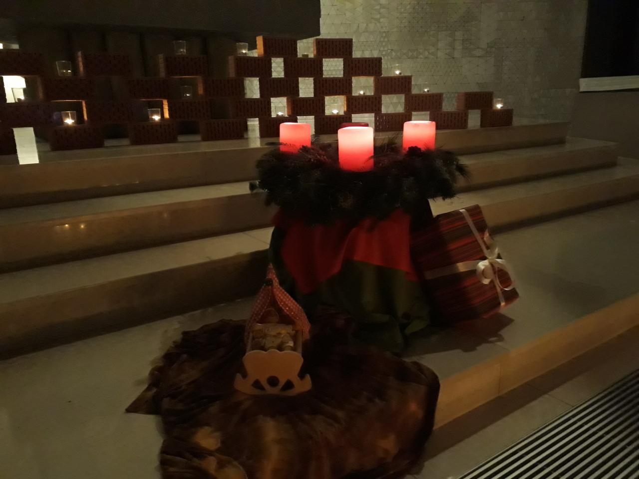 Nicht jeder hat die Möglichkeit oder den Elan, morgens so früh zur Schule zu kommen. Daher darf jede Klasse einmal in der Adventszeit zum großen Adventskranz im Foyer, dort die Kerzen entzünden, eine nachdenkliche Geschichte hören und an der Krippe mitbauen. In diesem Jahr kommen viele verschiedene Figuren zur Krippe, die man dort gar nicht vermutet hätte. Auch Gegenstände als Symbol werden zur Krippe geheftet. So soll deutlich werden, dass alle dazugehören und jeder, mit all seinen Fehlern und Problemen, bei dem kleinen Kind in der Krippe willkommen und gut aufgehoben ist.