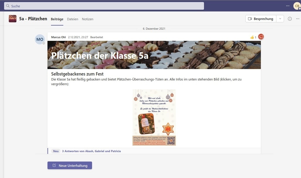 Glücklicherweise hat der Elternbeirat mit Hilfe von Frau Wech, der Leiterin der Unterstufe, kurzfristig eine digitale Alternative zum eigentlich geplanten Adventsbasar mit Ständen im Schulhof auf die Beine gestellt. Wie jedes Jahr hatten alle Klassen (und AGs) die Möglichkeit, etwas für einen guten Zweck zu basteln oder zu backen und es zum Verkauf anzubieten – nur nicht an einem Verkaufsstand, sondern über die Plattform „Teams“. So konnten die Eltern zwischen dem 03. und 07. Dezember über die Accounts ihrer Kinder von zu Hause aus im diesjährigen Angebot stöbern und online Bestellungen aufgeben.