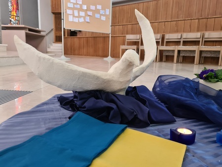 Seit dem Wiederbeginn des Unterrichts steht nun in jeder ersten großen Pause die Kapelle zum stillen Gebet offen. Zu ruhiger Musik besteht die Möglichkeit, Bitten zu formulieren und an eine Pinnwand zu heften. Jeweils freitags werden die Bitten in einem gestalteten Friedensgebet vor Gott getragen. Bei aller Ohnmacht angesichts des Kriegs in Europa tut vielen die Gemeinschaft gut, während andere lieber in Stille zum Gebet in der Kapelle verharren.