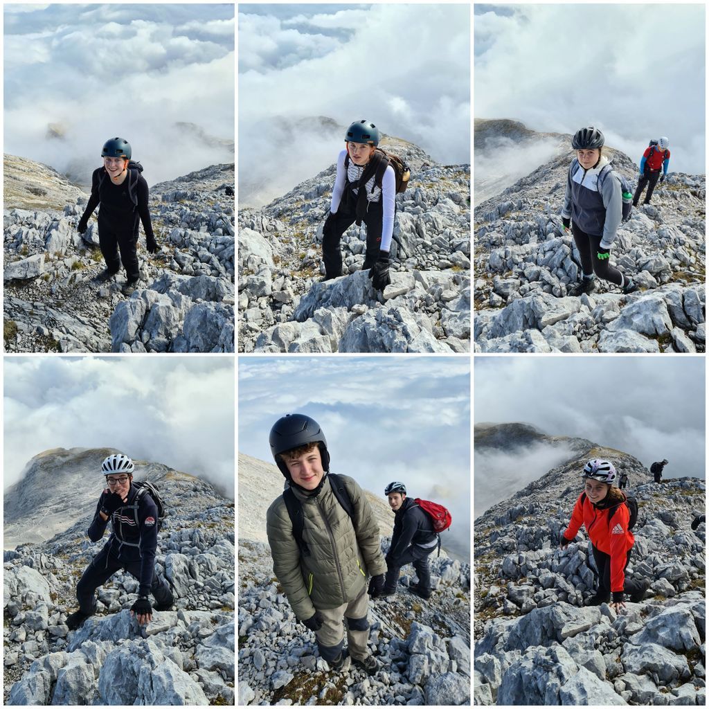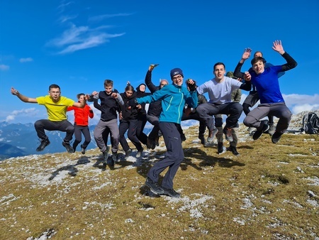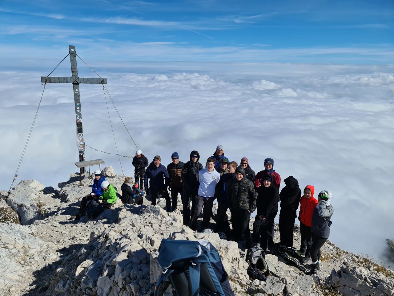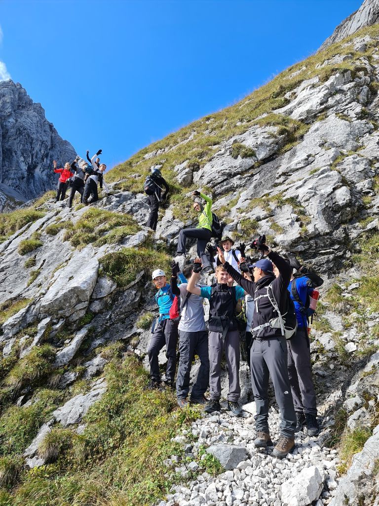 Belohnt wurde die Bergtruppe oben angekommen von strahlend blauem Himmel und einem atemberaubenden Panorama. Nach einer kurzen Verschnaufpause und einer kleinen Stärkung galt es dann den Abstieg durch das Höllental zur Höllentalangerhütte zu bewältigen, was aber durch die richtigen Tipps von Herrn Rothmann absolut kein Problem darstellte. Erschöpft, aber überaus zufrieden kamen alle bei der Hütte an, die unter anderem mit frischem Kaiserschmarrn und warmer Gulaschsuppe lockte.