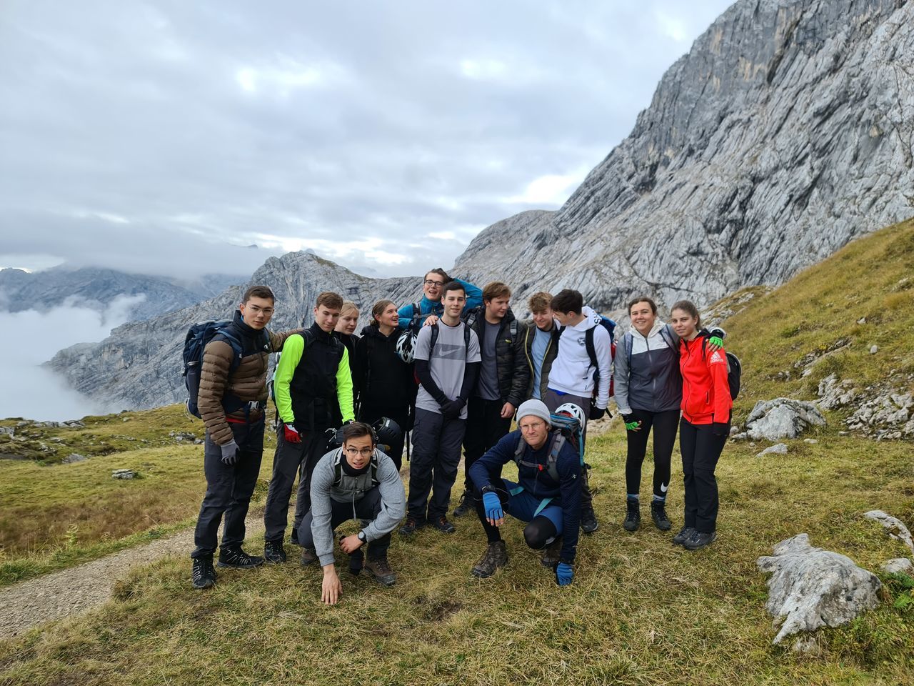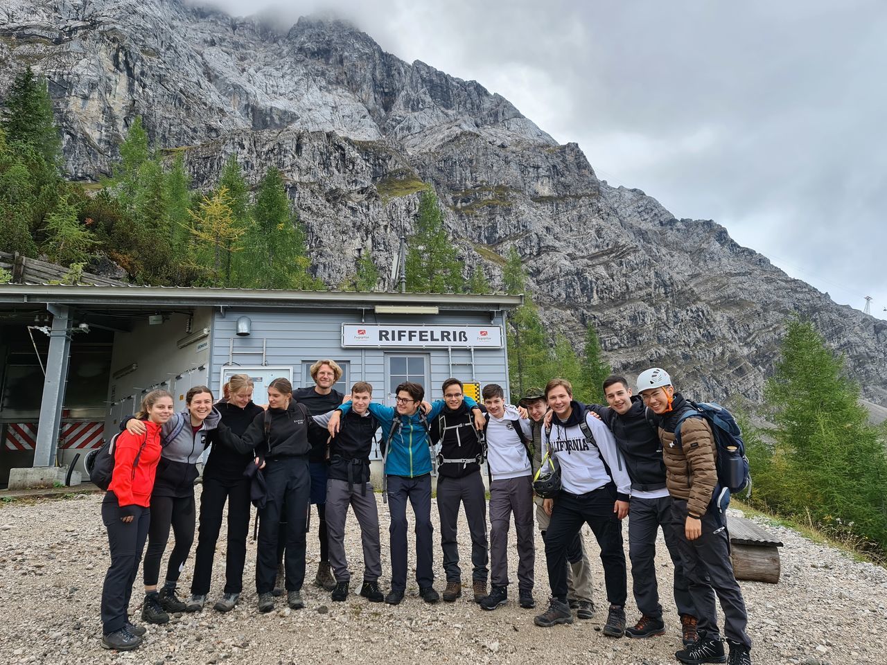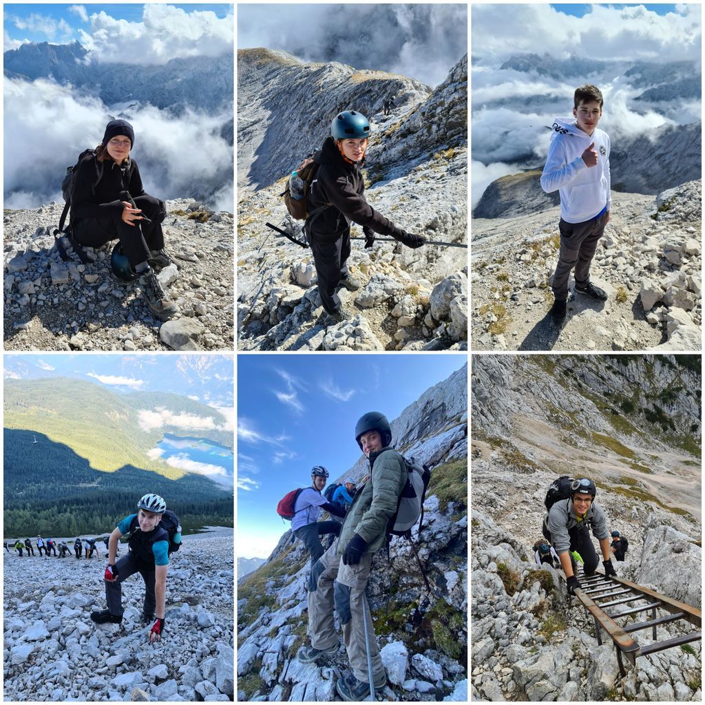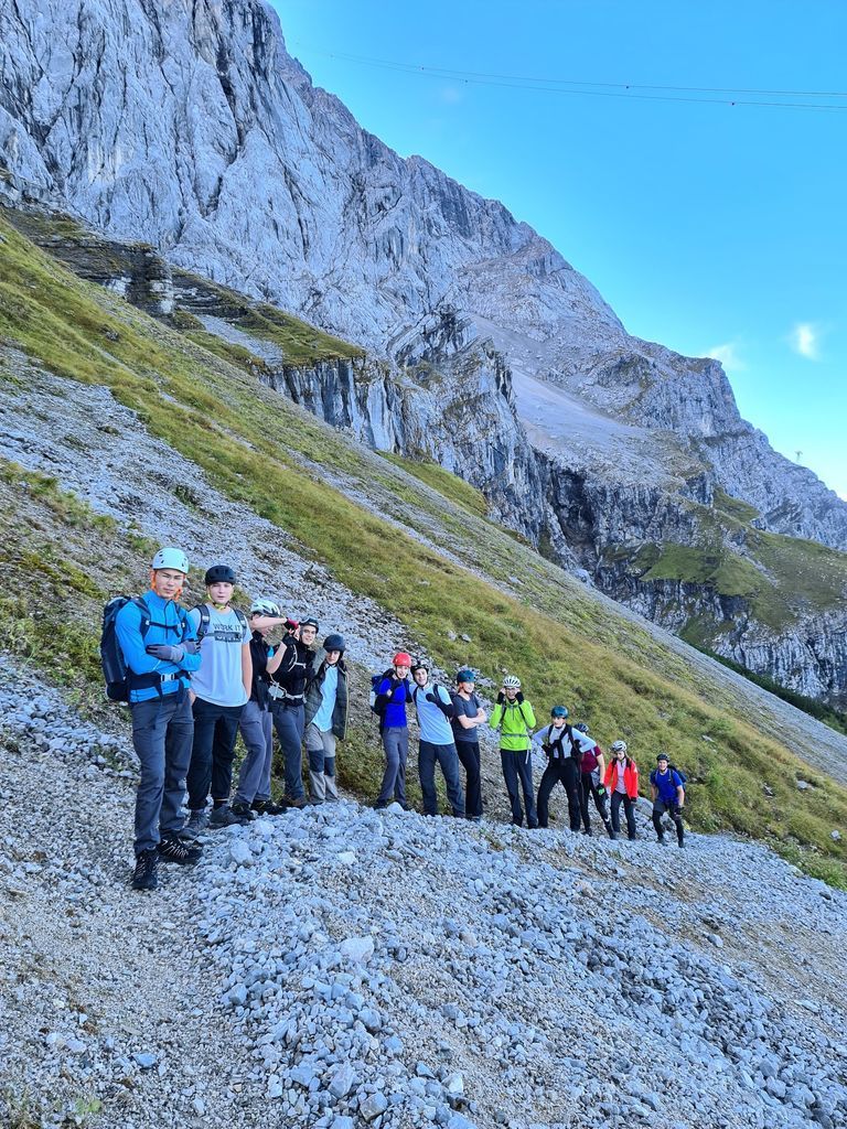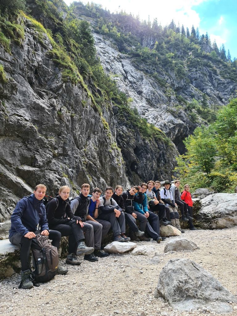 Wenn der Berg nicht zur Kursstufe 2 kommt, muss die Kursstufe 2 wohl zum Berge kommen. Und da in Mannheim und Umgebung kein geeigneter Berg zu finden ist, zog es eine Truppe von zwölf bergwanderwilligen Schülerinnen und Schülern zu Beginn des Schuljahres am 27. September in Begleitung von Herrn Hanpft und Herrn Rothmann ins vier Zugstunden entfernte Garmisch-Partenkirchen.Das Ziel war die zentral gelegene "moun10"-Jugendherberge, die mit ihrer modernen Ausstattung und dem gemütlichen Ambiente sowohl für die Schülerinnen und Schüler als auch für die beiden Lehrkräfte das perfekte "Basislager" für die anstehenden Touren darstellte. Nach kurzer Eingewöhnung und Beziehen der Zimmer ging es in die Innenstadt Garmisch-Partenkirchens, wobei diese zum Glück nicht die aus Mannheim gewohnte chronische Enge eines Ballungsraumes bot, sondern ein entspanntes Flair aus Bergsportgeschäften und einladenden Restaurants.