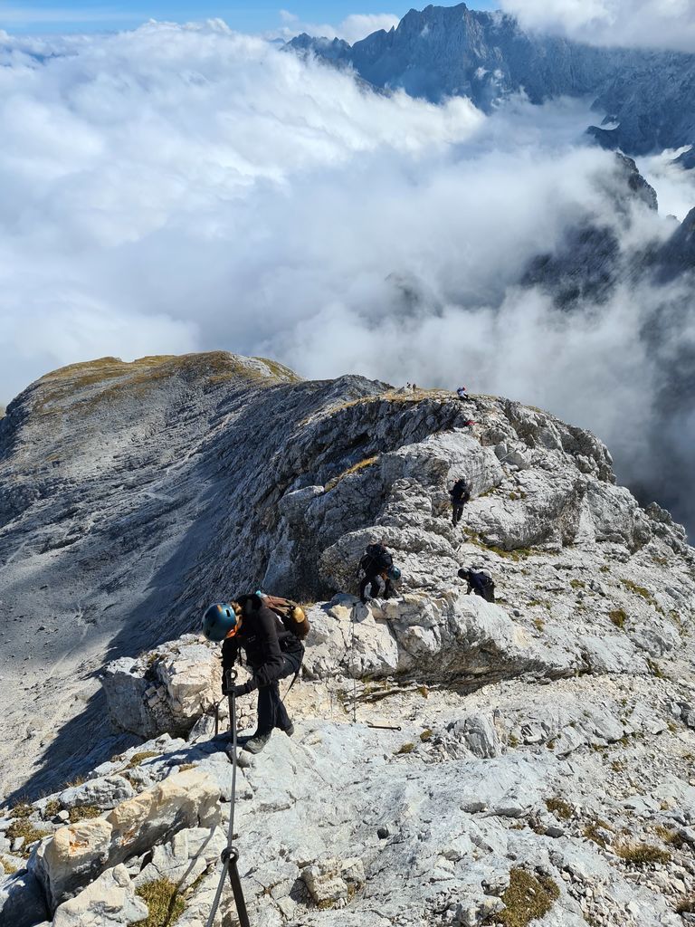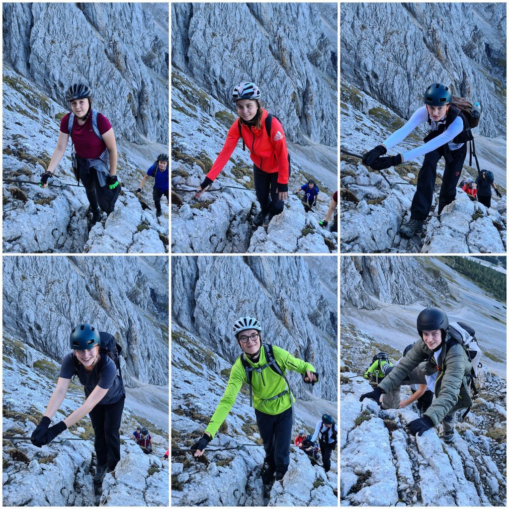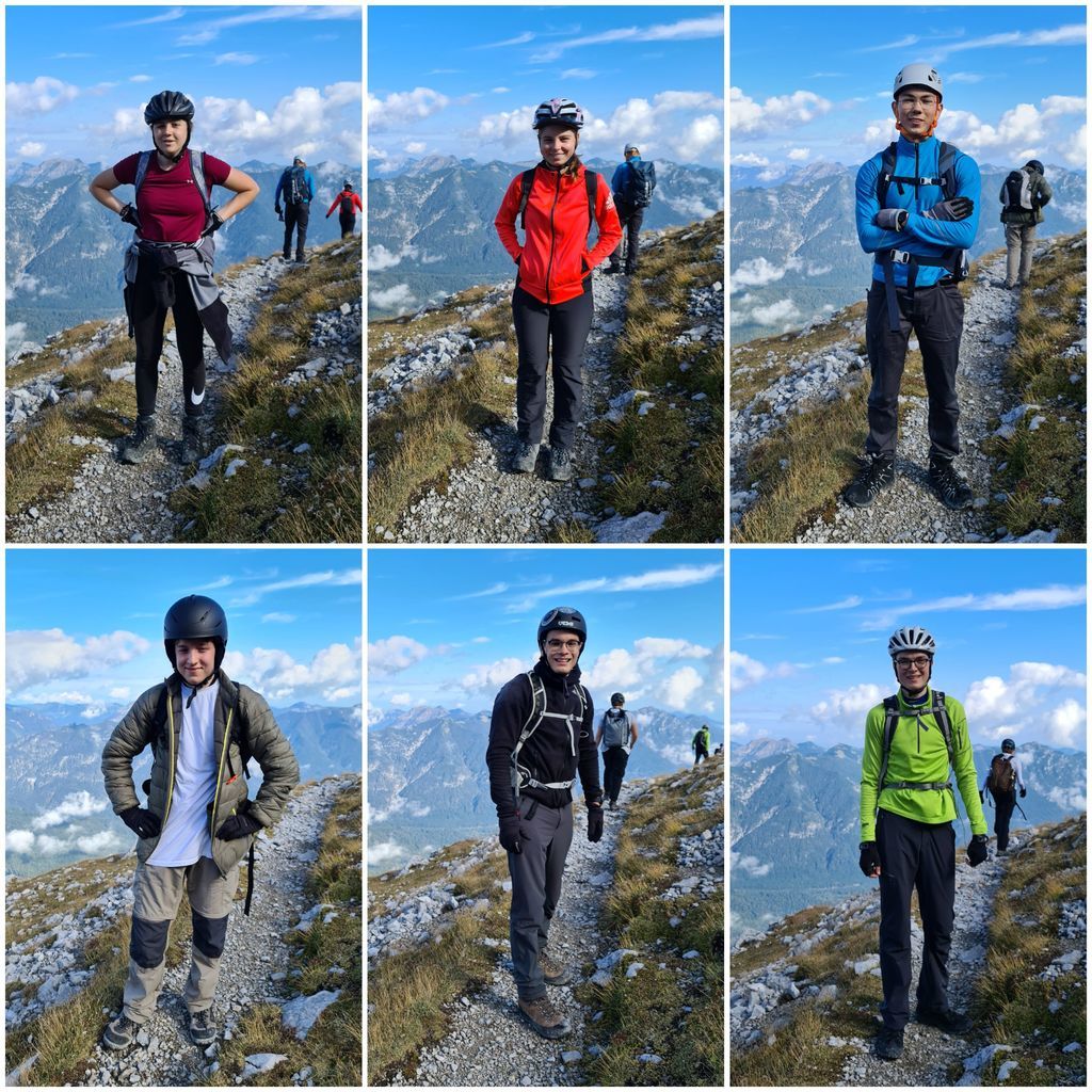 Es galt wieder einige Klettersteigpassagen und steile Berghänge zu überwinden, doch mit gegenseitiger Unterstützung schafften es schließlich alle, zunächst den Nordwandersteig und dann auch den Ostgrat der Alpspitze hoch zum Gipfelkreuz zu bewältigen. Nach einem gemeinsamen Gipfelfoto und dem darauffolgenden Abstieg kehrten die Bergsteiger des UGM auf der am Osterfelder Kopf gelegenen Hütte zu einer Mittagspause ein. Nach einer kurzen Stärkung ging es für die gesamte Gruppe wieder in Richtung Garmisch-Partenkirchen, wobei ein Teil der Gruppe die Bergbahn dem Abstieg vorzog.