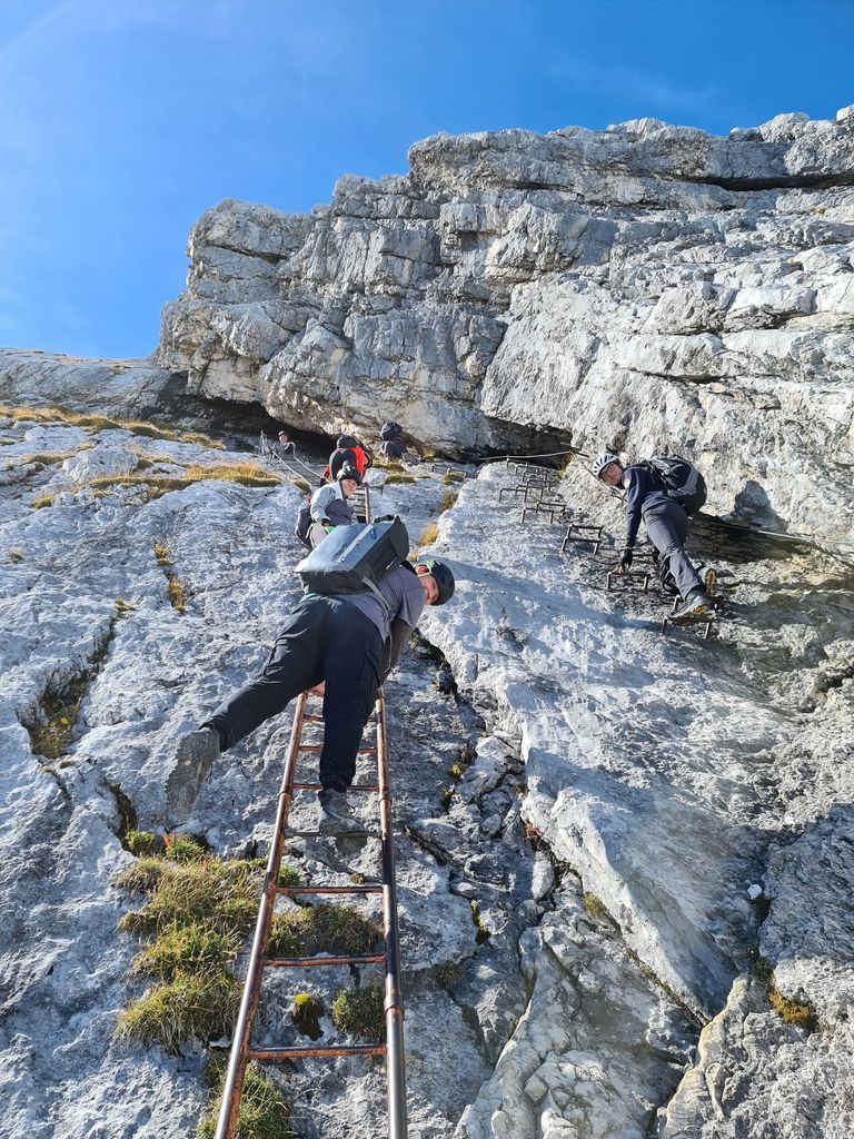 Diese Erholung wurde auch dringend benötigt, schließlich sollte es am nächsten Tag zur auf 2.628 Metern gelegenen Alpspitze gehen. Pünktlich um sieben Uhr standen alle zum Frühstück bereit und so konnte der Tag voller Vorfreude begonnen werden. An diesem Tag ging es mit einer der ersten Bergfahrten der Alpspitzbahn hoch zum Osterfelder Kopf, von wo aus auch die Tour des Tages starten sollte.