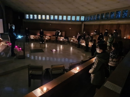 Es ist an unserer Schule liebgewonnene Tradition in der Advents- und auch in der Fastenzeit, einmal in der Woche in der Kapelle zu den Frühschichten zusammenzukommen. In diesem Jahr konnten die Frühschichten wieder stattfinden, auch wenn wir auf das beliebte gemeinsame Frühstück verzichten mussten. Doch stattdessen gab es Frühstückstüten – also statt Brötchen mit Nutella oder Marmelade gab es Brezeln mit Butter und Obst und statt Tee oder Kaffee gab es Trinkpäckchen. Eine kleine Süßigkeit versüßte den Morgen.Wer das gemeinsame Frühstücken sehr vermisste, konnte sich vielleicht damit trösten, dass die Frühschichten nicht wie sonst um 7 Uhr starteten, sondern erst um 7.30 Uhr – eine halbe Stunde länger im Bett liegen bleiben zu können, ist schon ein starkes Argument, und so trafen sich immer mehr Schülerinnen und Schüler, Lehrerinnen und Lehrer an den drei Donnerstagen im Advent in der Kapelle.
