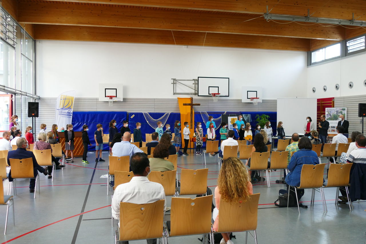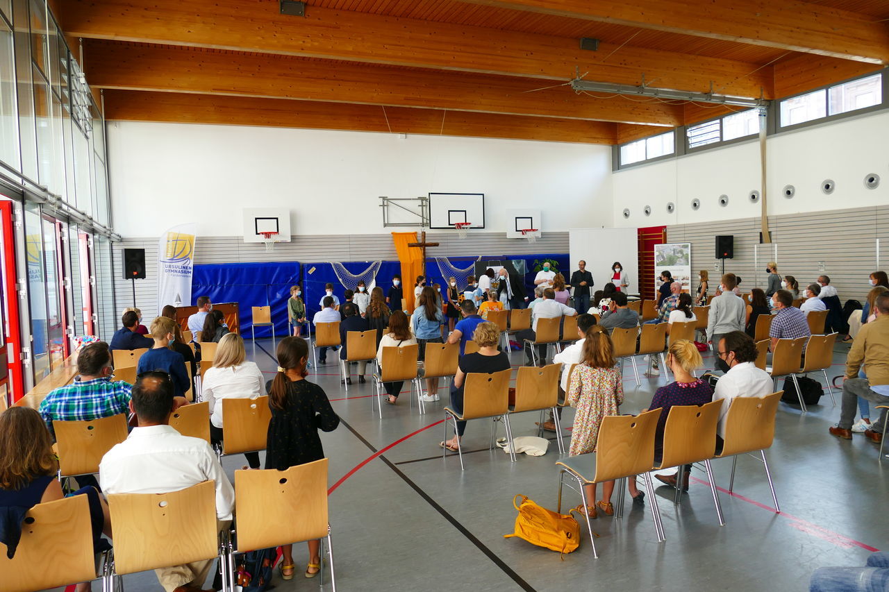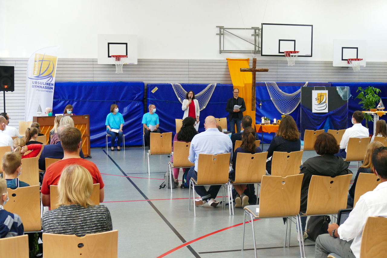 Mit drei feierlichen Zeremonien in der Turnhalle wurden die drei neuen Klassen am UGM heimisch. In einem kleinen Gottesdienst, angeleitet von Frau Nunn und Herrn Ohl, fand die Aufnahme einen rituellen Rahmen. Dieser Rahmen mochte auch den Eltern bewusst machen, dass die Aufnahme am Gymnasium mit wieder ein wenig mehr Loslassen ihrerseits einhergehen darf.