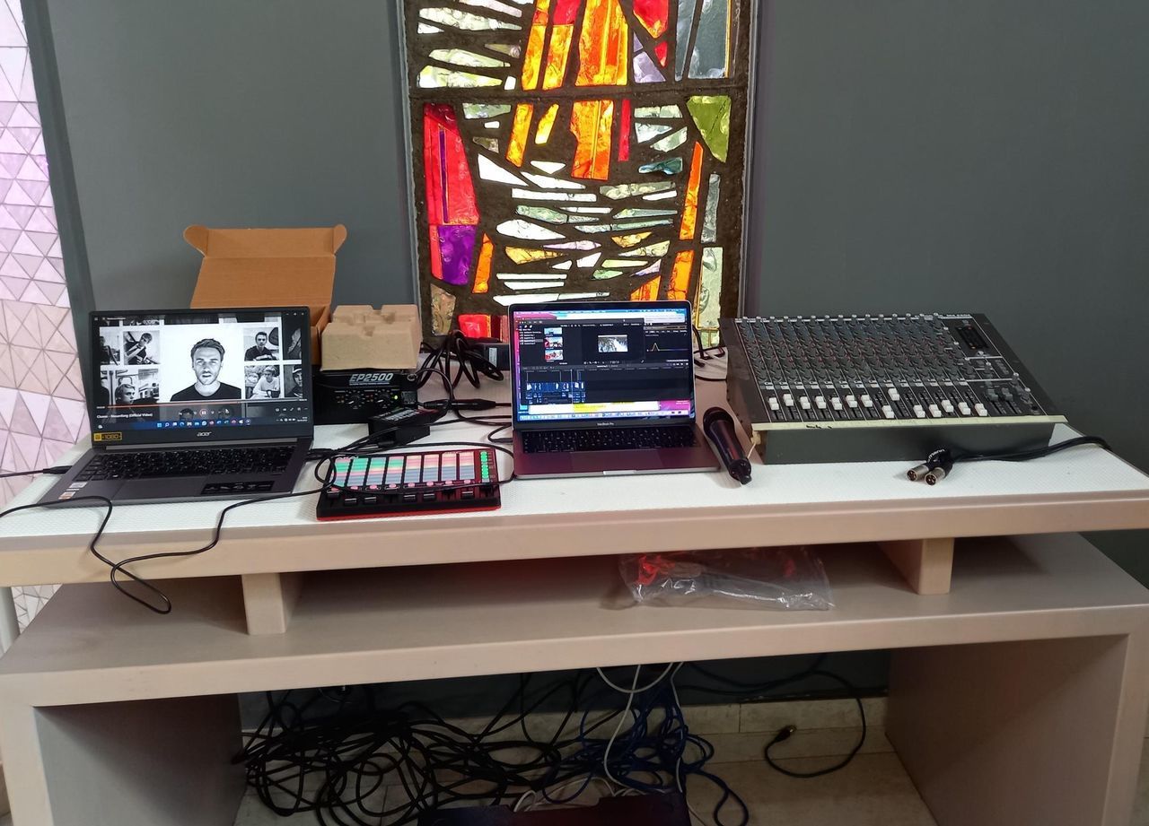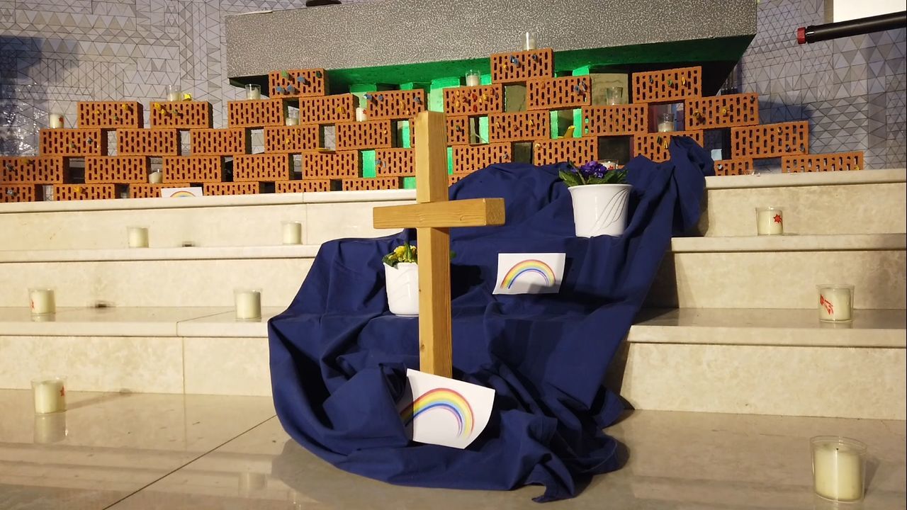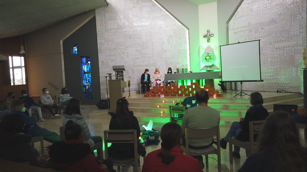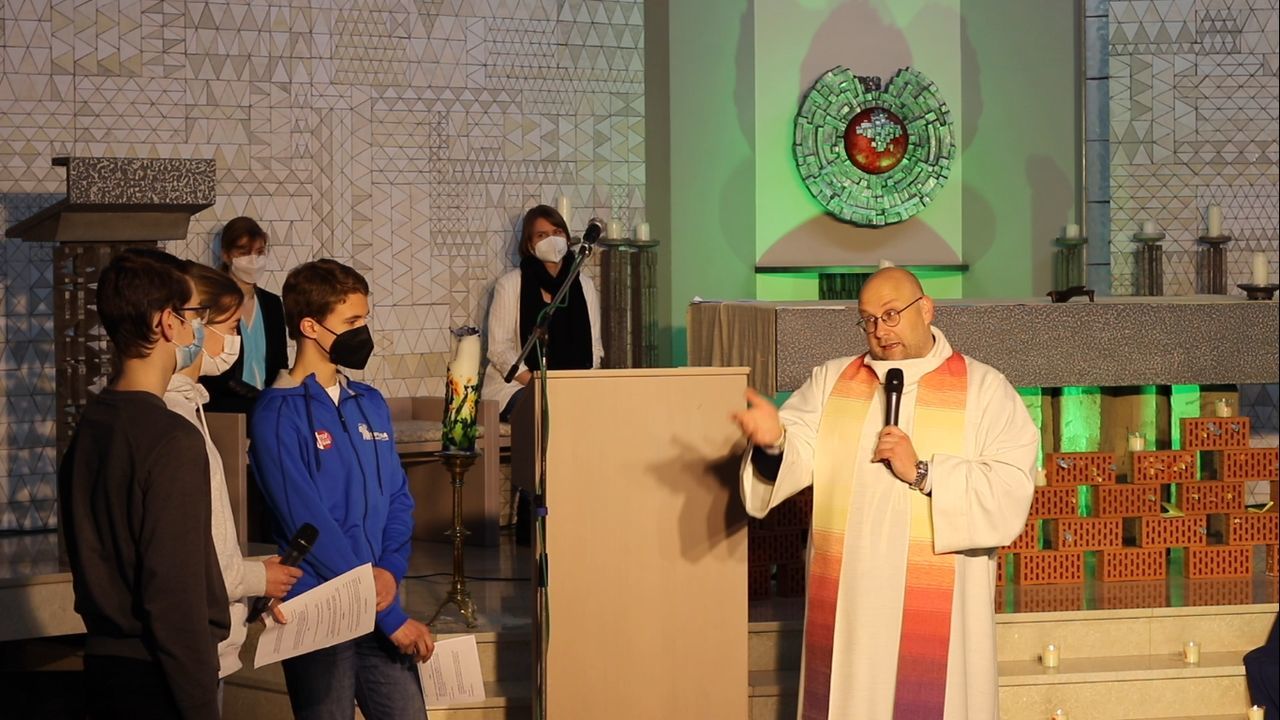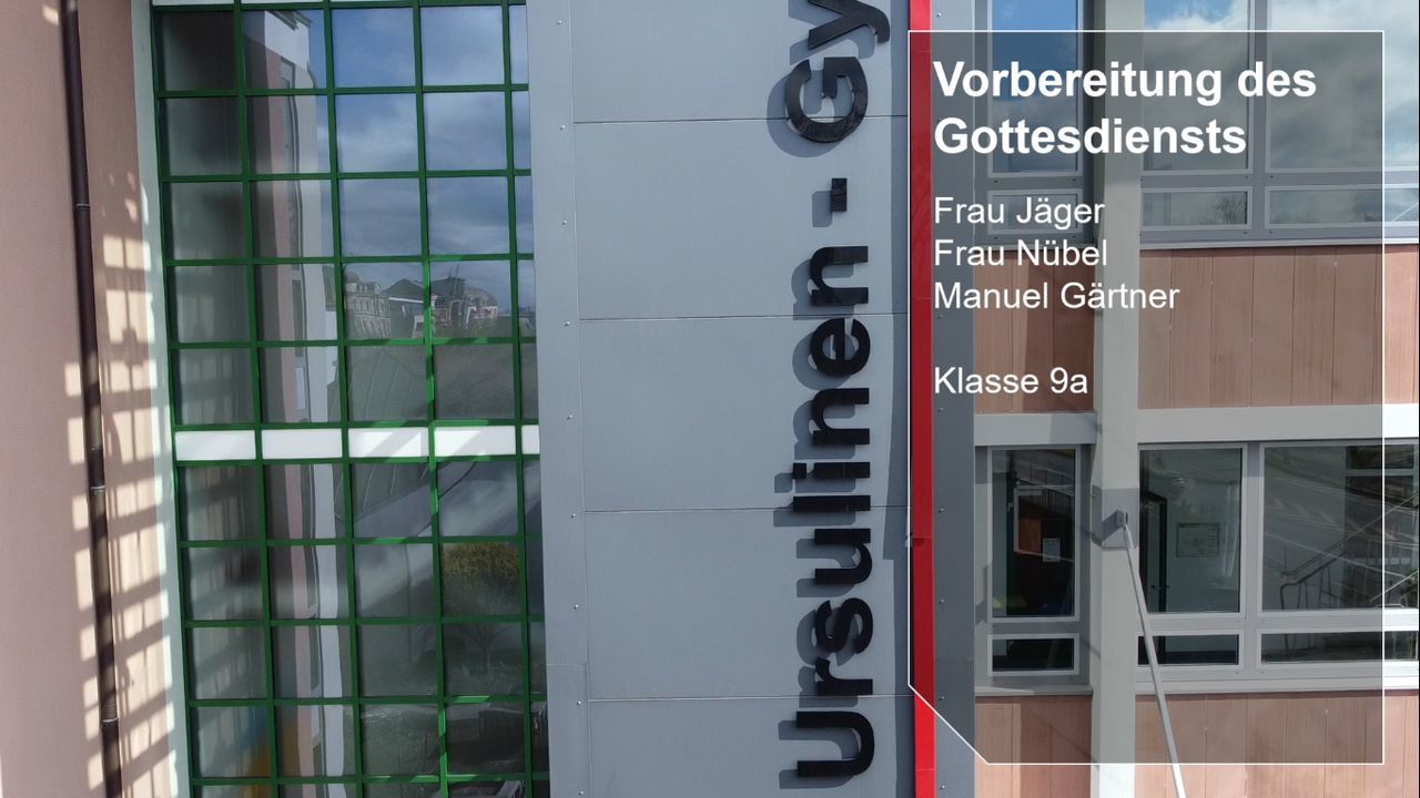 Gemeinsam mit den 9. Klassen feierte Jugendpfarrer Manuel Gärtner in der Kapelle des Ursulinen-Gymnasiums am Donnerstag, 07. April, einen vorösterlichen Gottesdienst. Er war von Klasse 9a, Frau Nübel und Frau Jäger vorbereitet worden. Die Technik-AG verwandelte dazu die Schulkapelle in ein Filmset und filmte den Gottesdienst mit drei Kameras - selbst ein Drohnenflug durfte nicht fehlen.Das Ergebnis konnte sich sehen und miterfahren lassen! Und zwar am letzten Schultag vor den Ferien für alle Klassen in den Klassenzimmern des Ursulinen-Gymnasiums. Um die frohe Botschaft des Gottesdienstes auch live in die Klassen zu tragen, brachten Schülerinnen und Schüler der 9. Klassen an geeigneter Stelle des Videos kleine Holzkreuze, welche der Jugendpfarrer im Gottesdienst gesegnet hatte, in die Klassenzimmer.