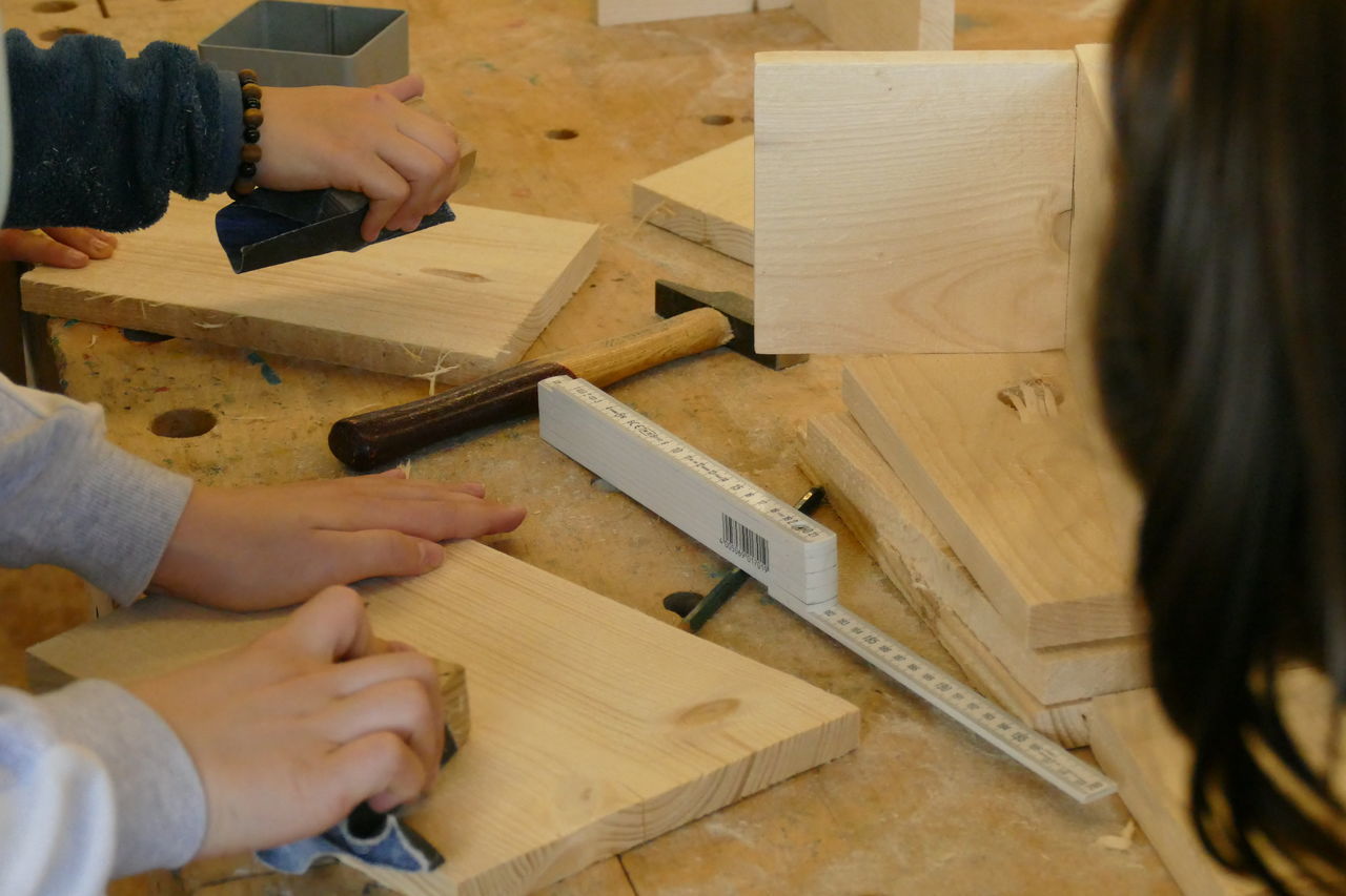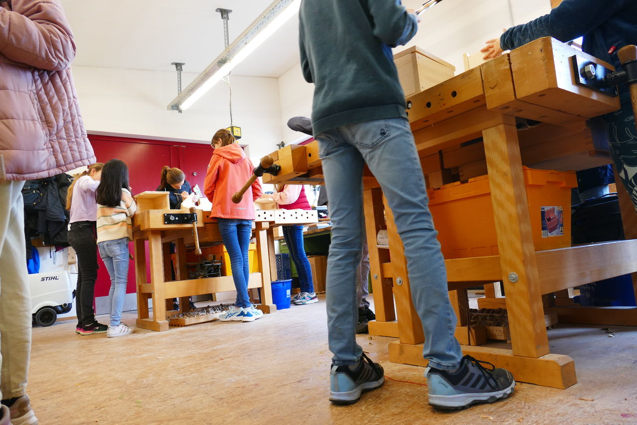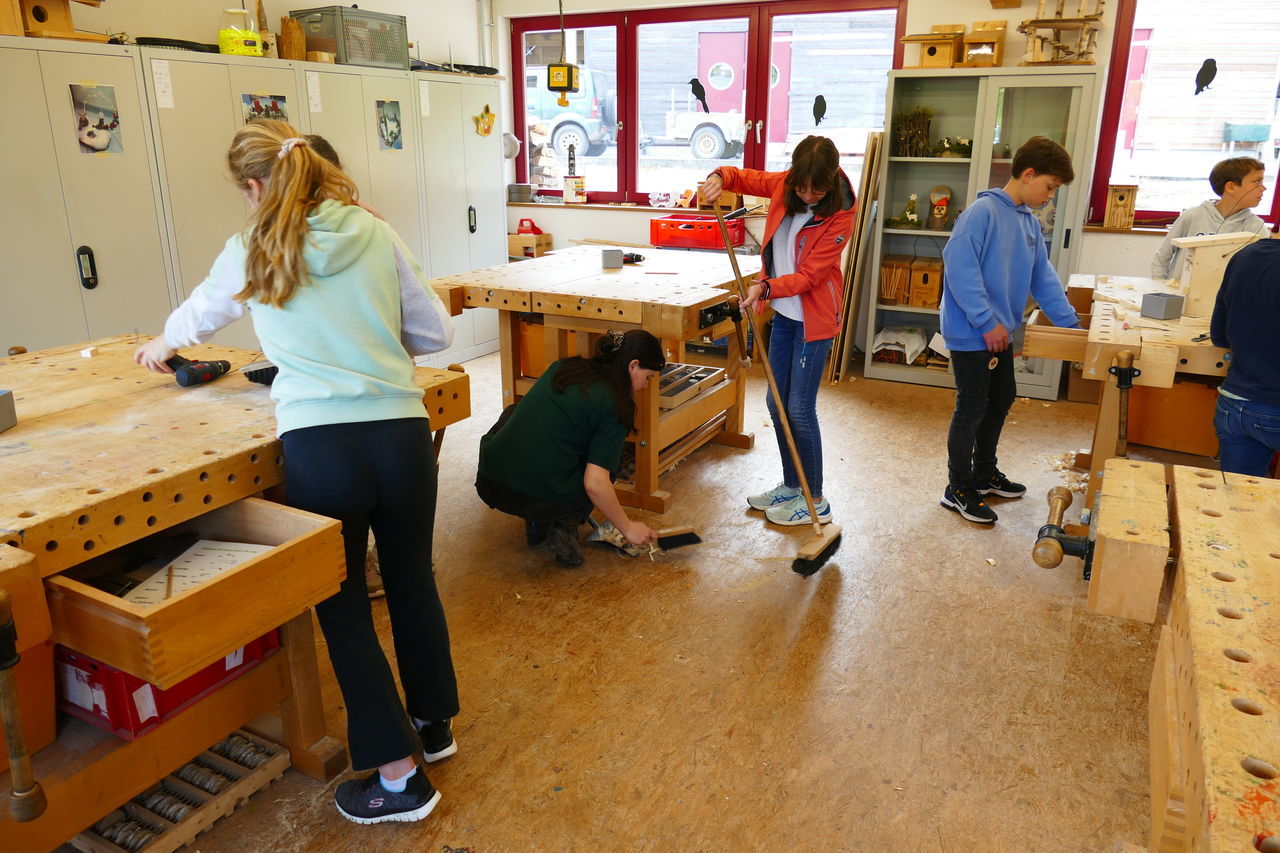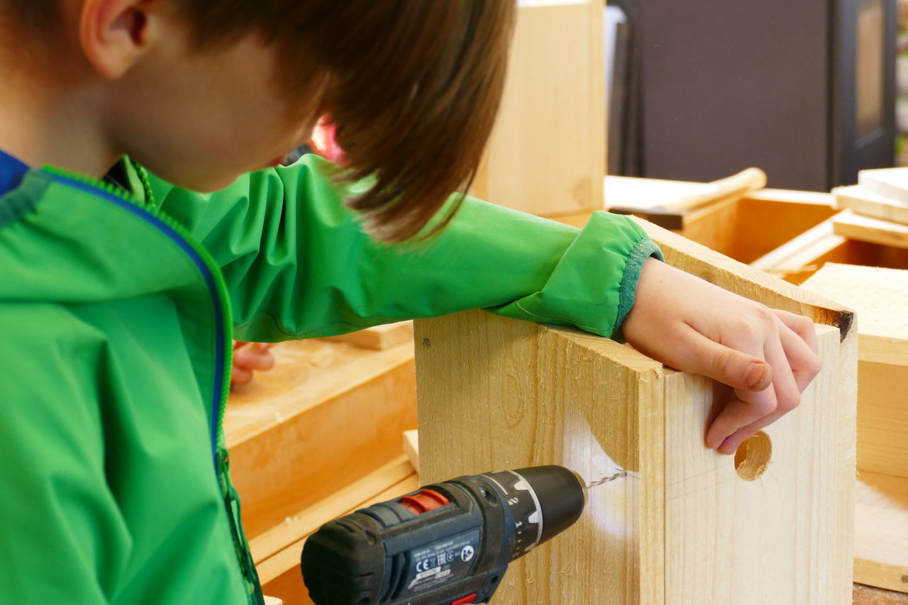 Mit neuer Energie starteten wir in den zweiten Tag. Nach dem Frühstück ging es ab in die Holzwerkstatt. Dort konnten wir unserer Kreativität freien Lauf lassen. Wir bauten unsere selbst entworfenen Nistkästen.