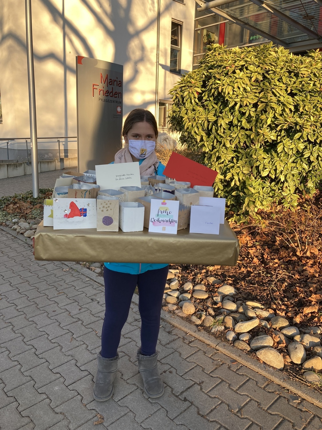 Wir Kinder haben gebastelt, unsere Eltern haben glücklicherweise fleißig gespendet und so konnten wir am 21. Dezember 40 Laternen und einige liebe Weihnachtsgrüße von uns Kindern an das Maria Frieden Pflegezentrum in der Neckarstadt-Ost überreichen. Bedingt durch Corona natürlich nur in sehr, sehr kleinem Rahmen und leider ohne persönlichen Kontakt zu den Bewohnern.