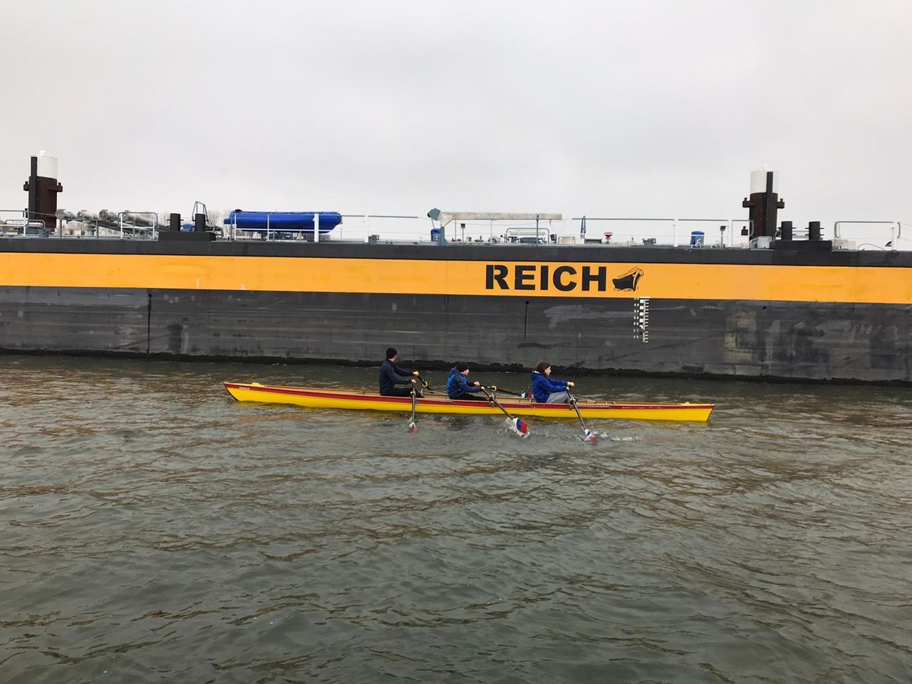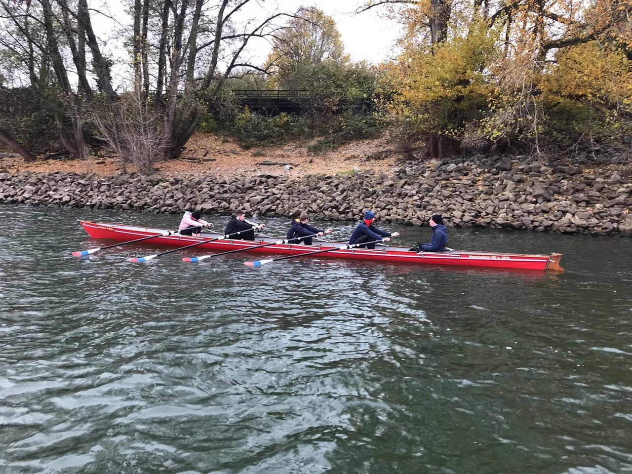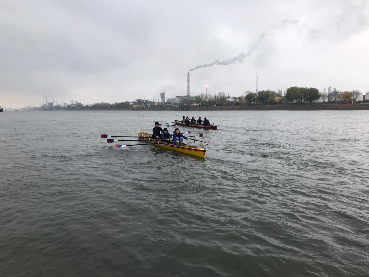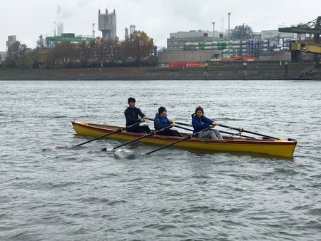 Am Samstag, 13. November 2021, machte sich eine Gruppe von fünf Jugendlichen der Ruder-AG mit Herrn Hanpft auf, den Altrhein und den Rhein mit ihren großen Frachtschiffen zu erkunden. Sehr beachtlich ist, dass die meisten Mitfahrer erst in diesem Schuljahr das Rudern erlernt haben und die knapp 15 Kilometer lange Strecke ohne große Pausen zurückgelegt werden konnte. Los ging es am Bootshaus des Mannheimer Ruderclubs auf der Friesenheimer Insel vorbei an der Diffenébrücke rheinabwärts bis zur Mündung des Mannheimer Altrheins. Danach wurde auf dem Rhein etwa einen Kilometer gegen die deutlich spürbare Strömung angerudert. Die Jugendlichen bekamen ein gutes Gefühl für die zusätzlichen Herausforderungen auf dem am meisten befahrenen Fluss Europas und waren beindruckt von den Dimensionen des BASF-Geländes und der hell leuchtenden Fackel der Chemiefabrik.