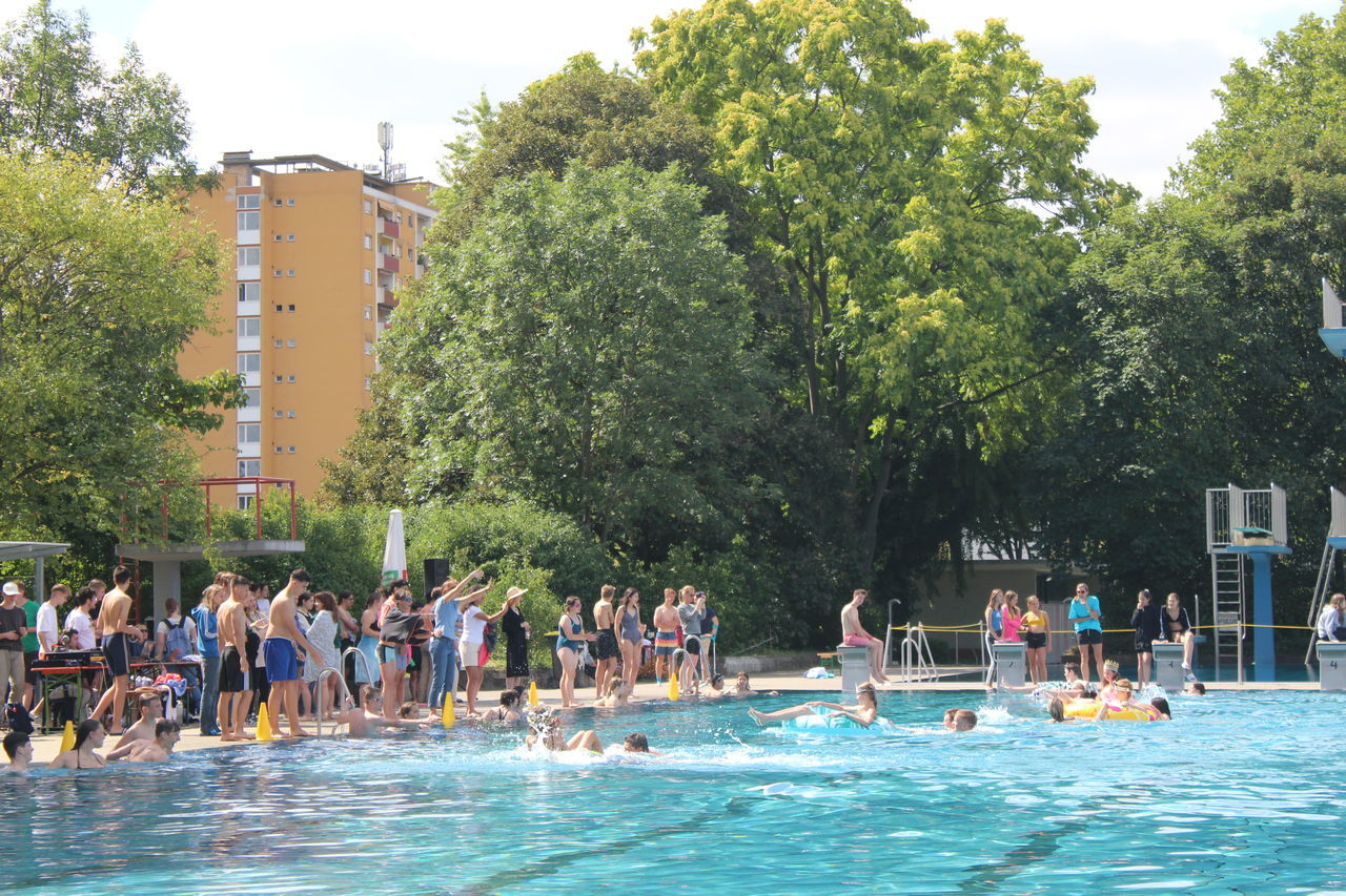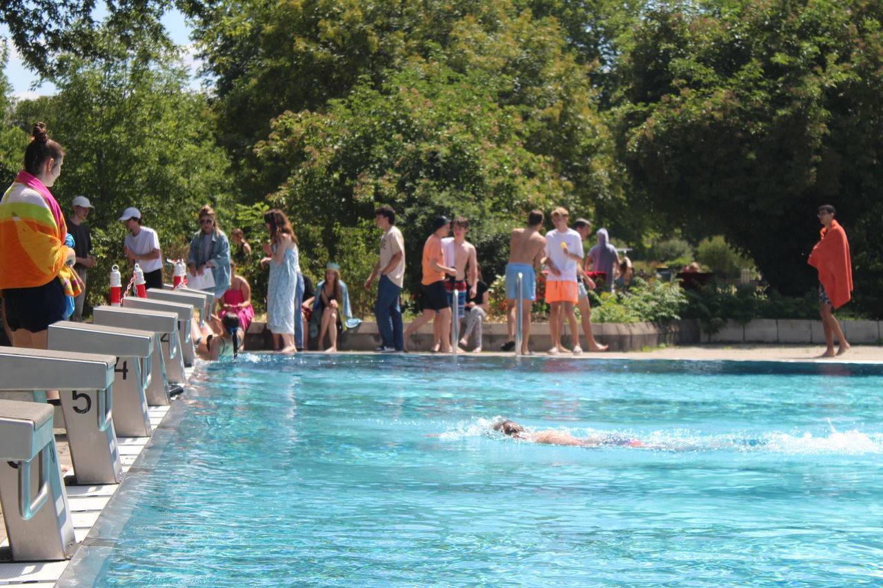 Nach drei Jahren ohne Schwimmfest konnte die Schulgemeinschaft endlich wieder einen schönen Schultag im Herzogenriedbad verbringen. Von den Sportlehrkräften organisiert und der passenden Musik der Technik-AG begleitet, war dies wie immer ein voller Erfolg. Mit einer neuen Disziplin und eindrucksvollen Künsten einiger Lehrkräfte im Volleyball sowie natürlich den gewohnten Schwimmwettbewerben stellte dieser Tag eine erfrischende Abwechslung vom Schulalltag dar.