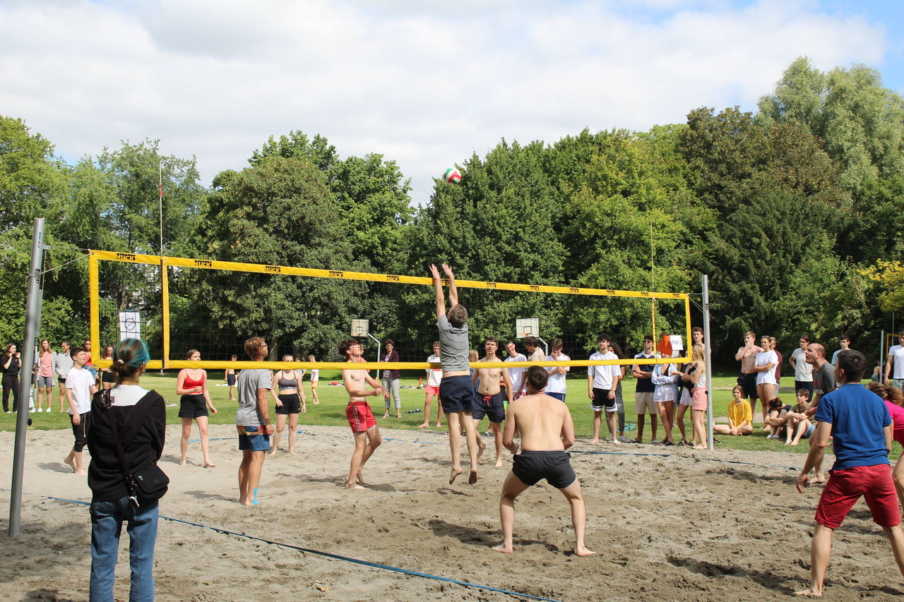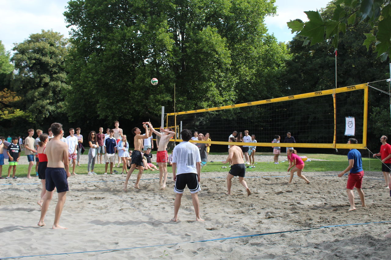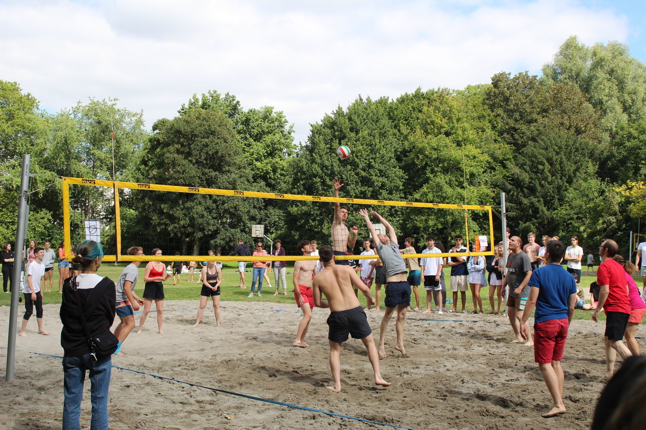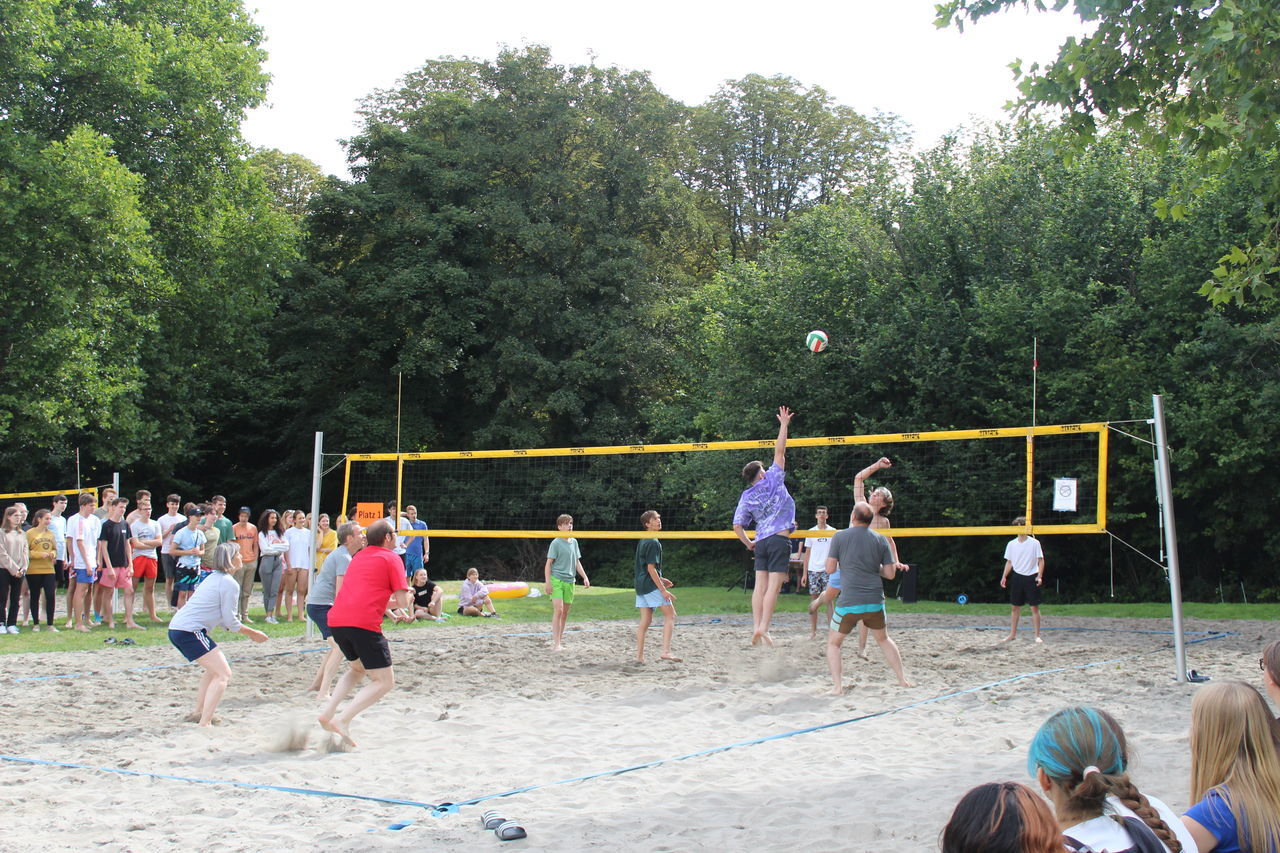 Parallel dazu fand das Beachvolleyballturnier der Klassen 8 bis 12 statt, dank der Organisation und Durchführung von Bastian Walter aus der Kursstufe 11. Alle Mannschaften bewiesen, so Herr Botsch, „beeindruckenden Körpereinsatz und Hingabe“, wobei die Krönung und ein großer Spaß das Spiel des Gewinnerteams gegen das Lehrerteam war, bei dem letztere nur ganz knapp gewannen.
