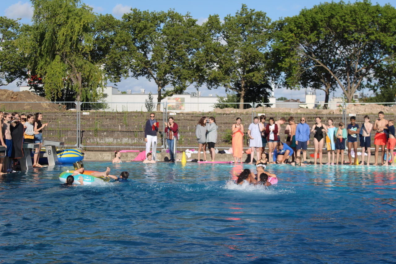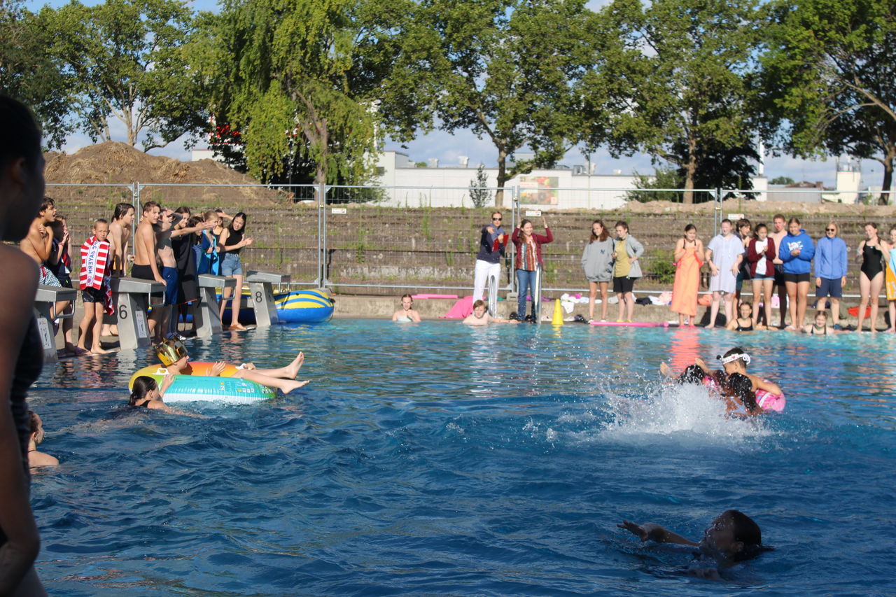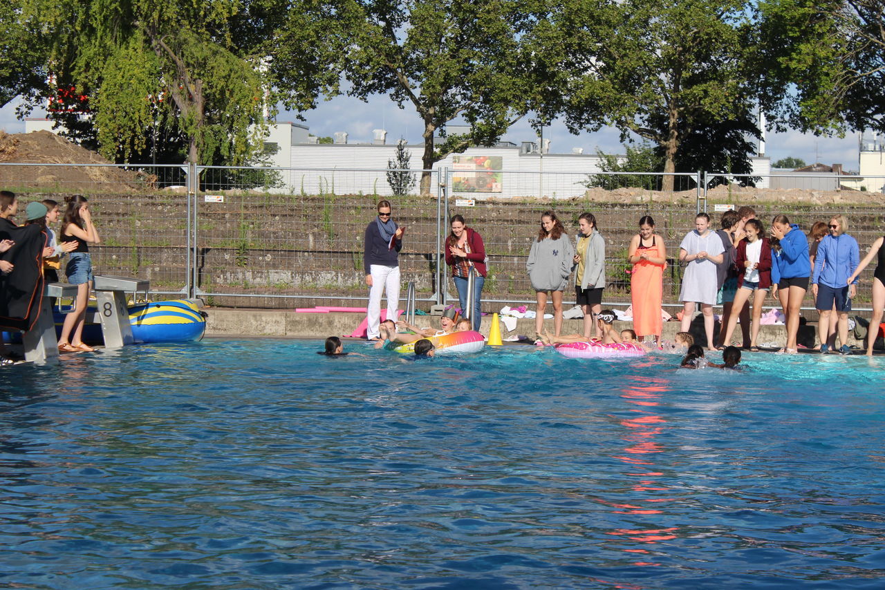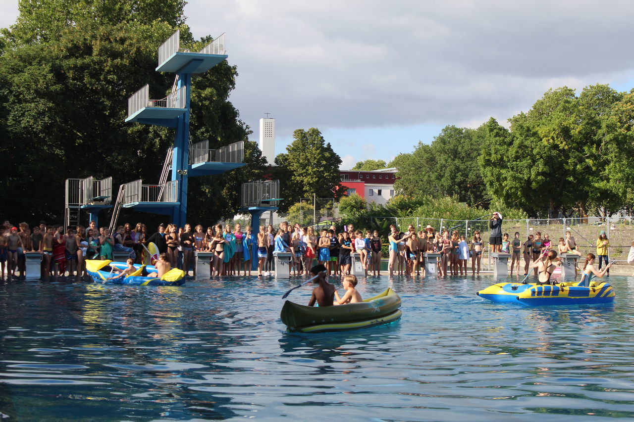 Startschuss war um 8:30 Uhr mit dem Unterstufenwettbewerb. Die Schülerinnen und Schüler konnten bei der Poolnudel-, Schlauchboot-, Freistil- und der Königstransportstaffel, bei dem eine Person aus der Klasse in einem Schwimmring sitzt und von den Klassenkameraden von einer Seite des Beckens zur anderen transportiert werden muss, enthusiastisch wetteifern.