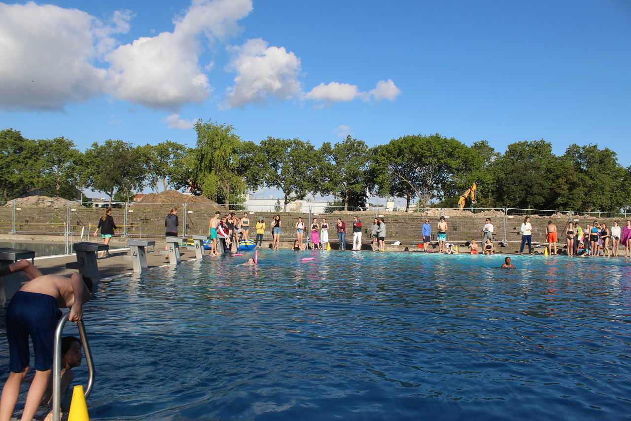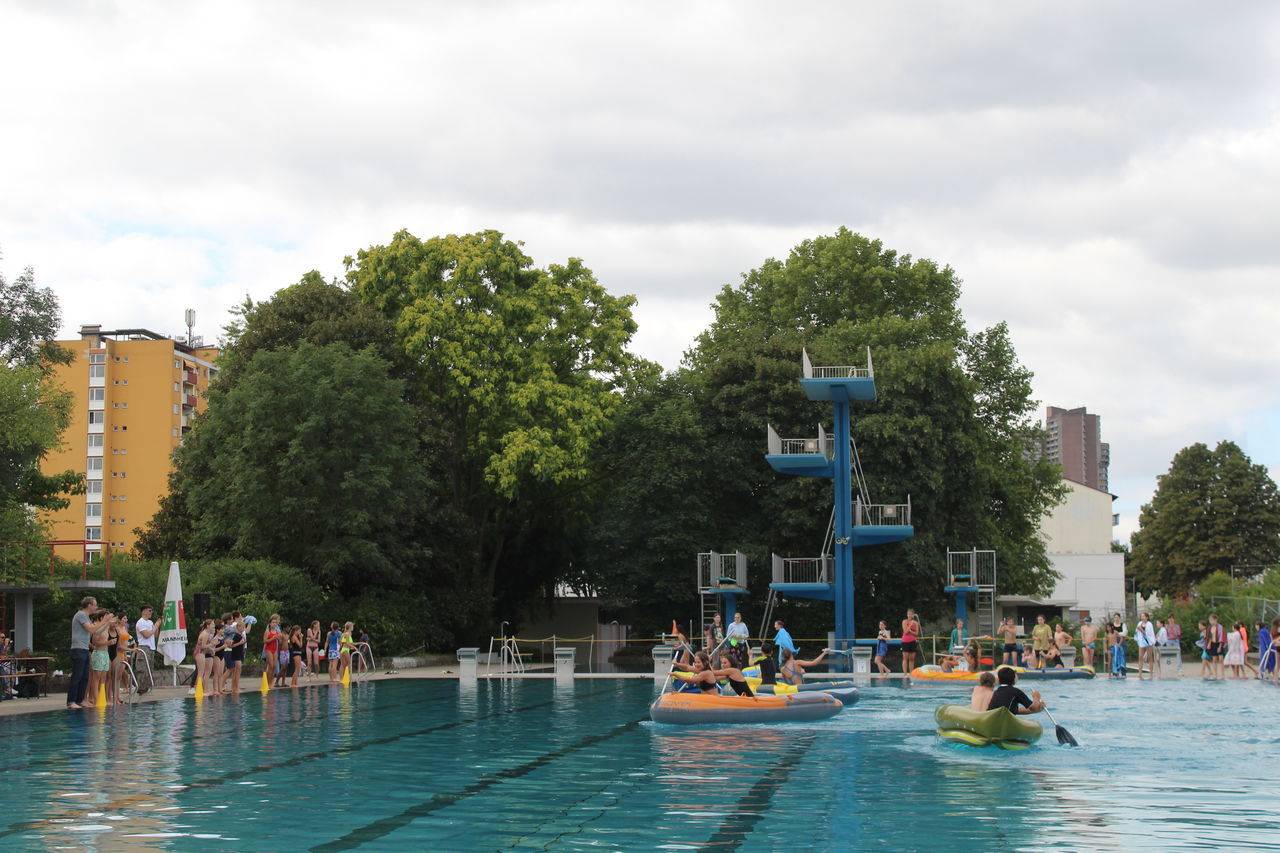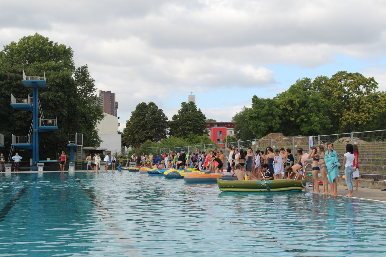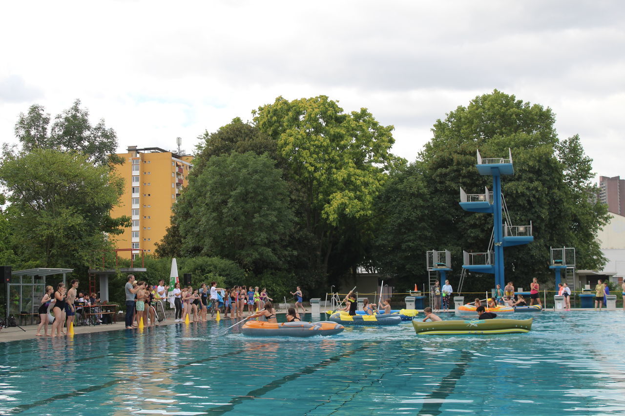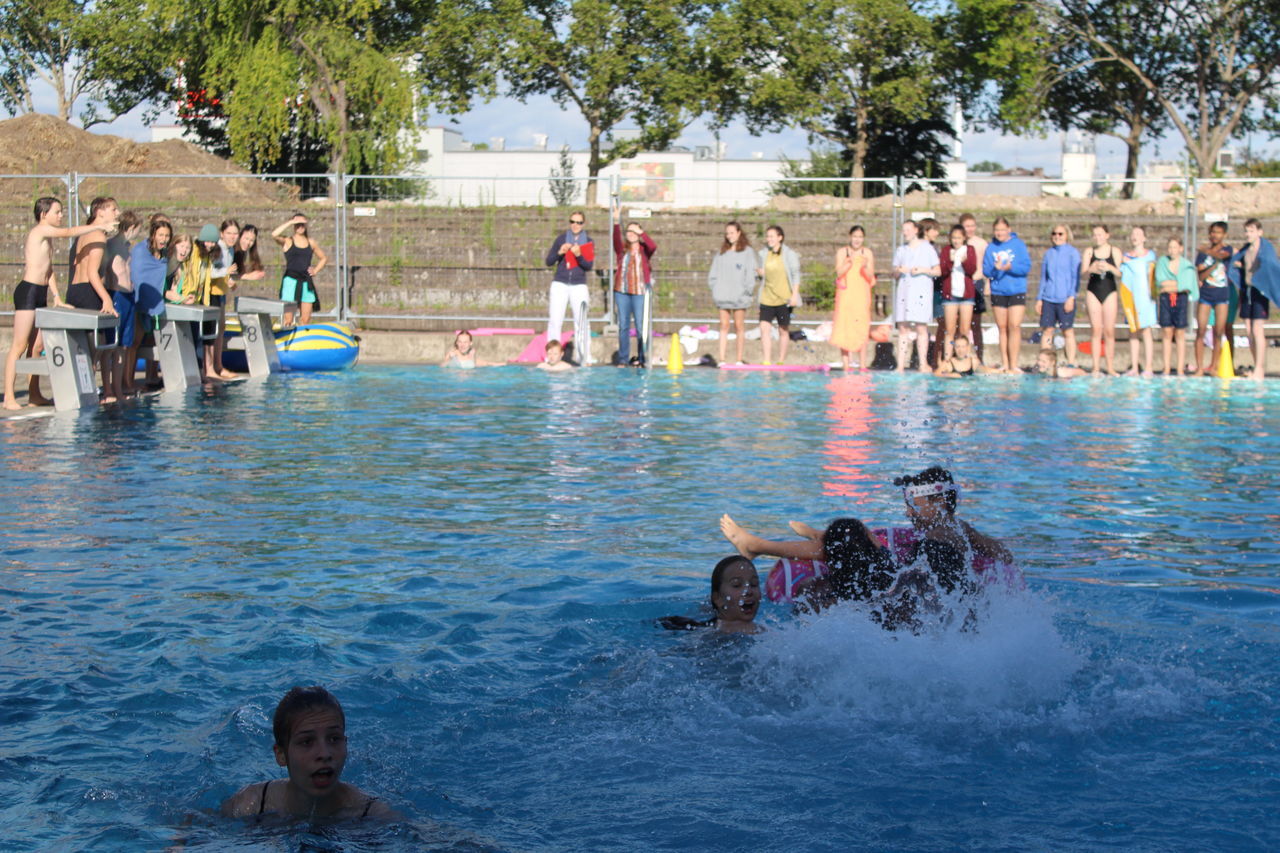 Startschuss war um 8:30 Uhr mit dem Unterstufenwettbewerb. Die Schülerinnen und Schüler konnten bei der Poolnudel-, Schlauchboot-, Freistil- und der Königstransportstaffel, bei dem eine Person aus der Klasse in einem Schwimmring sitzt und von den Klassenkameraden von einer Seite des Beckens zur anderen transportiert werden muss, enthusiastisch wetteifern.