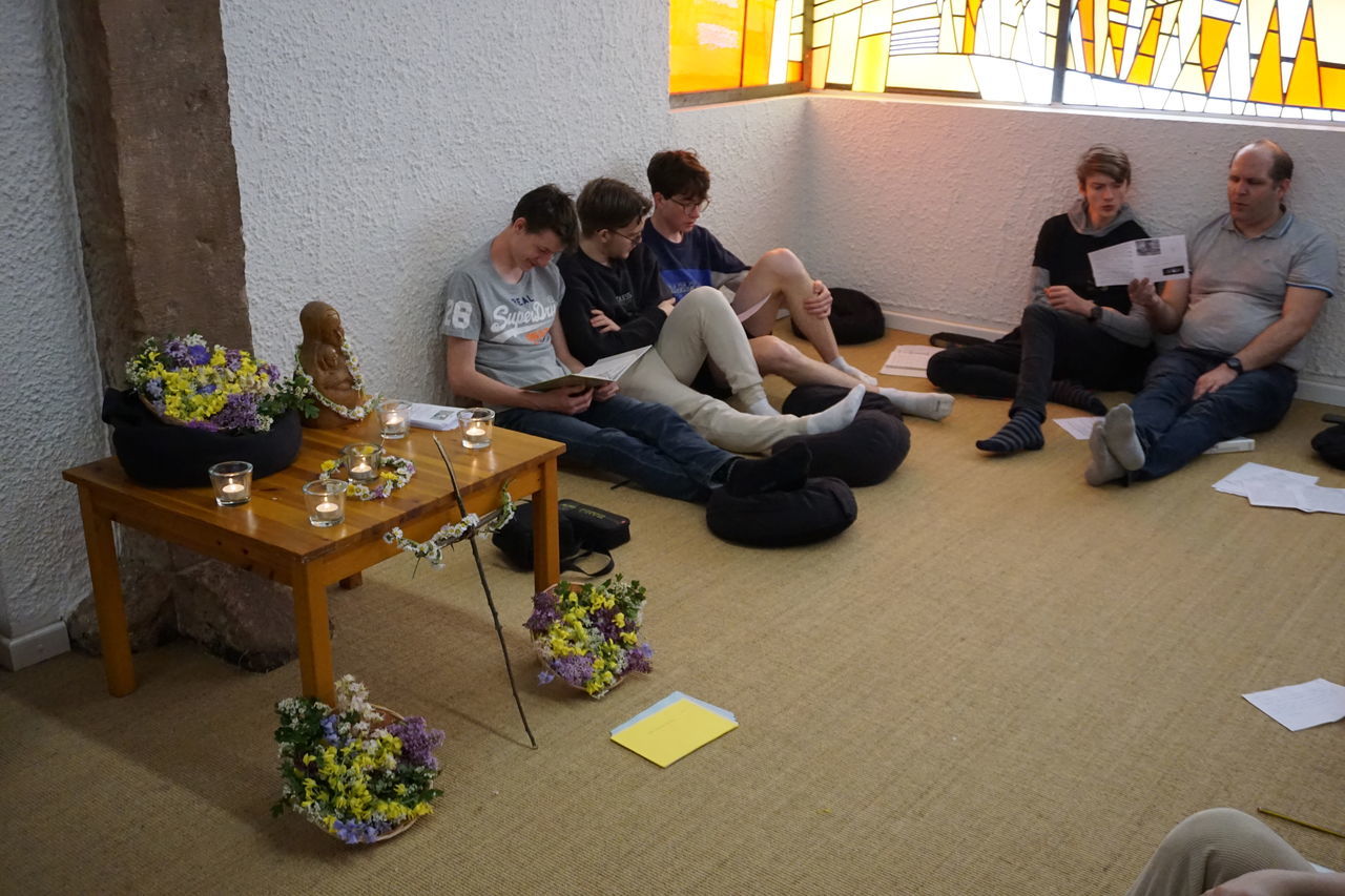 Ausgestattet mit einem Umschlag mit tiefgründigeren Fragen („Gesprächsstoff“) brachen wir als Kleingruppen zu einem längeren Spaziergang auf. Danach traf man sich in zwei Großgruppen zu einer Nachbesprechung. Besonders die provokante Frage nach der Natur des Menschen: „Ist der Mensch von Grund auf böse oder gut?“, löste bei einer der beiden Gruppen eine hitzige Diskussion aus, bei der Schlagworte wie Sozialsystem, Kapitalismus, Egoismus und Erziehung fielen. Am Abend wurde im idyllischen Hof des Jugendhauses gemeinsam gegrillt und danach hieß es wieder Freizeit.