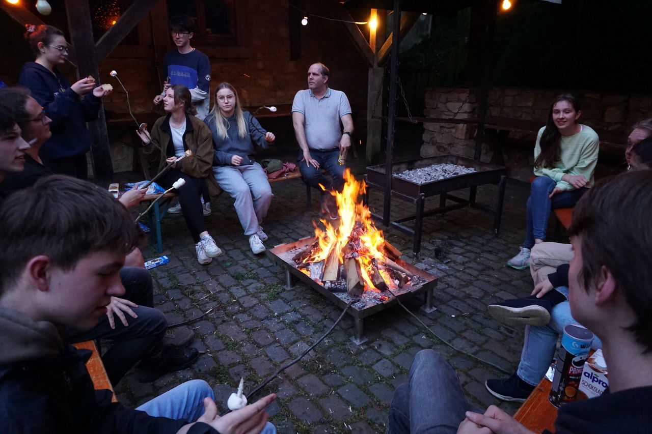 Die Freizeit wurde auf unterschiedlichste Weise genutzt. Ein Angebot bestand darin, am Lagerfeuer die gemeinsame Zeit mit „S‘Mores“ zu genießen. Offiziell abgeschlossen wurde der Abend mit einer besinnlichen Andacht am Lagerfeuer. In einem Bibliolog erfuhren wir, dass die Zweifel im Glauben, die der Prophet Elija empfand, von unseren Erfahrungen und Gefühlen gar nicht so weit entfernt liegen. Zum Abschluss bildeten wir ein Lichtermeer am Lagerfeuer und teilten uns gegenseitig unseren „Lichtmoment des Tages“ mit. Spätestens jetzt setzte die besinnliche Atmosphäre ein und unter vielen ein wohliges Gefühl der Gemeinschaft, bevor die Nachtruhe um 00:00 Uhr begann.