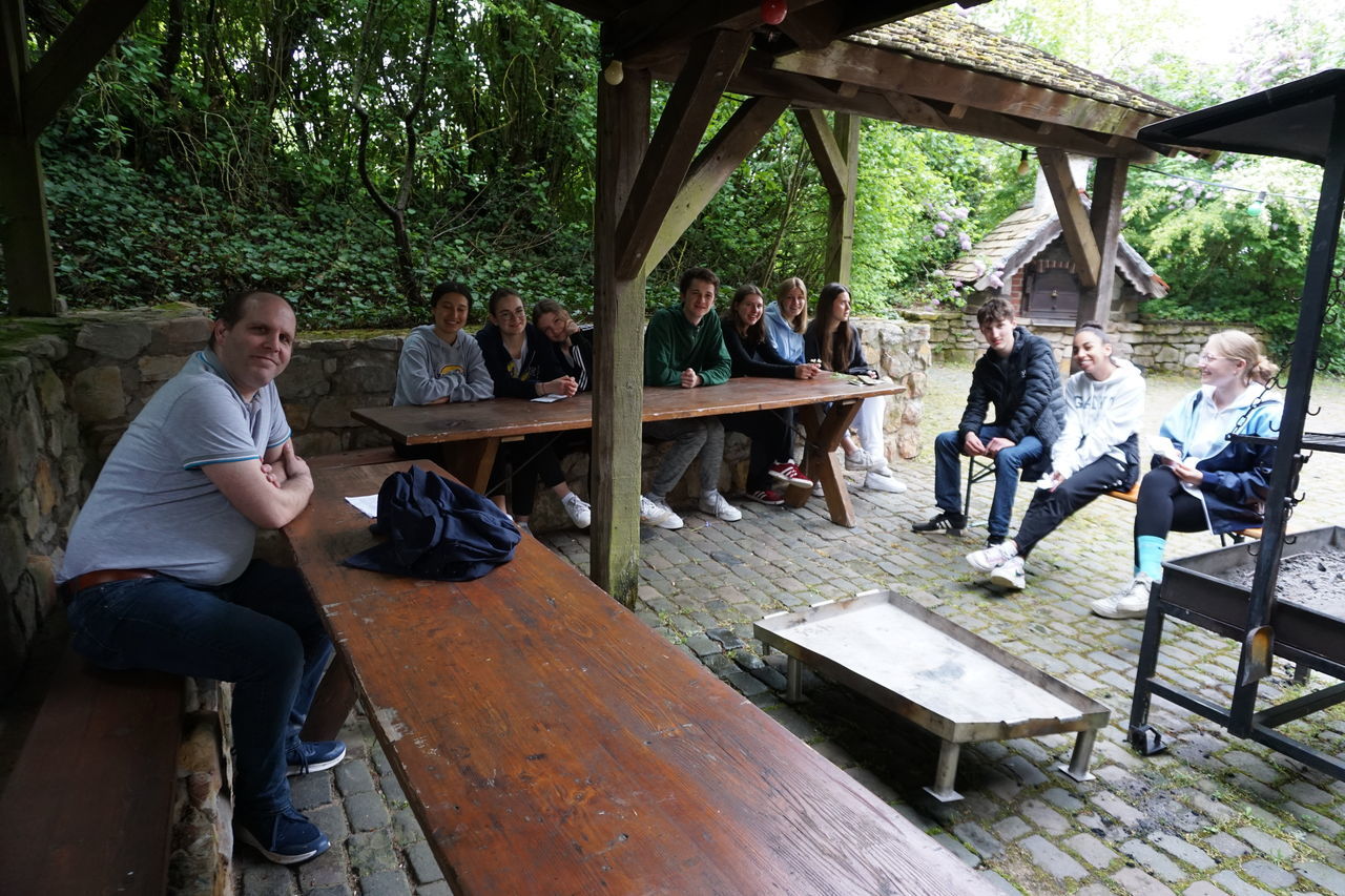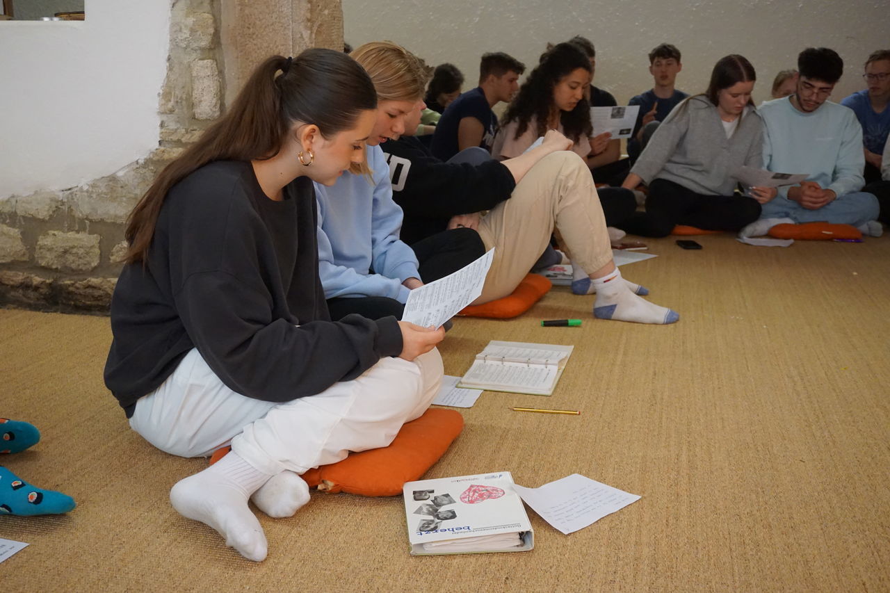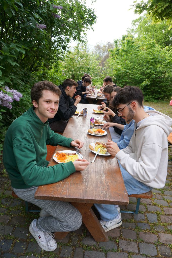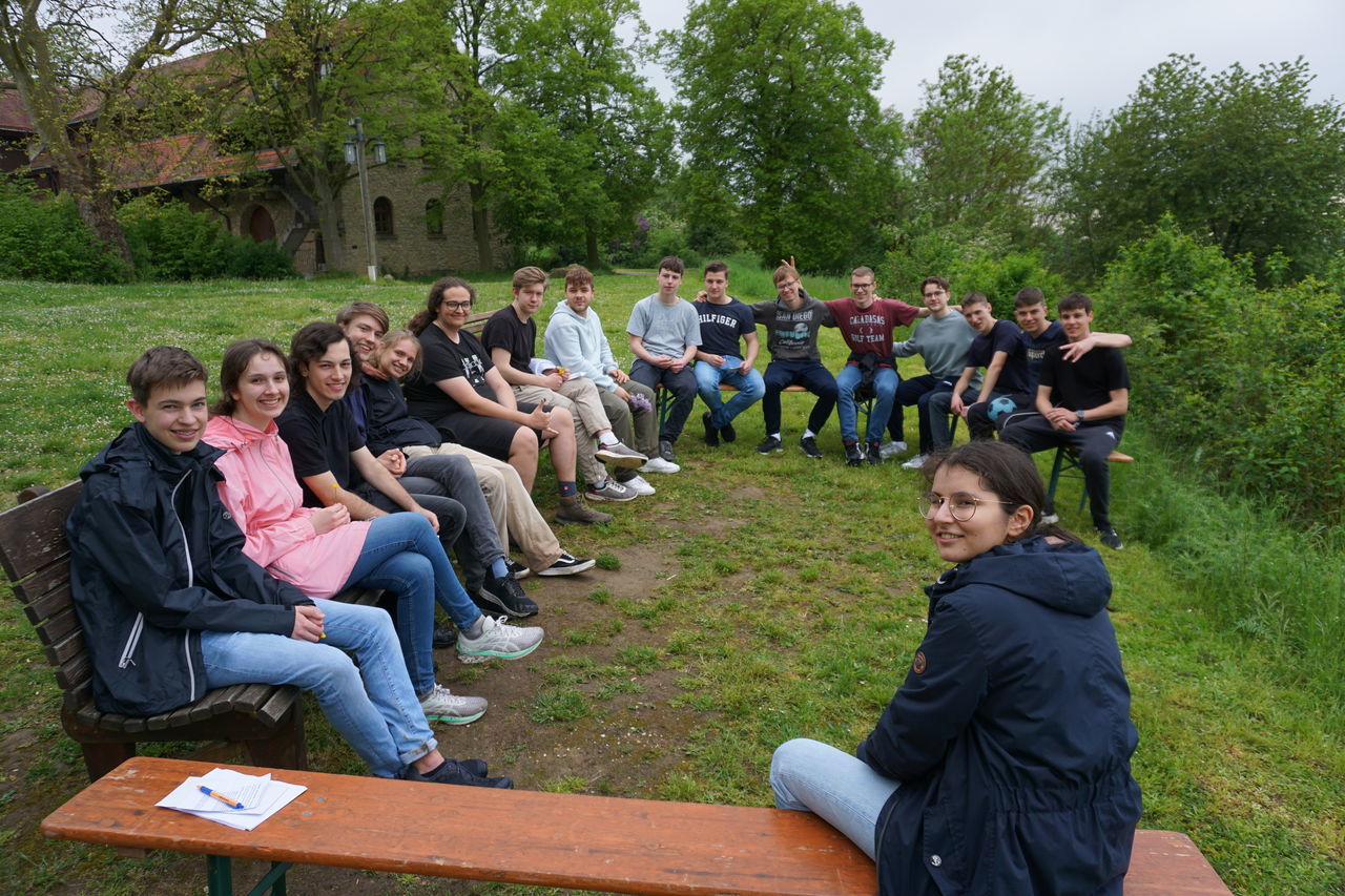 Nach der stressigen Zeit der schriftlichen Abiturprüfungen bekam die KS2 gleich die Möglichkeit auf eine zweitägige Stufenfahrt zur Entspannung und Reflektion zu fahren. Der kleine Trip startete am Montag, den 8. Mai, mit 36 Schülerinnen und Schülern in Begleitung von Herr Botsch und Frau Janicka. Frau Janicka beendet dieses Schuljahr ihre zweijährige Weiterbildung zur Schulseelsorgerin. Die Planung und Durchführung der Besinnungsfahrt stellte dabei ihr Abschlussprojekt dar. Nach einer 45-minütigen Wanderung bergauf bei leichtem Regen waren wir an unserem Zielort, dem Jugendhaus des Klosters Jakobsberg, angekommen. Es gab direkt nach unserer Ankunft bereits ein Mittagessen und für besonders Hungrige Nachschlag in Form einer riesigen Wanne Käsespätzle. Nach einer Mittagspause begann das Programm. Es gab ein kleines Warm-up-Spiel und wir bildeten danach 3er und 4er-Gruppen.