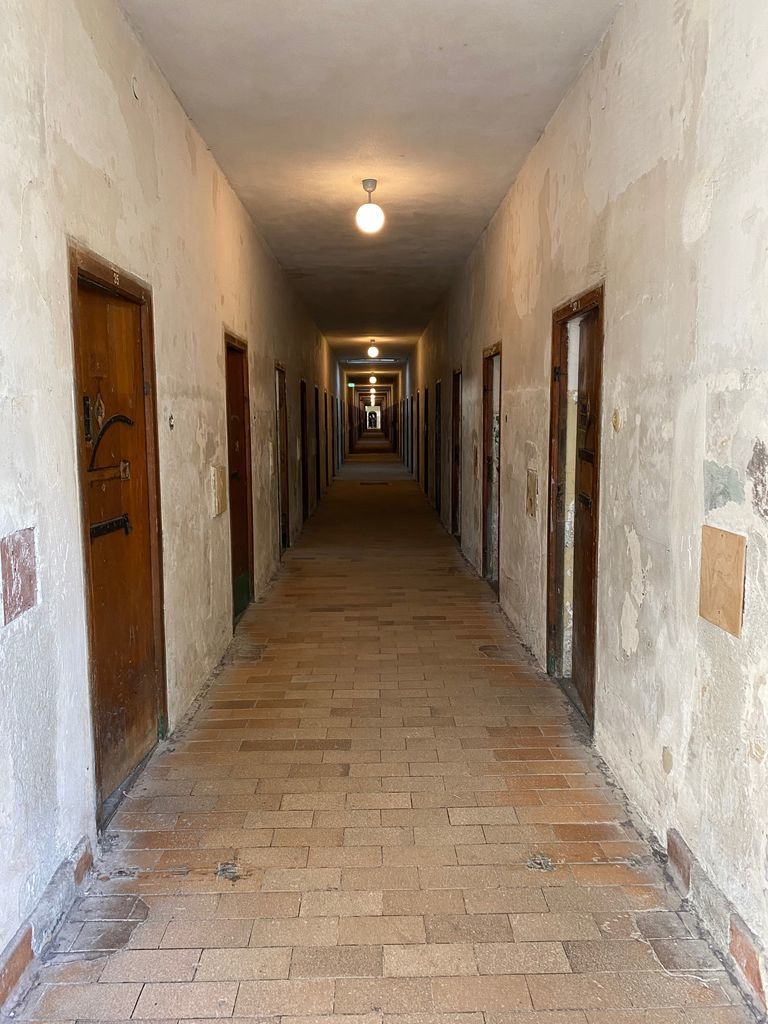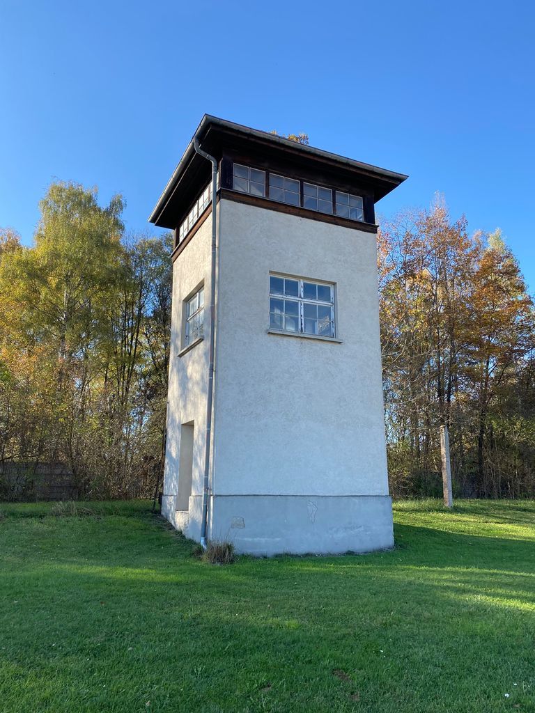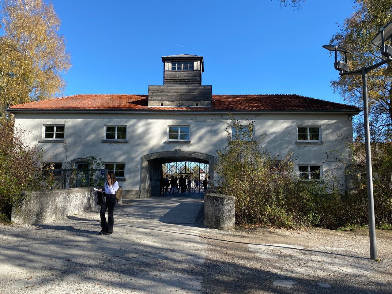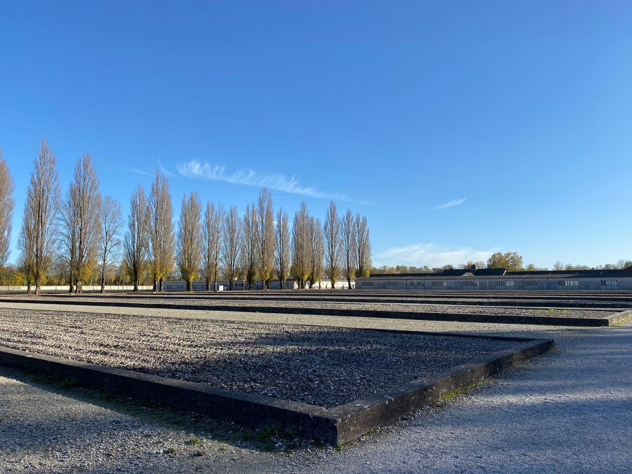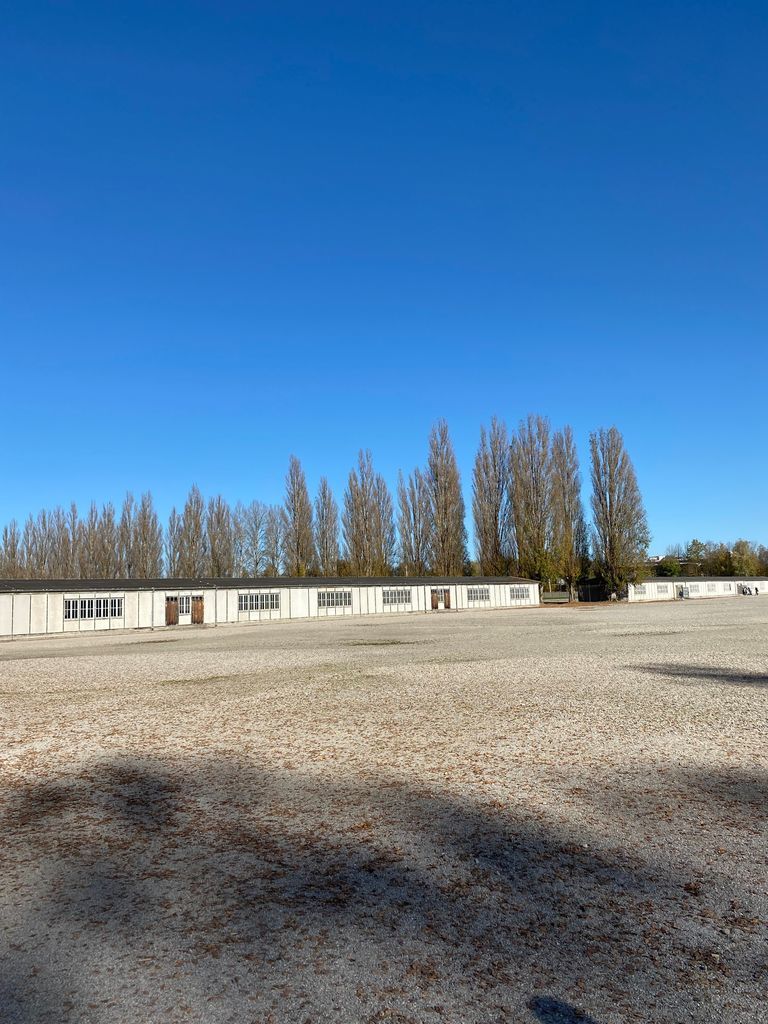 Nach dem langen und auch etwas nervenzehrenden Anreisetag ohne morgendliches Frühstück freuten wir uns alle sehr auf ein erstes leckeres Frühstück im Max-Mannheimer- Haus. Wir wurden gut versorgt, und so fand jeder etwas Geeignetes am Buffet. Die am Vortag eingeteilten Gruppen waren nun ja unsere Arbeitsgruppen für die nächste Zeit und so trafen wir uns nach Frühstück und Co. mit unseren jeweiligen Gruppierungen wieder. Jede Gruppe gestaltete ihren Inhalt zwar etwas anders, aber trotzdem durchliefen wir im Prinzip den gleichen Ablauf. Für meine Gruppe ging es am Morgen zur KZ-Gedenkstätte. Bereits auf dem Weg dorthin sah und erahnte man das ehemalige KZ bzw. NS-Gelände. An der Gedenkstätte angekommen, passierten wir das bekannte Eisentor mit der Aufschrift ,,Arbeit macht frei“. Von dort blickte man auf einen langgezogenen Schotterplatz. Zur linken zog sich ein langer Zaun mit einem Wachturm, auf der anderen Seite das gleiche, obwohl sich dort auch noch ein Haus befand, das zum Museum umgewandelt worden war.