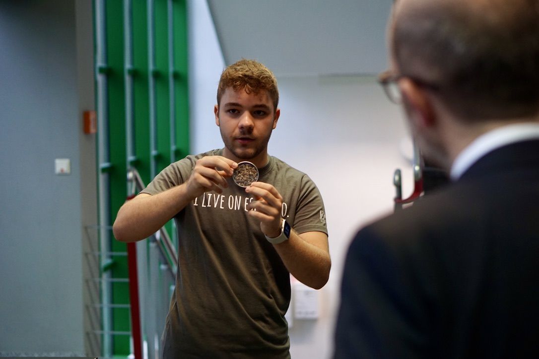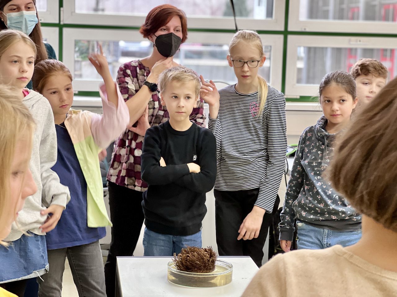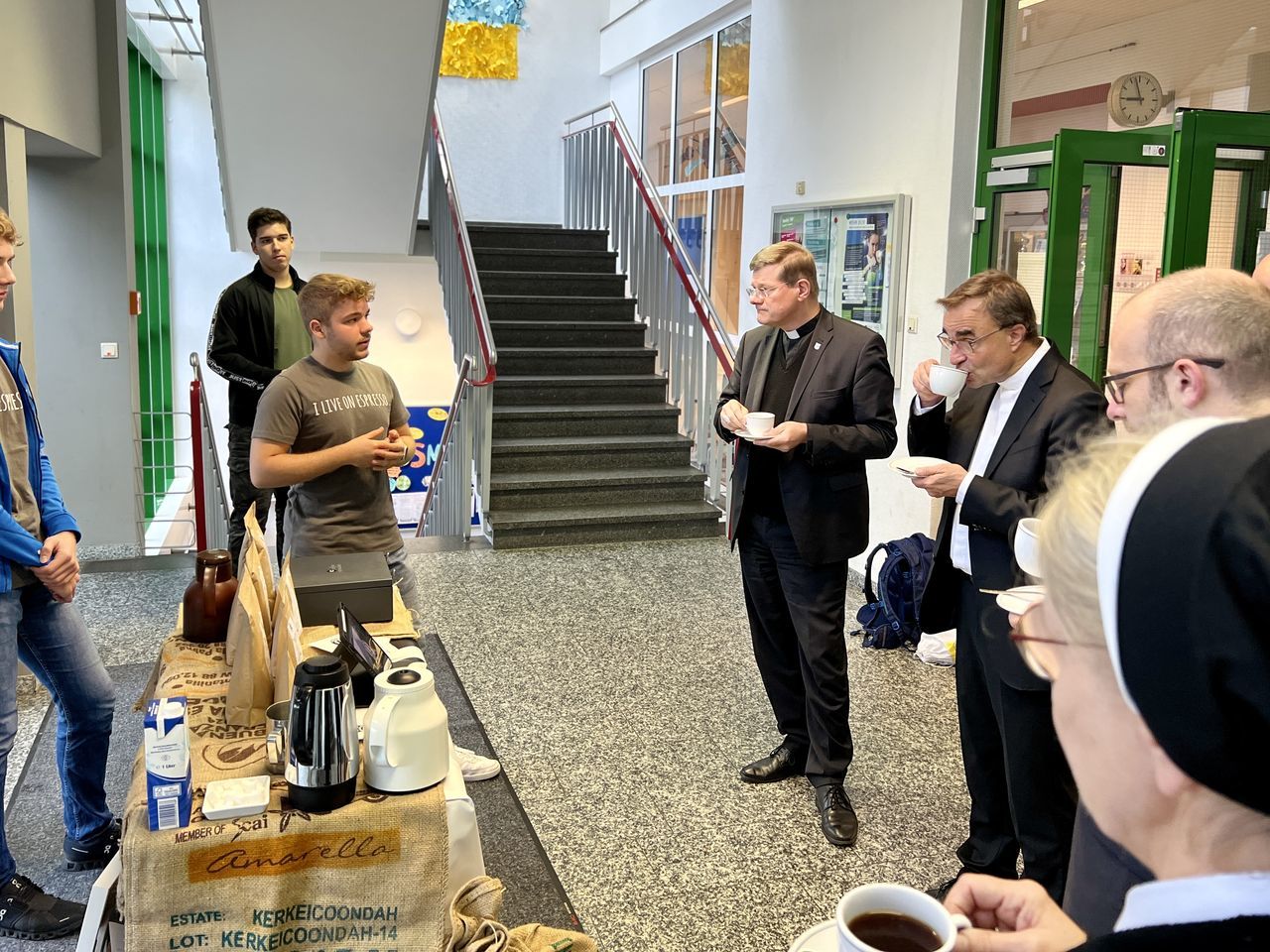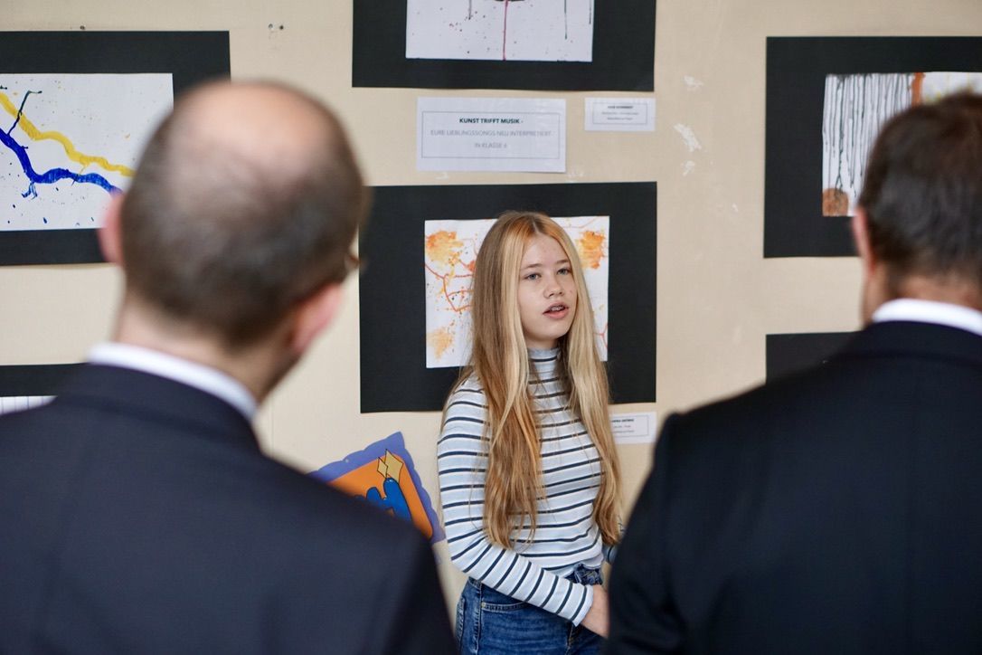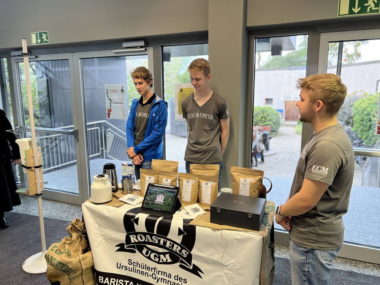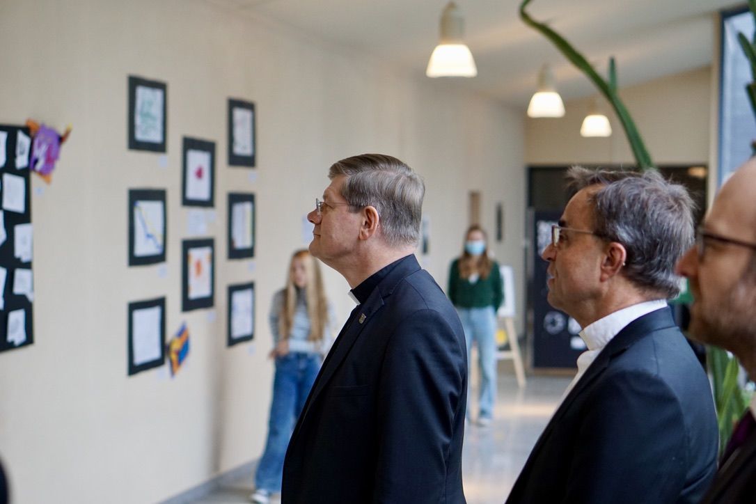 Anlässlich des 75. Geburtstags des Ursulinen-Gymnasiums erhielt die Schulgemeinschaft am 19. Oktober 2022 hohen Besuch. Bevor der Festgottesdienst zum Gedenken an die Heilige Ursula gefeiert wurde, konnten Erzbischof Stephan Burger, Dekan Karl Jung und Stiftungsdirektor Partrick Krug, begleitet von der Ursulinenschwester Regina Hunder, das vielfältige Schulleben des Ursulinen-Gymnasiums kennenlernen. Zu Beginn besuchten sie die Kunstausstellung mit dem treffenden Titel "Begegnungen" im Kapellengang. Diese vereinte Kunstwerke von Schülerinnen und Schülern, die von Zeichnung, Druckgrafik, Tonarbeiten, Malerei auf Leinwand bis hin zu Upcycling-Projekten reichten. Dabei hatten die Künstlerinnen und Künstler selbst Gelegenheit ins Gespräch mit den Besuchern zu treten und ihnen den Arbeitsprozess sowie ihre Intentionen in Bezug auf ihr persönliches Kunstwerk näher zu bringen. Die Schülerfirma "UGM CoffeeRoasters" sorgte am frühen Morgen für eine leckere Tasse Kaffee, während sie ihre Firma vorstellte, sodass die Besucher gestärkt in den Unterricht von drei verschiedenen Klassen gehen durften, wo sie das Aufblühen der Rose von Jericho im BNT-Unterricht beobachten konnten, im Mathematikunterricht einen kniffligen Zaubertrick entschlüsselten und die Aktualität lateinischer Texte überprüften.