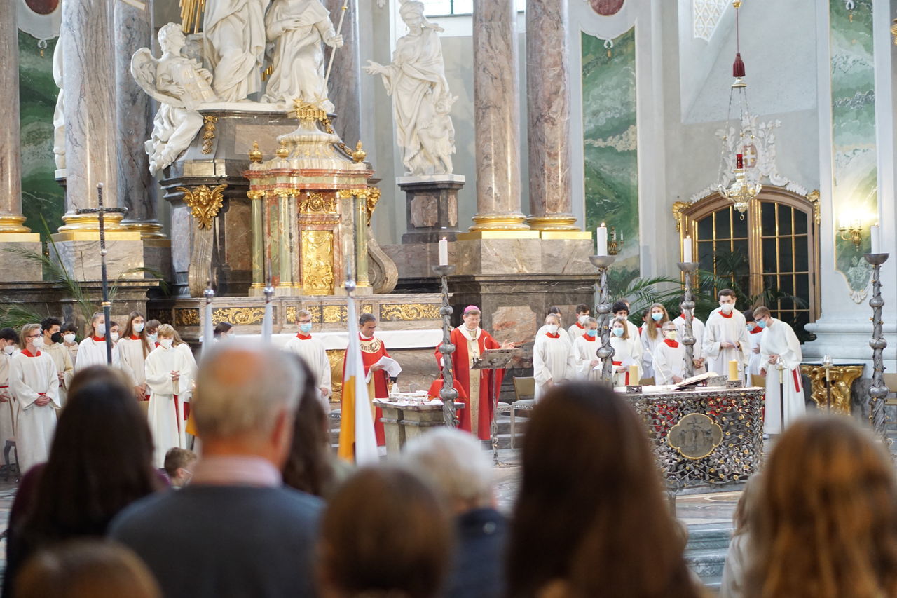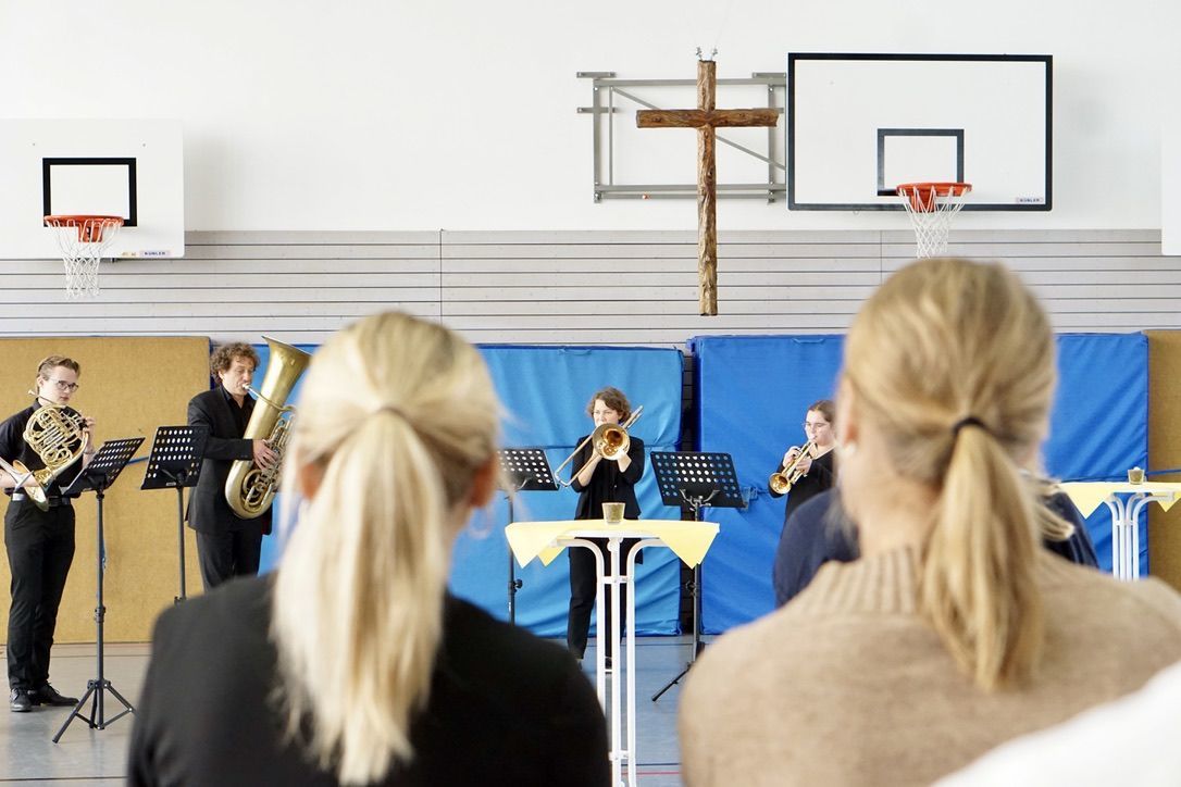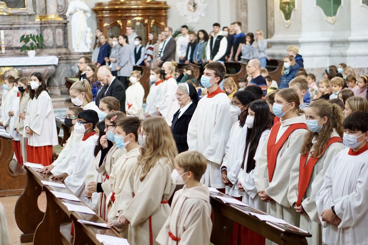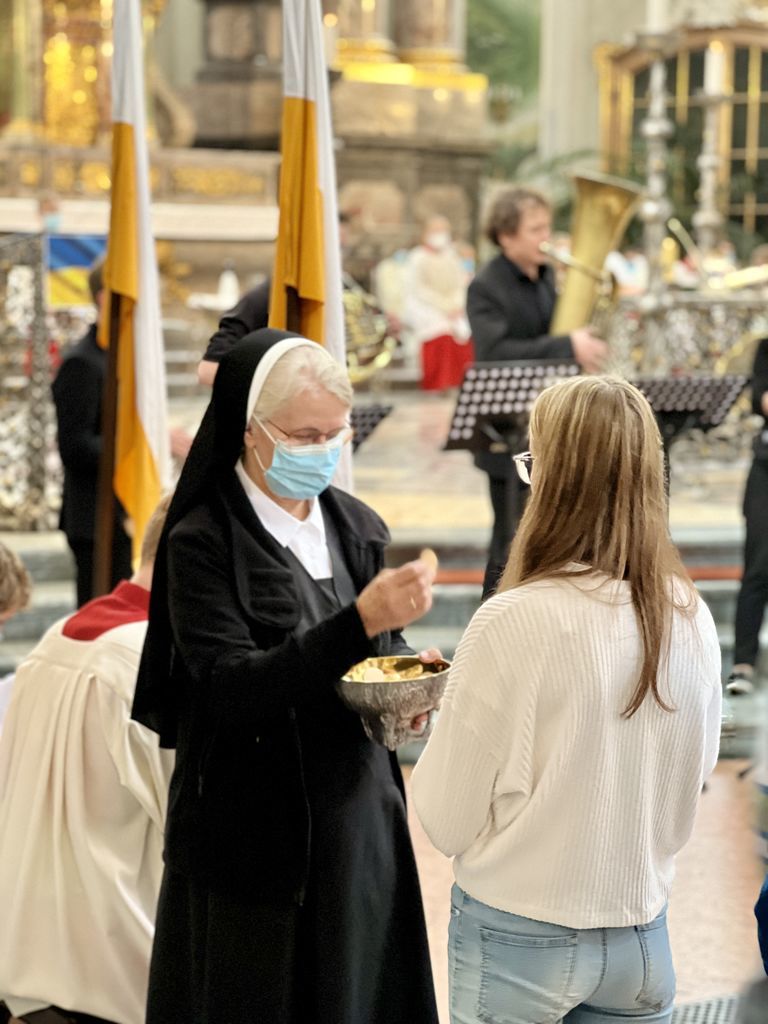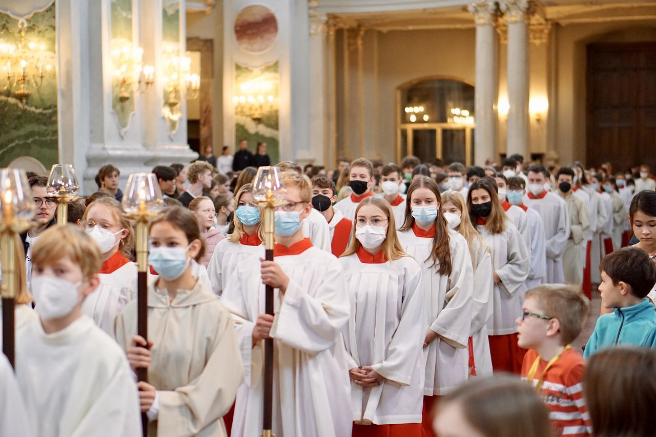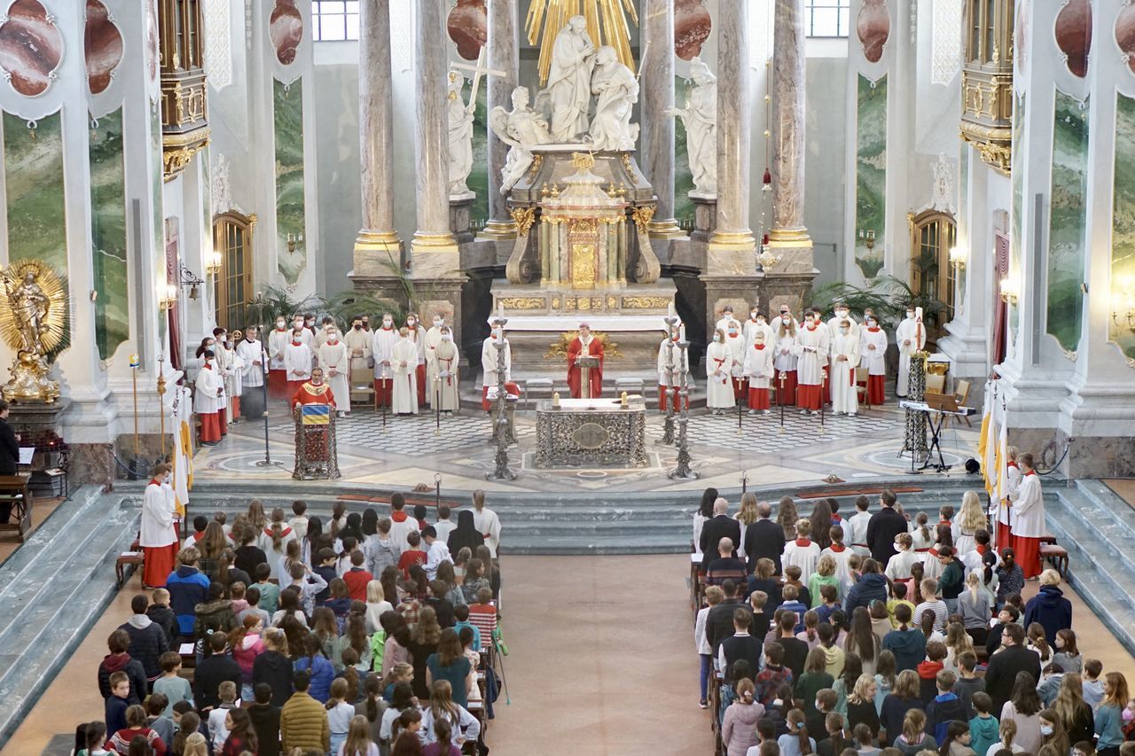 Nachdem sich die Besucher einen Überblick über das vielfältige Schulleben des Ursulinen-Gymnasiums verschafft hatten, beging die Schulgemeinschaft, in besonderer Weise repräsentiert durch 75 Ministrantinnen und Ministranten, den Festgottesdienst zum Gedenktag der Heiligen Ursula. Organisiert von den Schulseelsorgerinnen Frau Patricia Nübel und Frau Tanja Janicka, stellte der unter dem Motto "Seit 75 Jahren gemeinsam unterwegs" stehende Gottesdienst gleichzeitig eine Reflexion darüber dar, welche Werte das UGM in der Vergangenheit prägten und in der Zukunft prägen sollen. Der Begrüßung durch Dekan Jung folgten Beiträge der Schülerinnen und Schüler der neunten Klassen. In seiner Ansprache betonte Erzbischof Burger die Wichtigkeit, das Talent der Liebe, das allen ins Herz gelegt ist, zu realisieren. Das Programm wurde von Frau Dr. Eva Oettinger und Herrn Roth an der Orgel musikalisch gerahmt.