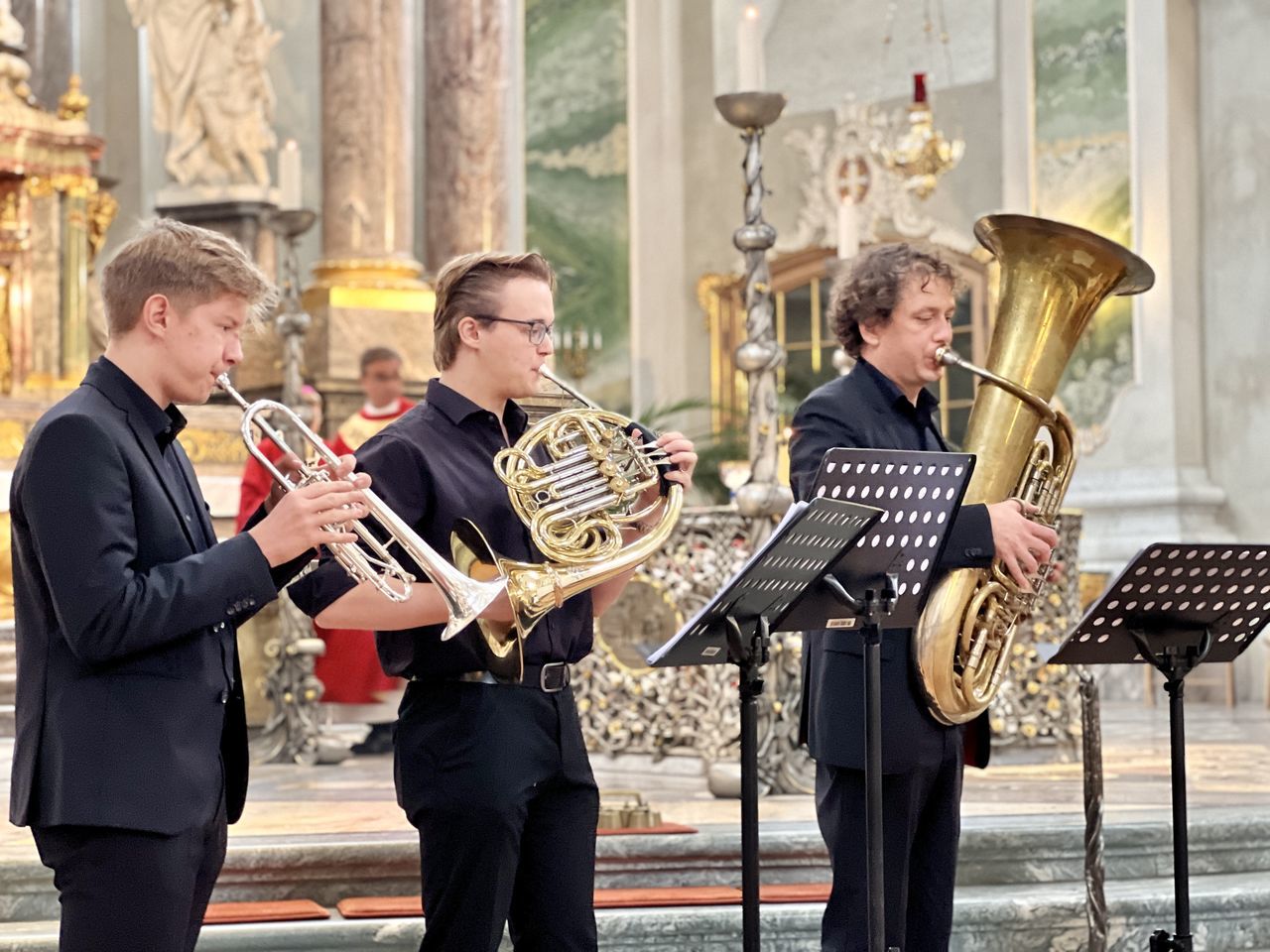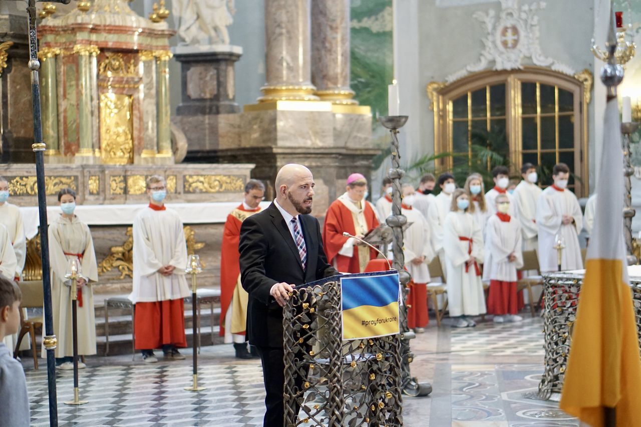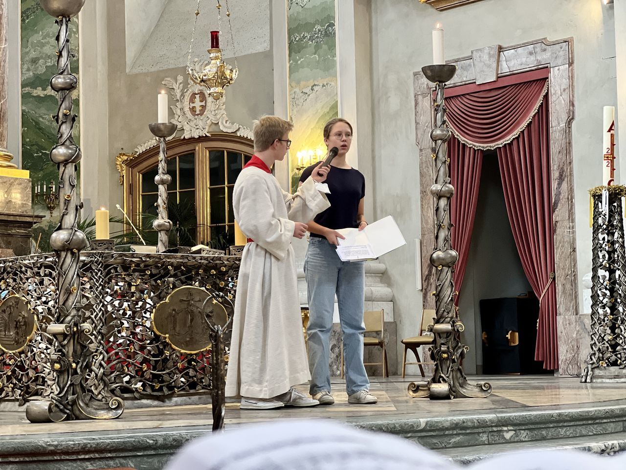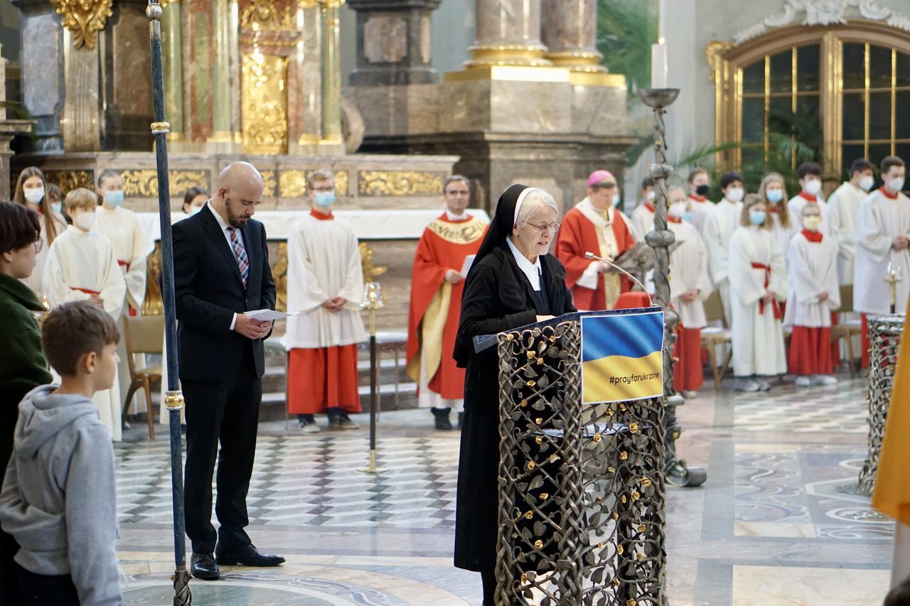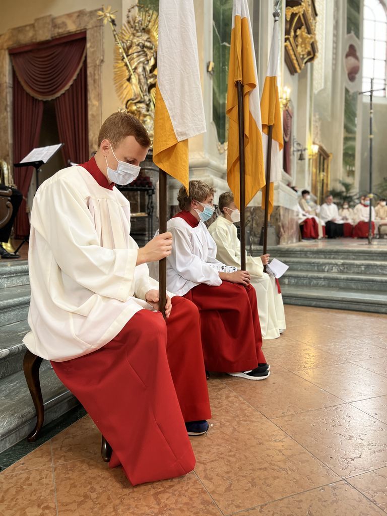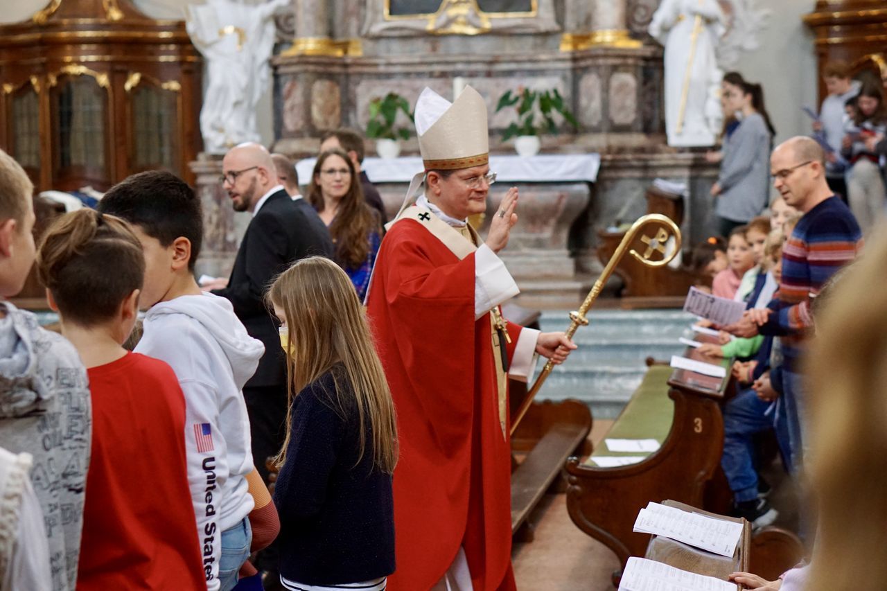 Nachdem sich die Besucher einen Überblick über das vielfältige Schulleben des Ursulinen-Gymnasiums verschafft hatten, beging die Schulgemeinschaft, in besonderer Weise repräsentiert durch 75 Ministrantinnen und Ministranten, den Festgottesdienst zum Gedenktag der Heiligen Ursula. Organisiert von den Schulseelsorgerinnen Frau Patricia Nübel und Frau Tanja Janicka, stellte der unter dem Motto "Seit 75 Jahren gemeinsam unterwegs" stehende Gottesdienst gleichzeitig eine Reflexion darüber dar, welche Werte das UGM in der Vergangenheit prägten und in der Zukunft prägen sollen. Der Begrüßung durch Dekan Jung folgten Beiträge der Schülerinnen und Schüler der neunten Klassen. In seiner Ansprache betonte Erzbischof Burger die Wichtigkeit, das Talent der Liebe, das allen ins Herz gelegt ist, zu realisieren. Das Programm wurde von Frau Dr. Eva Oettinger und Herrn Roth an der Orgel musikalisch gerahmt.