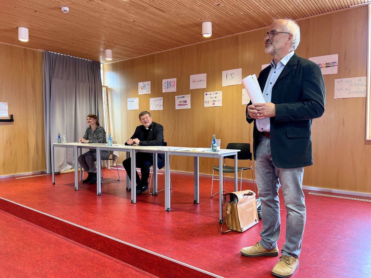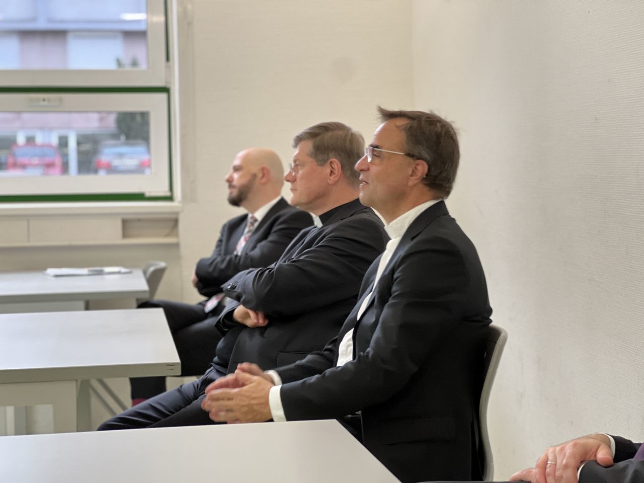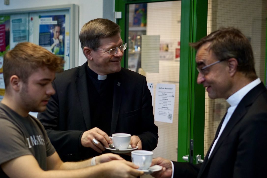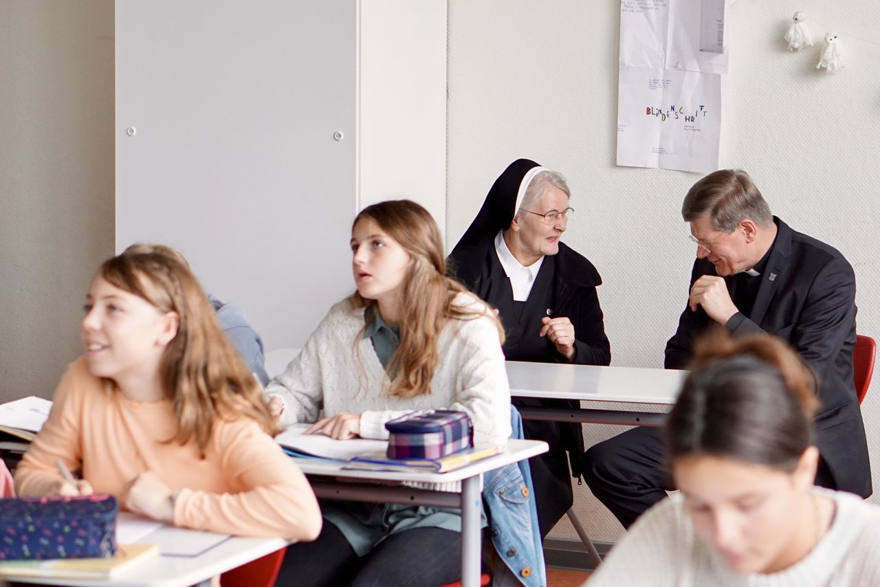 Das anschließende Gespräch zwischen ca. 60 Schülerinnen und Schülern und Erzbischof Stephan Burger wurde gekonnt von den Lehrkräften Frau Janicka und Herrn Dr. Claret moderiert. Gleich zu Beginn berichtete der Religionsleistungskurs von Frau Janicka vom "Gipfeltreffen" aus Freiburg zum Thema "Postwachstumsgesellschaft" und wartete mit Fragen auf, die sich aus der am Tag zuvor stattfindenden Schulstiftungsveranstaltung ergeben hatten. Im Zuge des Einlassens auf diese Fragen rund um das Thema Gerechtigkeit berichtete der Erzbischof von seinen einschlägigen Erfahrungen aus der Weltkirche als Misereorbischof und von der Armut, die ihm begegnete und nach der Solidarität der Christen verlangt. Herr Dr. Claret erläuterte das Thema "Bewahren und Erneuern: Wie kann die Kirche in Zukunft gesellschaftlich relevant bleiben?" und verwies auf das Spannungsfeld zwischen dem Bewahren der Tradition und der gesellschaftlichen Forderung nach Neuerungen. Die kritischen Fragen der Schülerinnen und Schüler zu den strittigen Themenfeldern: die Notwendigkeit des Zölibats, der Umgang der Kirche mit den Opfern bei der Aufarbeitung von Missbrauchsfällen, das Frauenpriestertum und die gleichgeschlechtliche Ehe, beantwortete Erzbischof Burger mit großer Akzeptanz für die konträren Sichtweisen, betonte allerdings stets seine konservative Ansicht. Deutlich herauszuhören war: Durch den starken persönlichen Bezug zur kirchlichenTradition, in der er selbst aufgewachsen ist, sei es ihm derzeit nicht möglich, vorbehaltlos zuzustimmen, wenn es um radikale Veränderungen gehe. Er hob hervor, dass jeder Mensch von Gott geliebt wird und in der Kirche willkommen ist. In Sachen Missbrauch will der Erzbischof umfängliche Aufklärung.