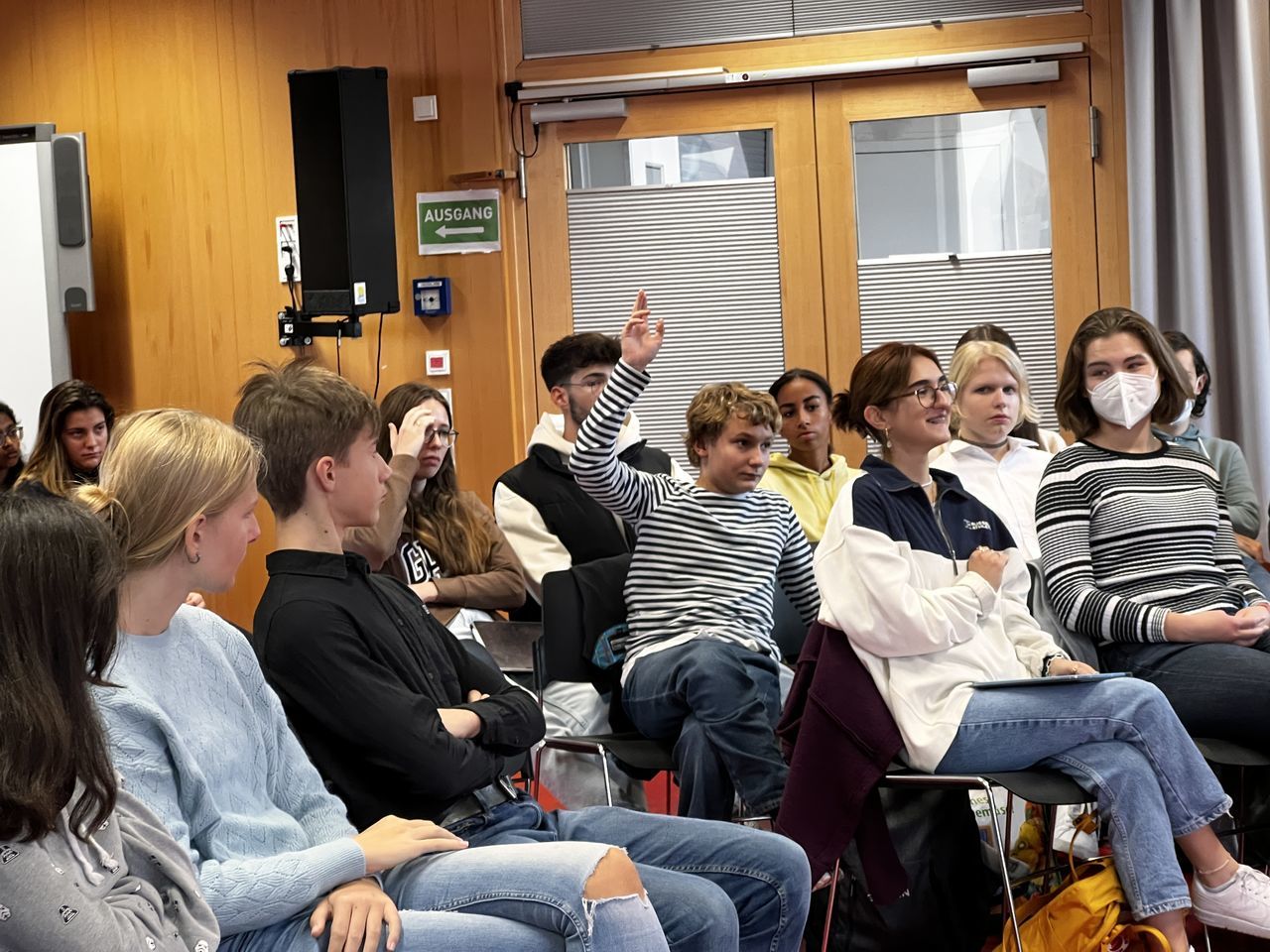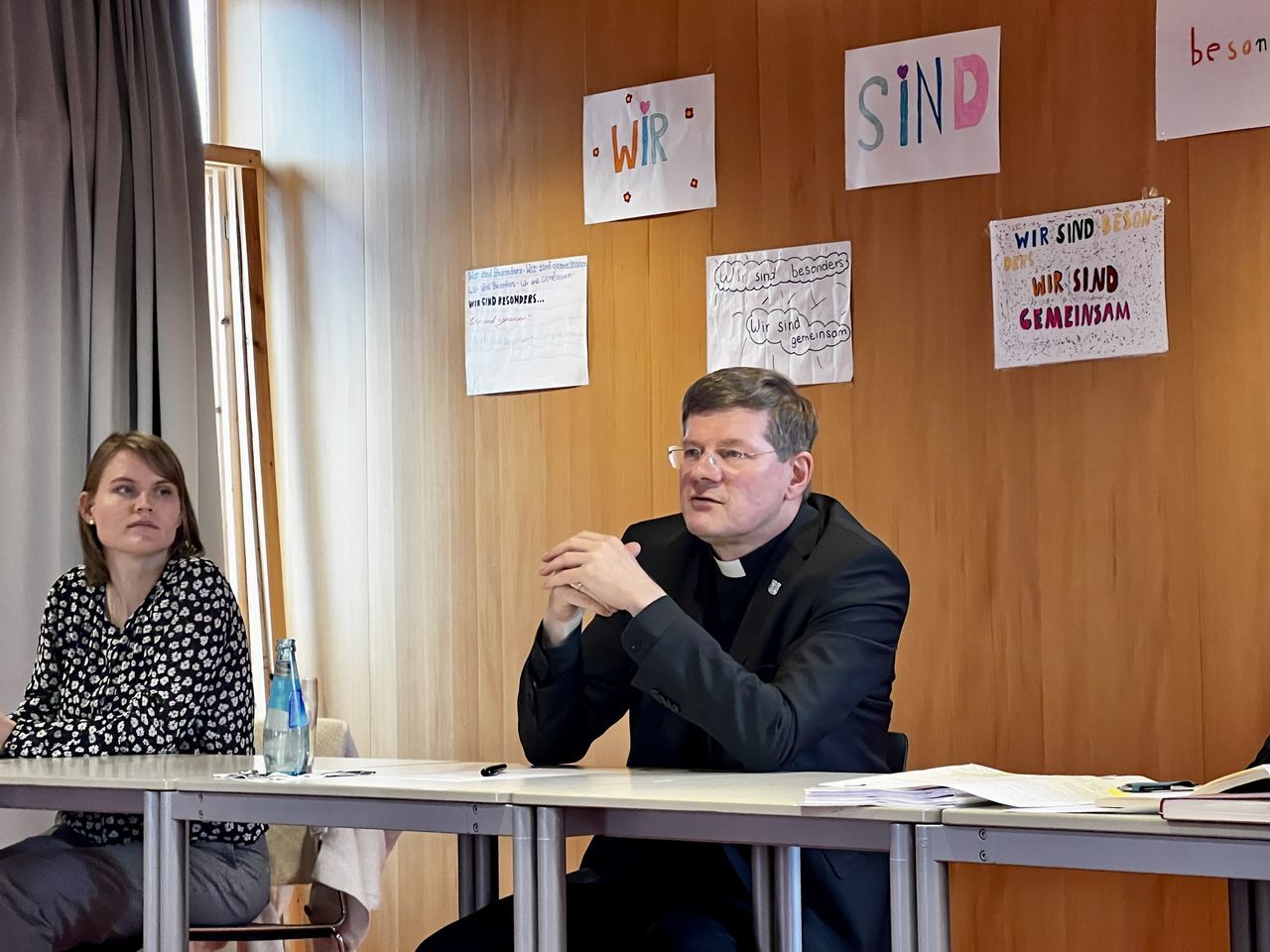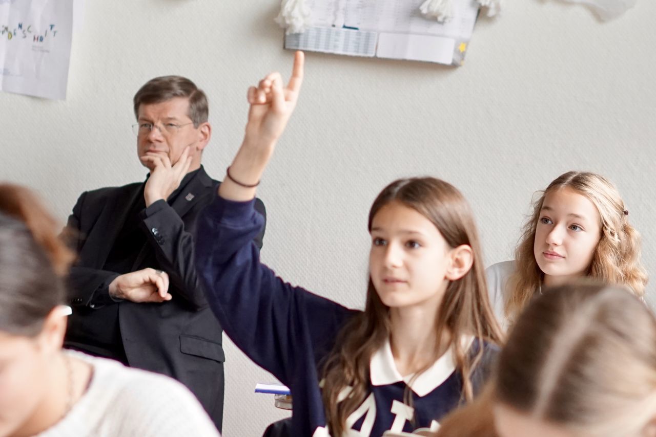 Das anschließende Gespräch zwischen ca. 60 Schülerinnen und Schülern und Erzbischof Stephan Burger wurde gekonnt von den Lehrkräften Frau Janicka und Herrn Dr. Claret moderiert. Gleich zu Beginn berichtete der Religionsleistungskurs von Frau Janicka vom "Gipfeltreffen" aus Freiburg zum Thema "Postwachstumsgesellschaft" und wartete mit Fragen auf, die sich aus der am Tag zuvor stattfindenden Schulstiftungsveranstaltung ergeben hatten. Im Zuge des Einlassens auf diese Fragen rund um das Thema Gerechtigkeit berichtete der Erzbischof von seinen einschlägigen Erfahrungen aus der Weltkirche als Misereorbischof und von der Armut, die ihm begegnete und nach der Solidarität der Christen verlangt. Herr Dr. Claret erläuterte das Thema "Bewahren und Erneuern: Wie kann die Kirche in Zukunft gesellschaftlich relevant bleiben?" und verwies auf das Spannungsfeld zwischen dem Bewahren der Tradition und der gesellschaftlichen Forderung nach Neuerungen. Die kritischen Fragen der Schülerinnen und Schüler zu den strittigen Themenfeldern: die Notwendigkeit des Zölibats, der Umgang der Kirche mit den Opfern bei der Aufarbeitung von Missbrauchsfällen, das Frauenpriestertum und die gleichgeschlechtliche Ehe, beantwortete Erzbischof Burger mit großer Akzeptanz für die konträren Sichtweisen, betonte allerdings stets seine konservative Ansicht. Deutlich herauszuhören war: Durch den starken persönlichen Bezug zur kirchlichenTradition, in der er selbst aufgewachsen ist, sei es ihm derzeit nicht möglich, vorbehaltlos zuzustimmen, wenn es um radikale Veränderungen gehe. Er hob hervor, dass jeder Mensch von Gott geliebt wird und in der Kirche willkommen ist. In Sachen Missbrauch will der Erzbischof umfängliche Aufklärung.
