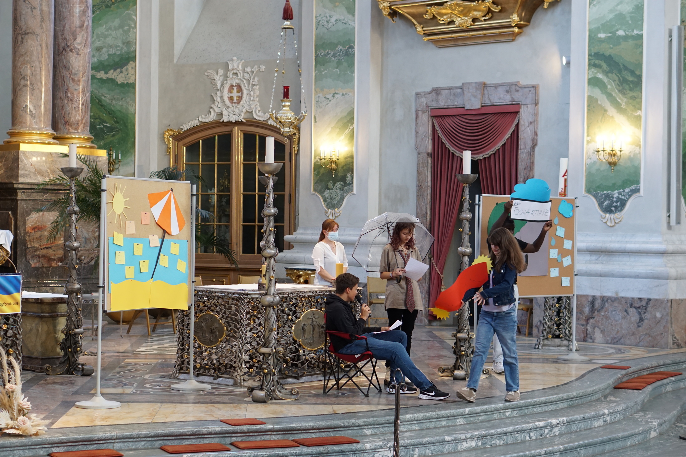 Zum ersten Mal seit zwei Jahren konnte der Eröffnungsgottesdienst des Ursulinen-Gymnasiums wieder gemeinsam gefeiert werden. In der vollbesetzten Jesuitenkirche präsentierten Frau Nübel und Herr Timpe mit tatkräftiger Unterstützung der Klasse 10c eine ebenso fröhliche wie besinnliche Feier unter dem Motto "Gemeinsam unterwegs".In der Verzweiflung das Schöne finden; das Vertrauen in dunklen Zeiten nicht verlieren; die Zukunft im Blick behalten - die Lieder und Vorträge des Gottesdienstes entfalteten ihre Aktualität vor dem Hintergrund der Krisen der letzten beiden Jahre. In seiner Auslegung von Psalm 91 betonte Sebastian Roth aus der KS2 die Notwendigkeit der Zuversicht gerade dann "wenn erschreckende Ereignisse hereinbrechen und die Furcht vor der Zukunft wächst." Im begleitenden Schauspiel fanden die Schülerinnen und Schüler der Klasse 10c entsprechend unter "dem Schirm des Höchsten" (Psalm 91) Schutz vor den Krisen der Zeit und machten der Schulgemeinde so Hoffnung auf ein sorgenfreieres Schuljahr.