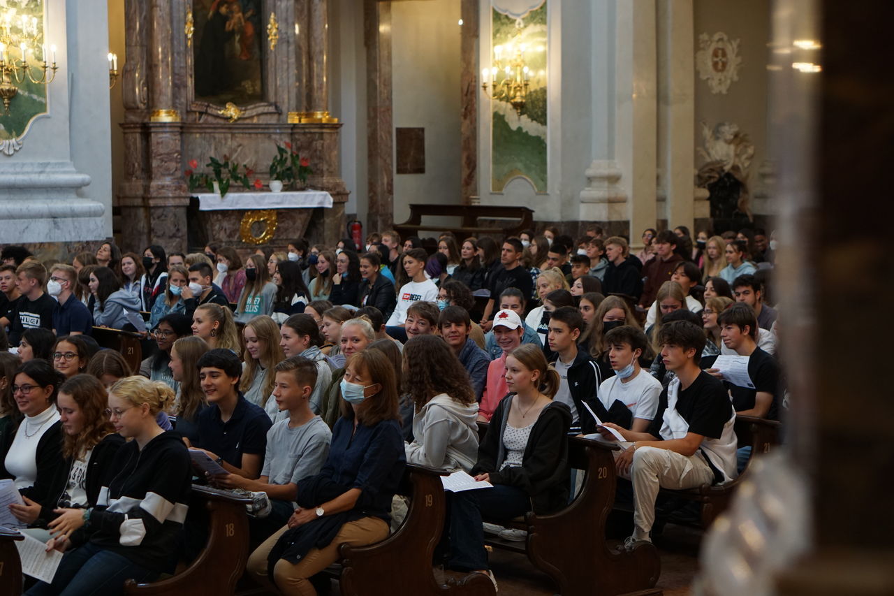 Umso wichtiger war es, dass sich die Schulgemeinde zusammen auf das neue Schuljahr einstimmen und gegen Sorgen und Ängste ansingen konnte. Frau Dr. Oettinger, Frau Bartaune und Herr Grän zeichneten musikalisch verantwortlich und animierten durch ihren engagierten Vortrag die Schulgemeinde zum Mitsingen. Den Schülerinnen und Schülern war die Begeisterung anzumerken. Der Geist des Gottesdienstes übertrug sich sogleich in die Klassenzimmer. Dort konnte der Regelunterricht mit einem Gefühl der Dankbarkeit und Normalität beginnen, im Wissen um die Unwägbarkeiten, die die Zukunft bereithalten wird. In unsicheren Zeiten endlich wieder gemeinsam unterwegs!