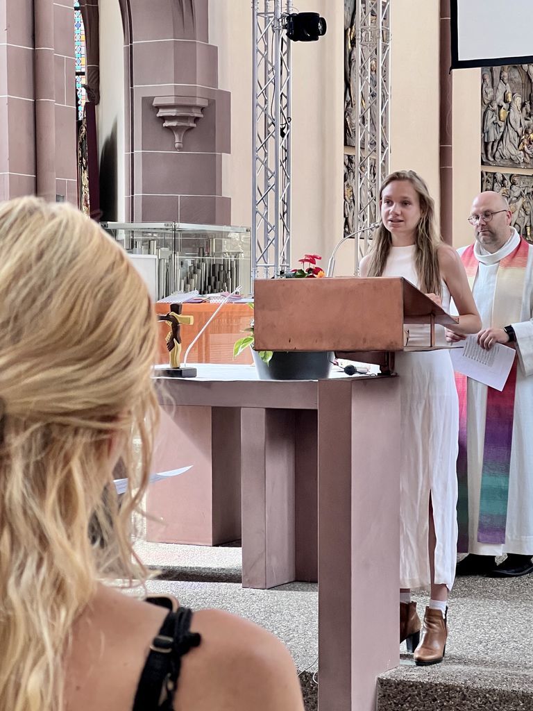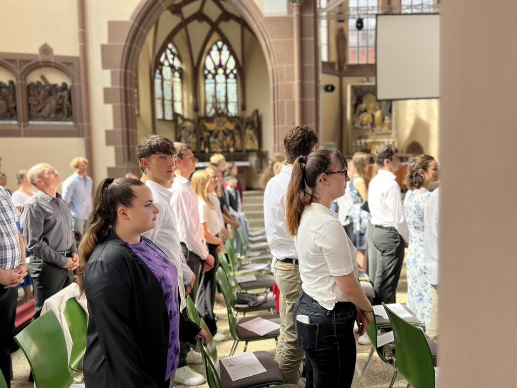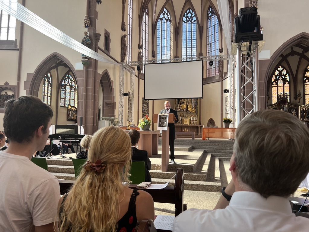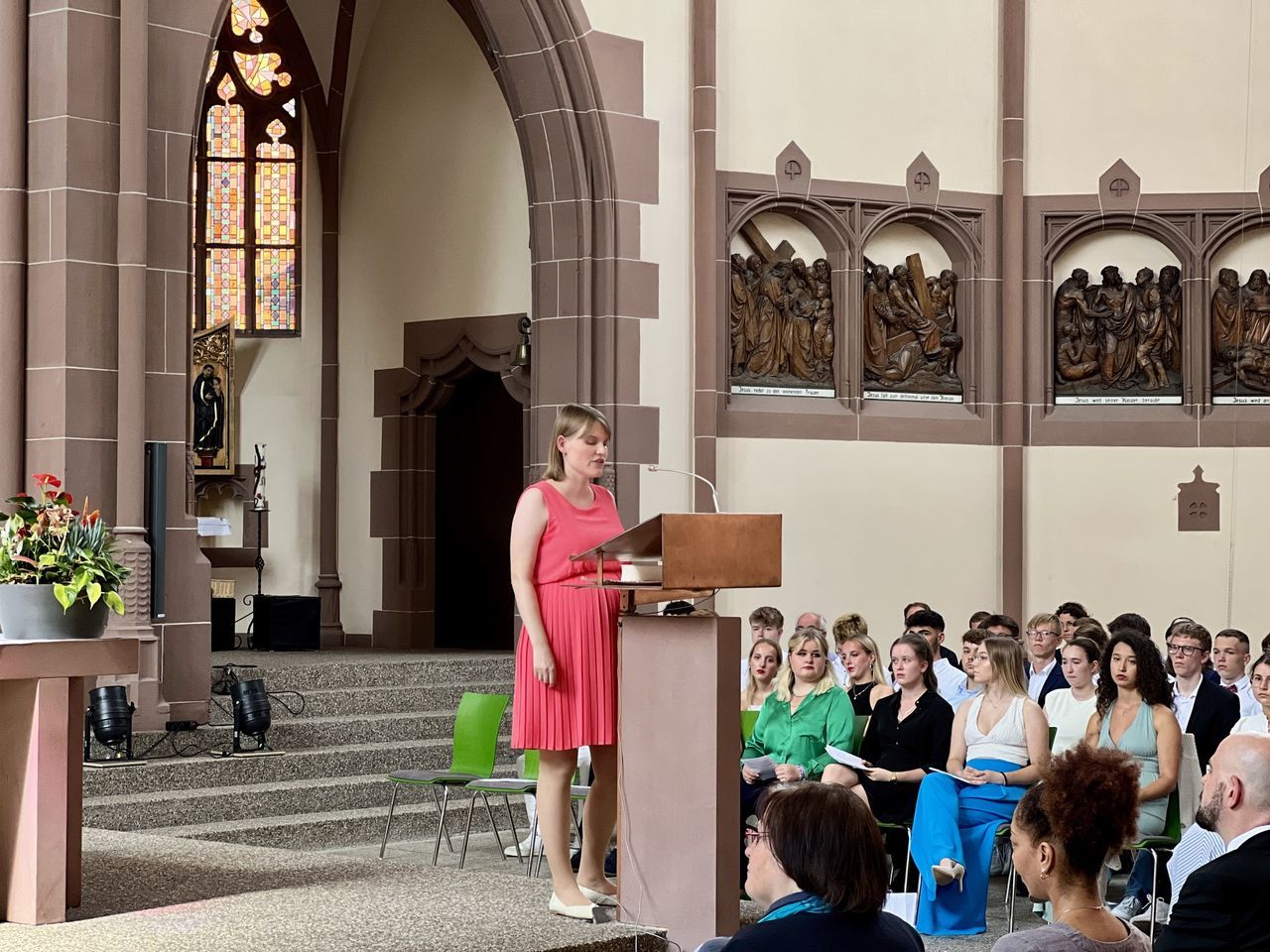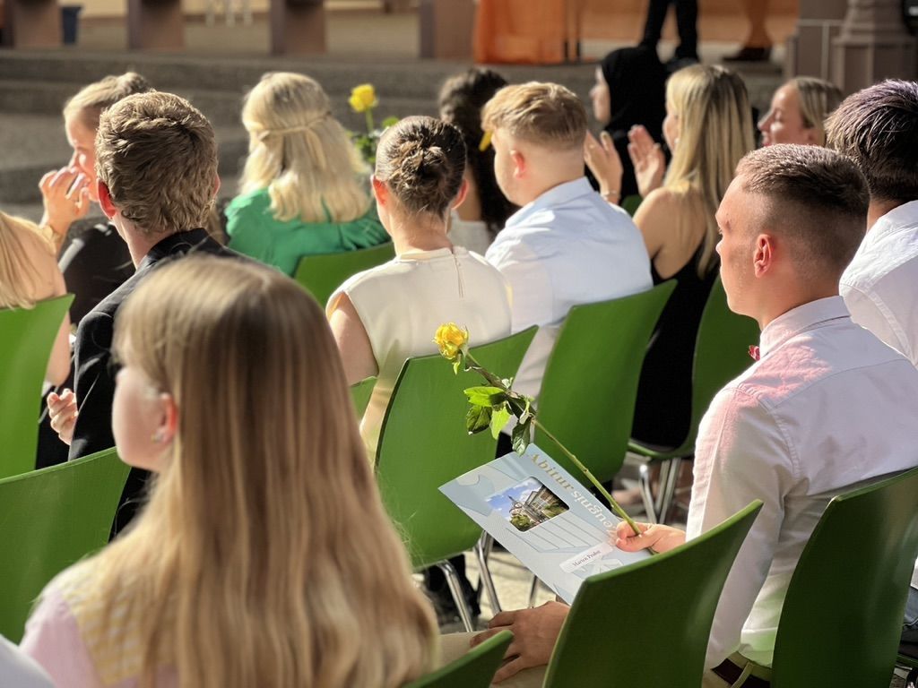Die diesjährige Entlassfeier der Abiturientinnen und Abiturienten in der Samuelkirche am Donnerstag, dem 20. Juli stellte die Talente des Jahrgangs in einem Gottesdienst und in anschließenden Reden in den Mittelpunkt. Schulleiter Stöckl nahm das Abi-Motto zum Anlass, um über die verschiedenen Bienen-Charaktere zu sinnieren und wünschte den nun ehemaligen Schülerinnen und Schülern Zuversicht in die eigenen Fähigkeiten beim Verlassen des vertrauten Stöckls namens Ursulinen-Gymnasium und dem damit verbundenen Ausschwärmen in die Welt. Die neugierige und zielstrebige Biene Maya komme ebenso wie ihr eher unsicherer Freund Willy letztlich am Ziel an. Hilfreich für die Zielsuche seien dabei die in den Abiturprüfungen erworbenen Flügel.