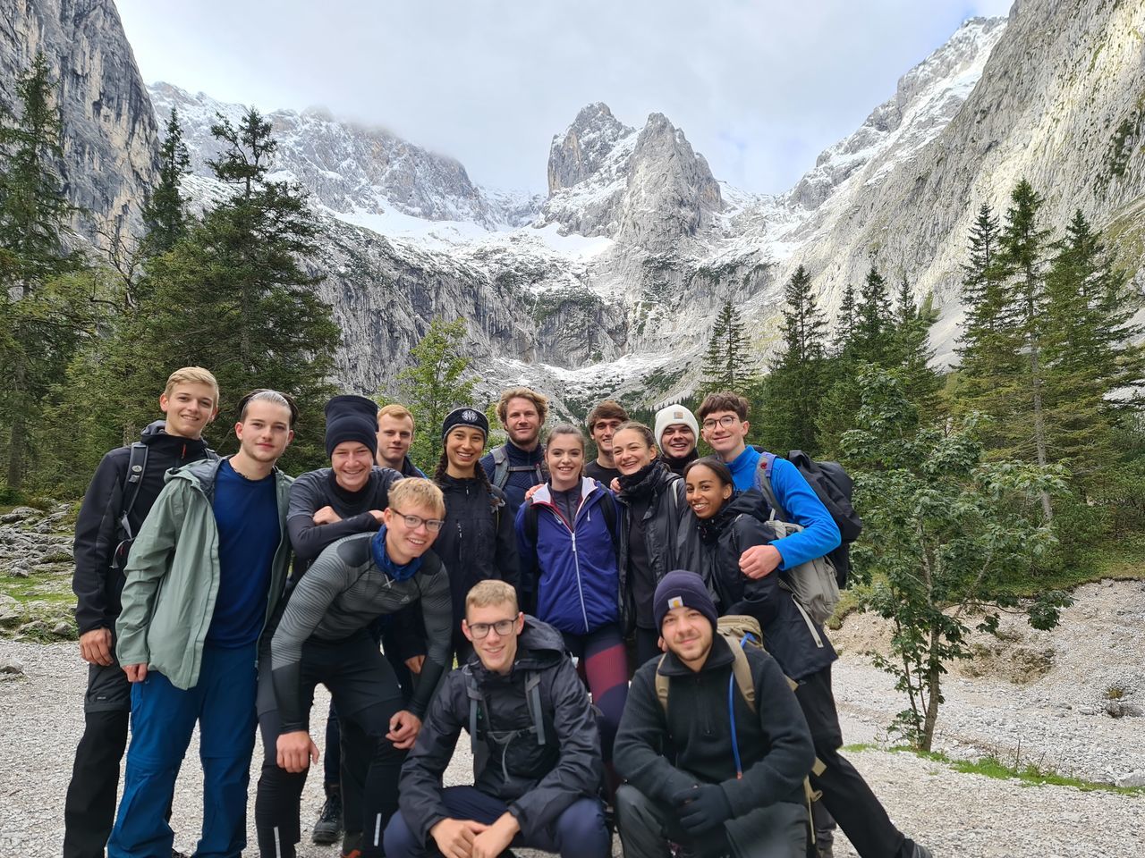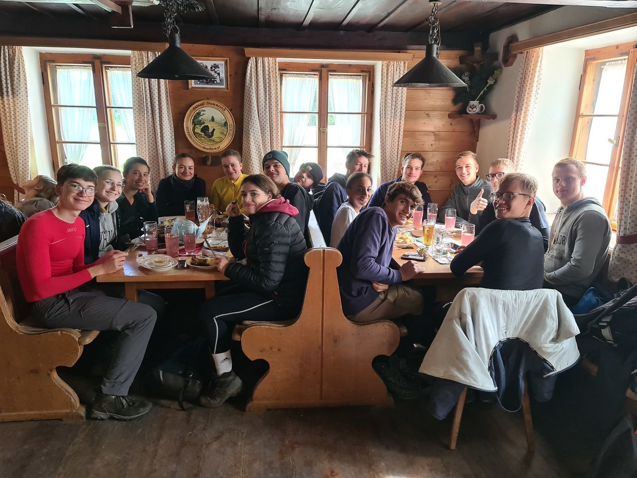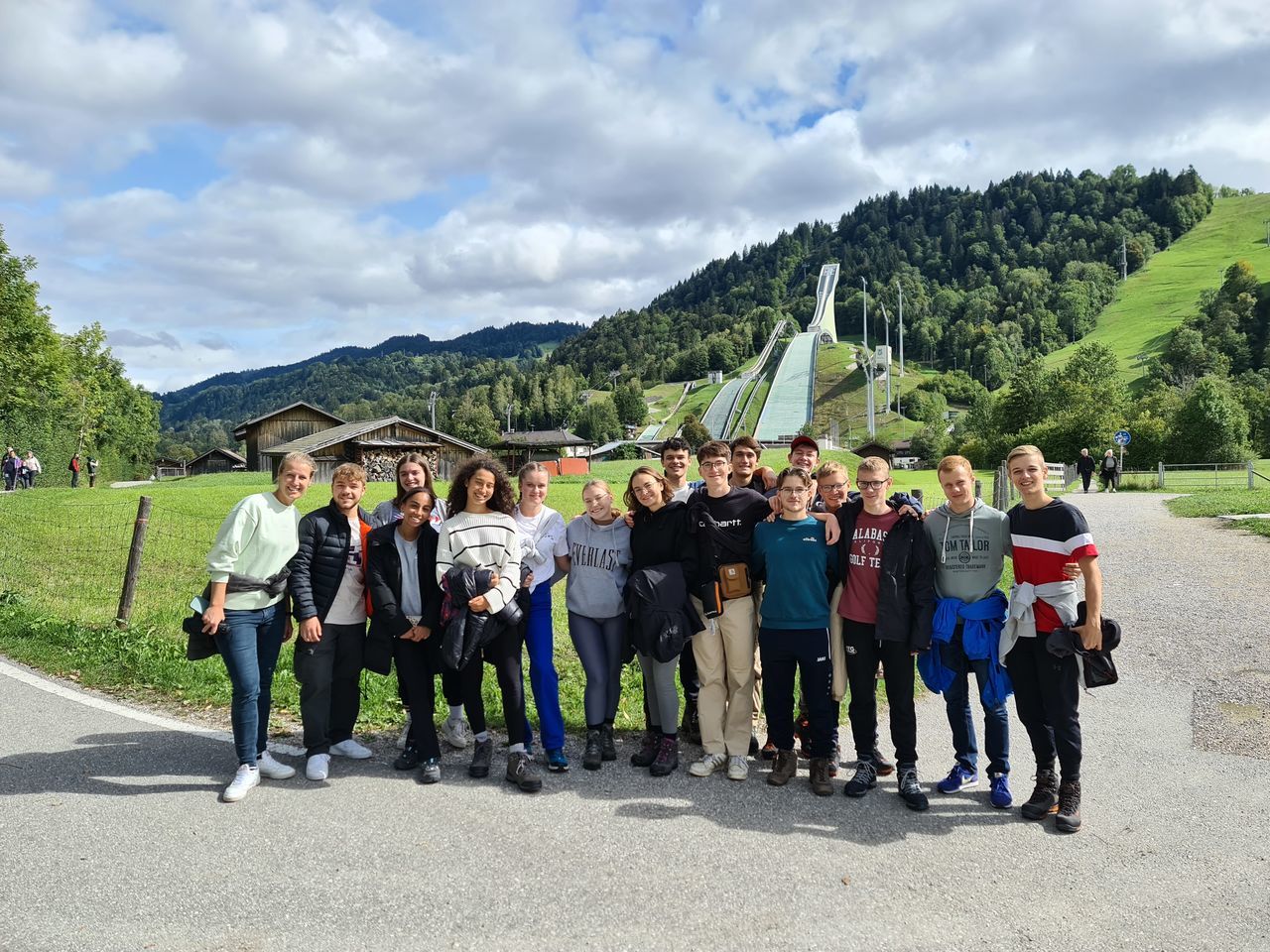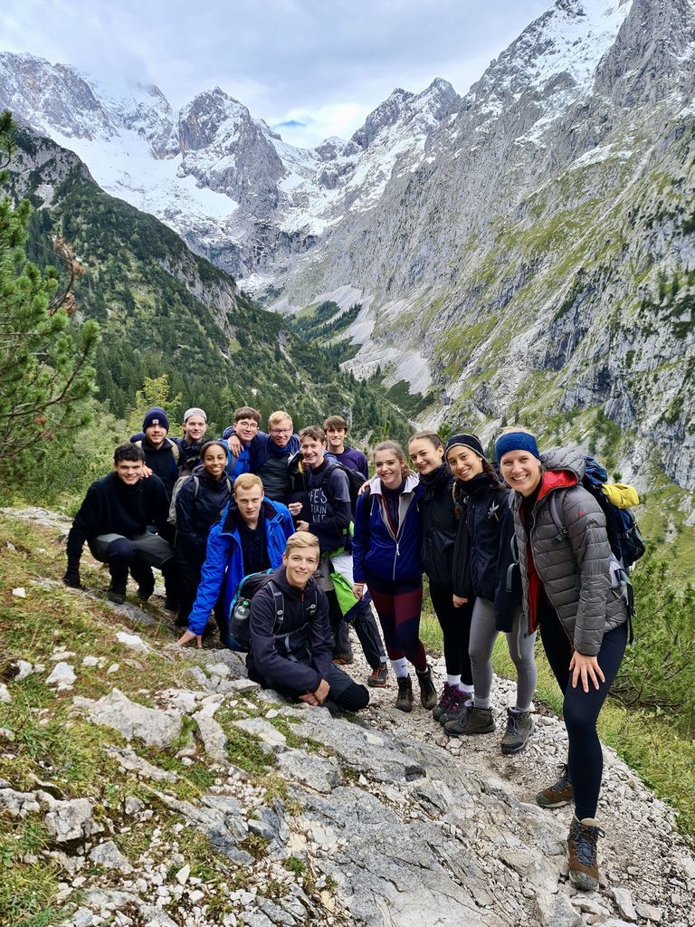 Eine Frage, die sich 16 wanderlustige Schüler und Schülerinnen der Kursstufe 2 gestellt haben. Auf der Suche nach der Antwort trafen wir uns mit Frau Meusel am Sonntag, den 18. September um 8 Uhr am Hauptbahnhof Mannheim, um gemeinsam mit dem Zug in die bayrische Bergwelt zu fahren. Nach einer fünfstündigen Anreise und einer kurzen, aber intensiven Sporteinlage am Bahnsteig, um den Anschlusszug zu kriegen, erreichten wir unsere Jugendherberge, wo Herr Rothmann bereits auf uns wartete. Da wir unsere Zimmer noch nicht beziehen konnten, nutzen wir die Zeit, um erst einmal richtig anzukommen. Wir machten uns auf dem Weg in die Altstadt Garmisch-Partenkirchens, da an diesem Wochenende ein Streetfestival mit vielen kleinen Essenständen und Musikern, die Volksmusik spielten, stattfand. Auf dem Weg dahin präsentierte uns Herr Rothmann mögliche Wandertouren, die wir machen würden und ebenso besichtigten wir eine der vier großen berühmten Skisprungschanzen. Um 19 Uhr trafen wir uns zum gemeinsamen Abendessen, denn Herr Rothmann hatte bereits im Voraus bei einem Italiener reserviert, sodass wir einen geselligen Abend mit Pizza und Pasta genießen konnten. Am nächsten Morgen klingelten die Wecker bereits um kurz nach 6 Uhr, denn um Punkt 7 Uhr sollten wir beim Frühstück sein. Nachdem wir uns gestärkt hatten, ging es in voller Montur trotz Regen, aber dennoch höchstmotiviert und voller Abenteuerlust los. Für diesen Tag war der Anstieg auf dem Wank, welcher knapp 2000 Metern über dem Meeresspiegel liegt, geplant. Auf dem Weg galt es mehr als 1000 Höhenmeter zu bewältigen, doch die Anstrengung hatte sich gelohnt. Müde, aber dennoch stolz den Gipfel erreicht zu haben, konnten wir die Aussicht genießen. Jedoch macht frische Bergluft hungrig, weshalb wir uns schnellen Schrittes auf den Weg zu einer süßen traditionellen Almhütte im Tal machten. Dort bestellten wir uns Suppe, Kaiserschmarrn und andere Leckereien, die wir genießen beziehungsweise inhalieren konnten. Nachdem wir unsere Energiereserven aufgefüllt hatten, machten wir uns auf den Rückweg, welcher uns allen nochmals alles abverlangt hat, da es sich um einen steilen Abstieg auf einer asphaltierten Straße handelte. 20km und knapp 400 Stockwerke später kamen wir gegen 16 Uhr wieder in der Jugendherberge an und hatten Zeit uns auszuruhen und zu duschen bis wir uns um 19 Uhr wieder in der Lobby trafen, um zum Abendessen zu gehen. An diesem Abend hatten wir einen Tisch in einer urigen bayrischen Gaststätte. Dies nahmen sich Leonard (12c) und Valentin (12d) zum Anlass die Challenge anzunehmen und ein 500g Gordon Blue zu schlagen. Der Rest der Gruppe aß andere traditionelle Gerichte, wie Kasspätzle, Schnitzel, Tiroler Klöpse oder verschiedene Braten. Während wir aßen, gab es zwischendrin Tanzeinlagen zweier junger Schuhplattler, die für die passende feierliche Stimmung sorgten. An diesem Abend lagen wir alle bereits früh im Bett, denn am nächsten Tag sollte es erneut in die Berge gehen.