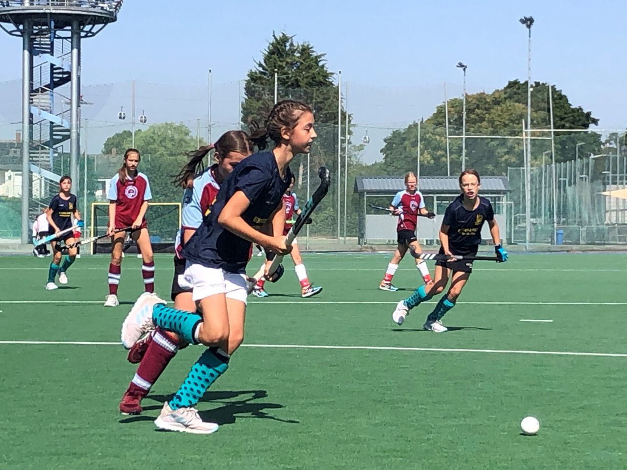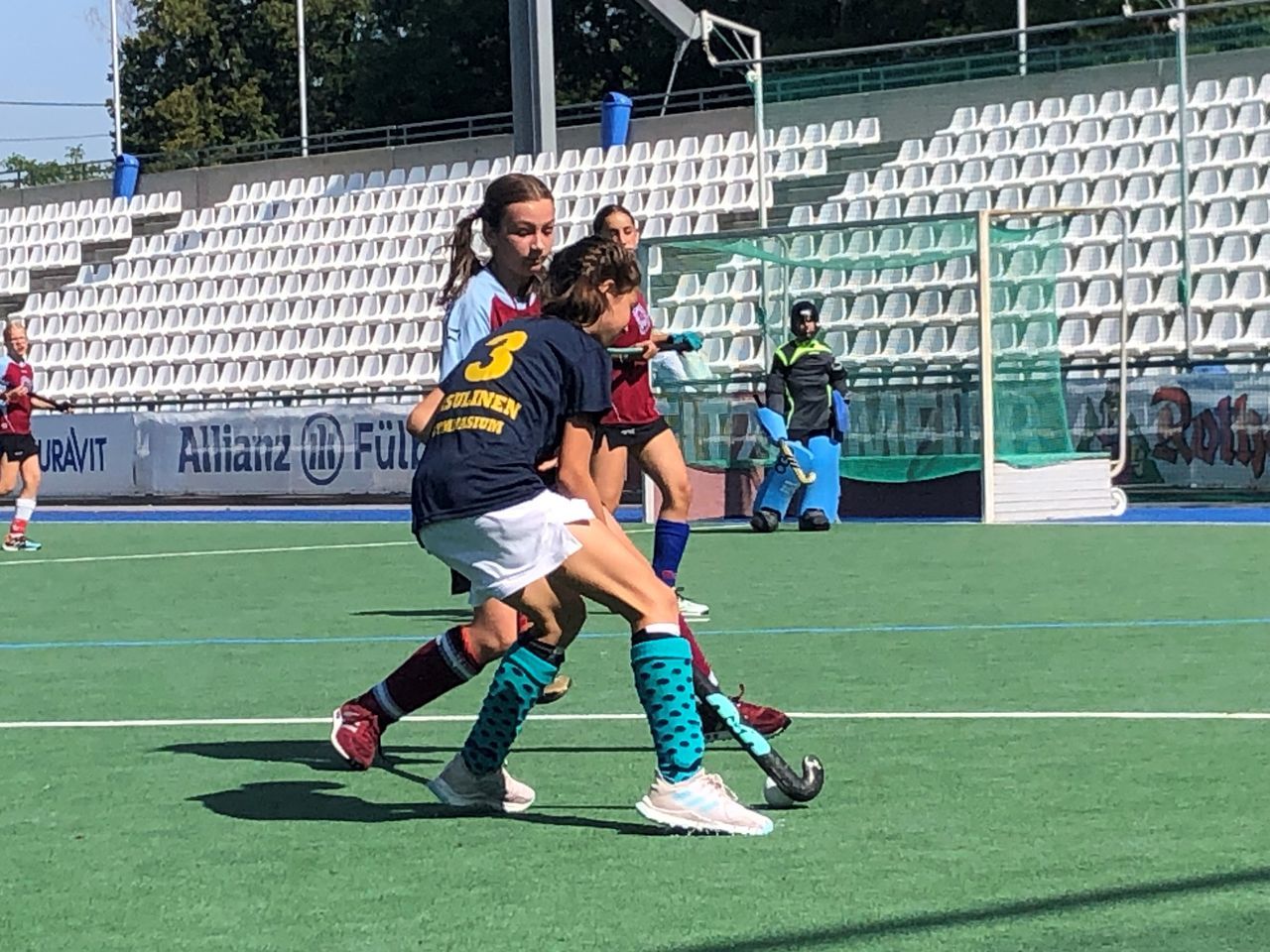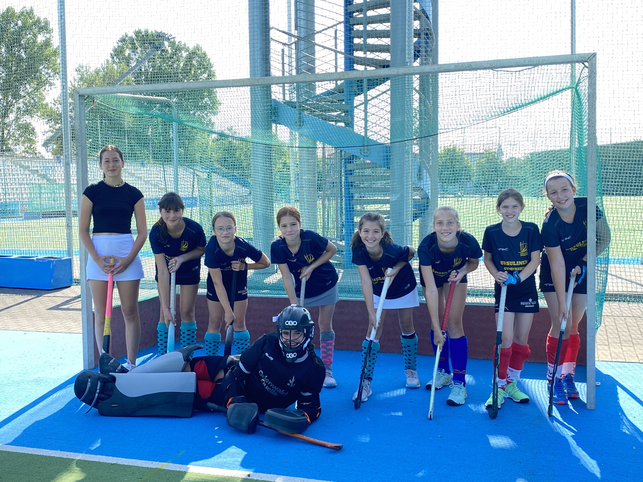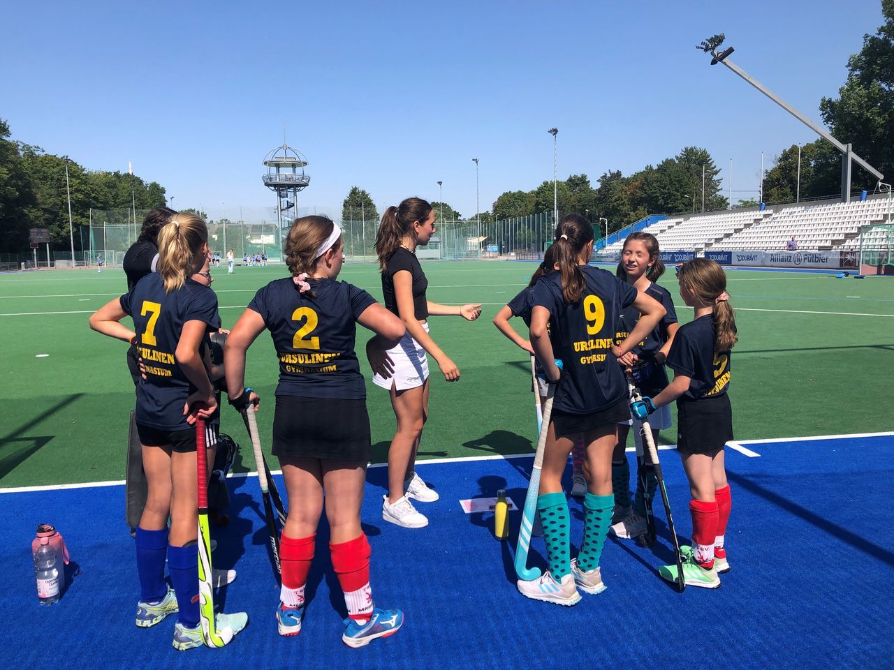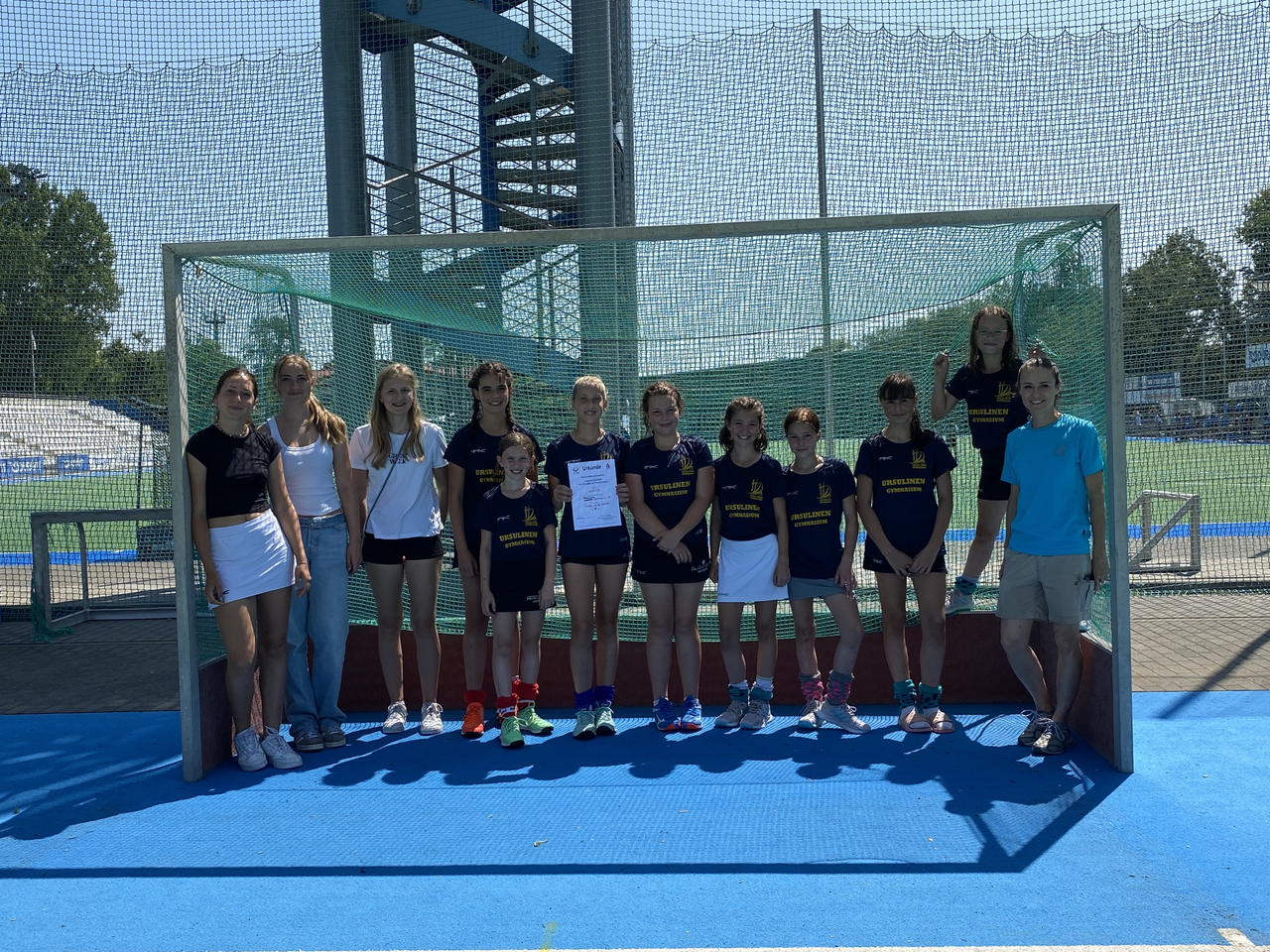 Auch in diesem Jahr nahm für das UGM eine richtig gute Mannschaft aus neun hochmotivierten Schülerinnen am RP-Finale im Hockey teil. Professionell gecoacht wurden sie von Josefine Brilla (Klasse 10) und betreut von Frau Schwitalla. Zudem verstärkte unsere Delegation Tilda Ginter und Leonie Blankenburg (beide Klasse 10), die als Schiedsrichterinnen am Turnier mitwirkten. Frau Hüttner, Herr Dumann und Frau Beier (Eltern der Schülerinnen) feuerten vom Spielfeldrand unser Team an, reichten Getränke und kühle Handtücher. Bei Temperaturen von über 30 Grad und kaum Pause zwischen den Spielen wurde von den Spielerinnen höchste Anstrengung abverlangt. Das erste Spiel konnte mit vielen überzeugenden Spielzügen gewonnen werden. In den weiteren Partien war das Glück nicht immer auf unserer Seite. Am Ende belegte unsere Mannschaft einen guten 4. Platz.