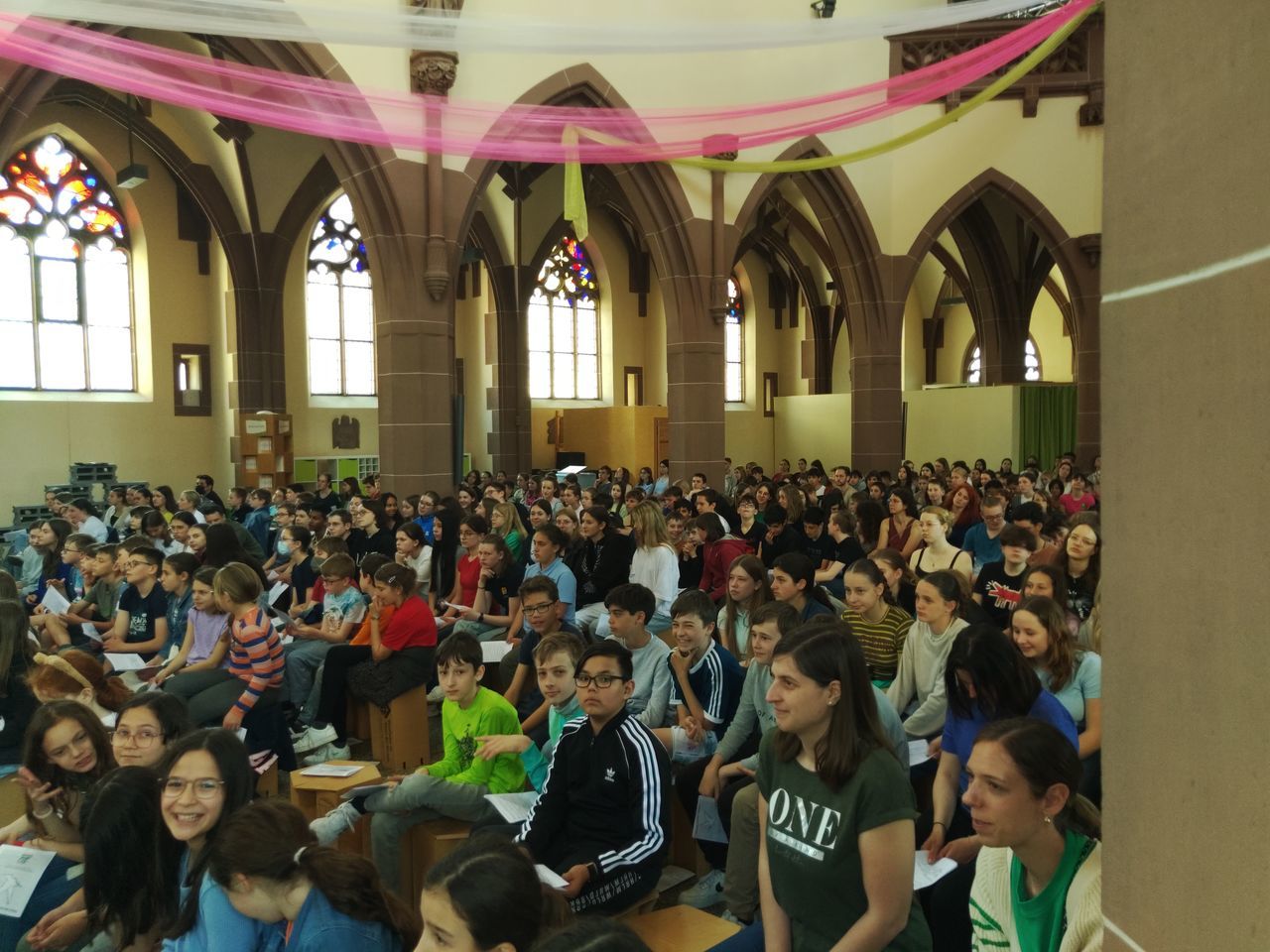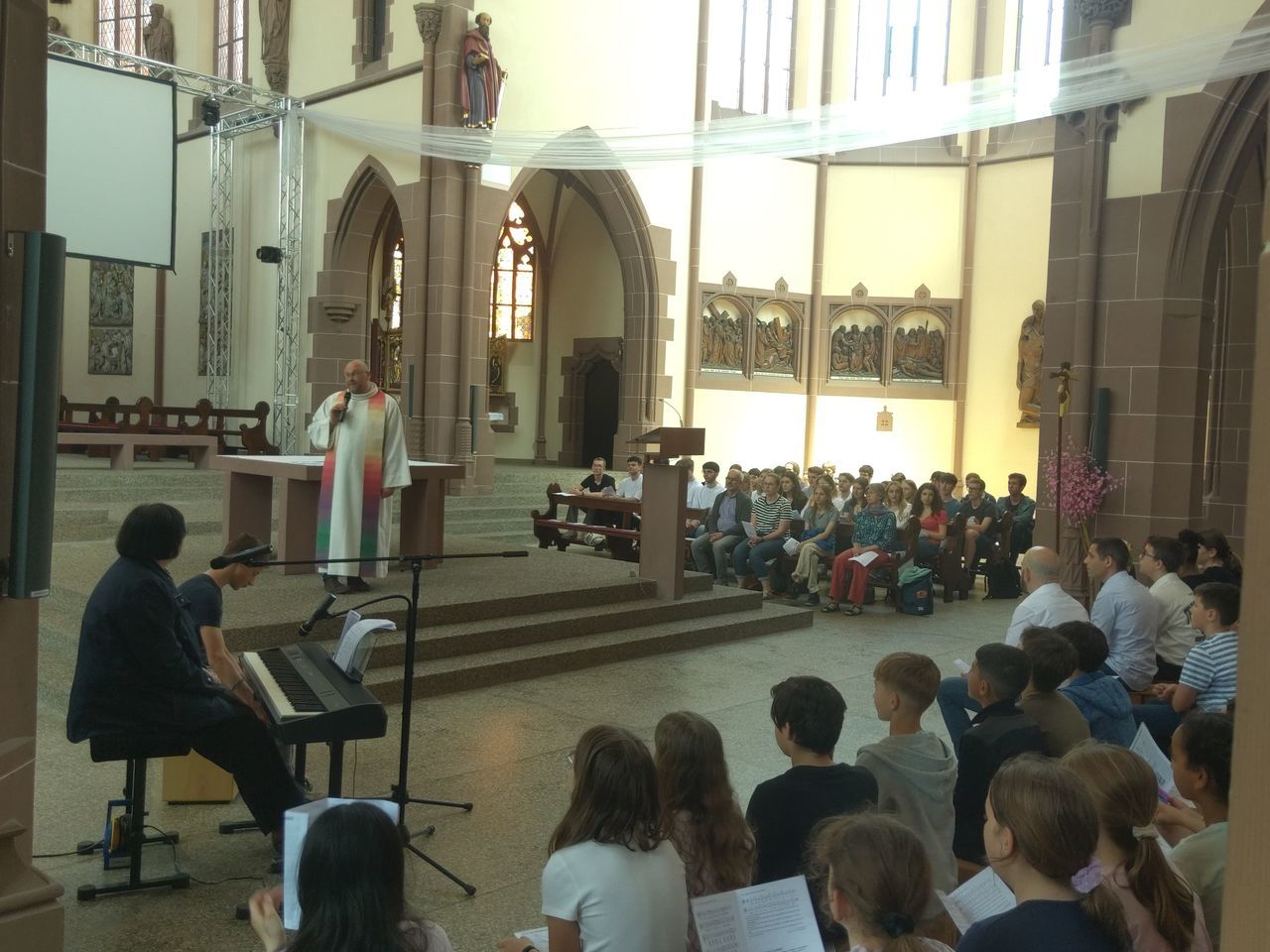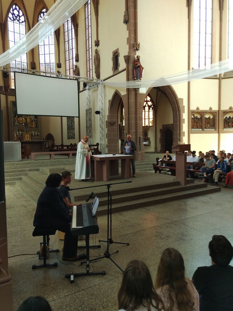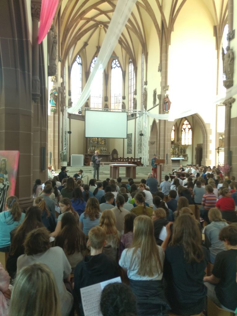 Am 26.5.2023, direkt vor den sehnsüchtig erwarteten Pfingstferien und dem Pfingstfest, fand der Pfingstgottesdienst für die Schulgemeinde des UGM statt. Wie Jugendpfarrer Manuel Gärtner in seiner Begrüßung betonte, war die Jugendkirche Samuel, in der der Pfingstgottesdienst traditionell stattfindet, prall gefüllt.