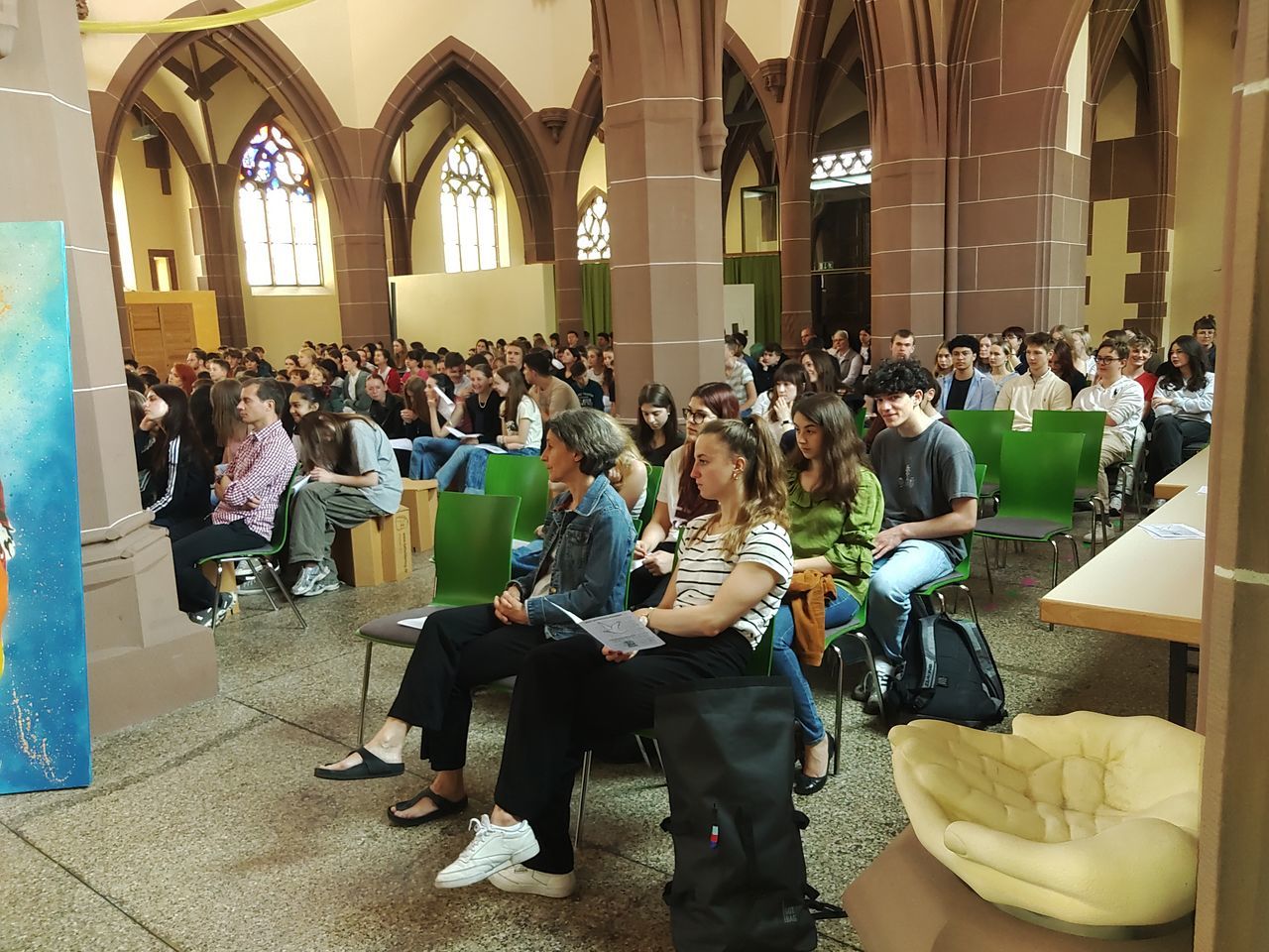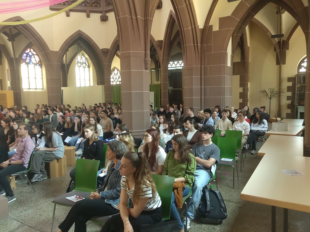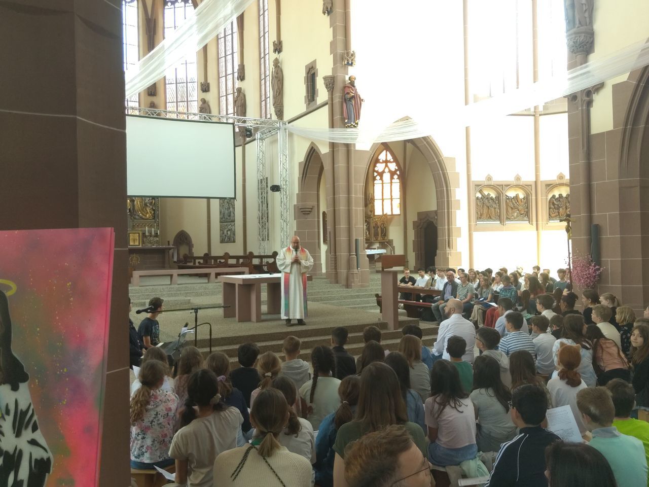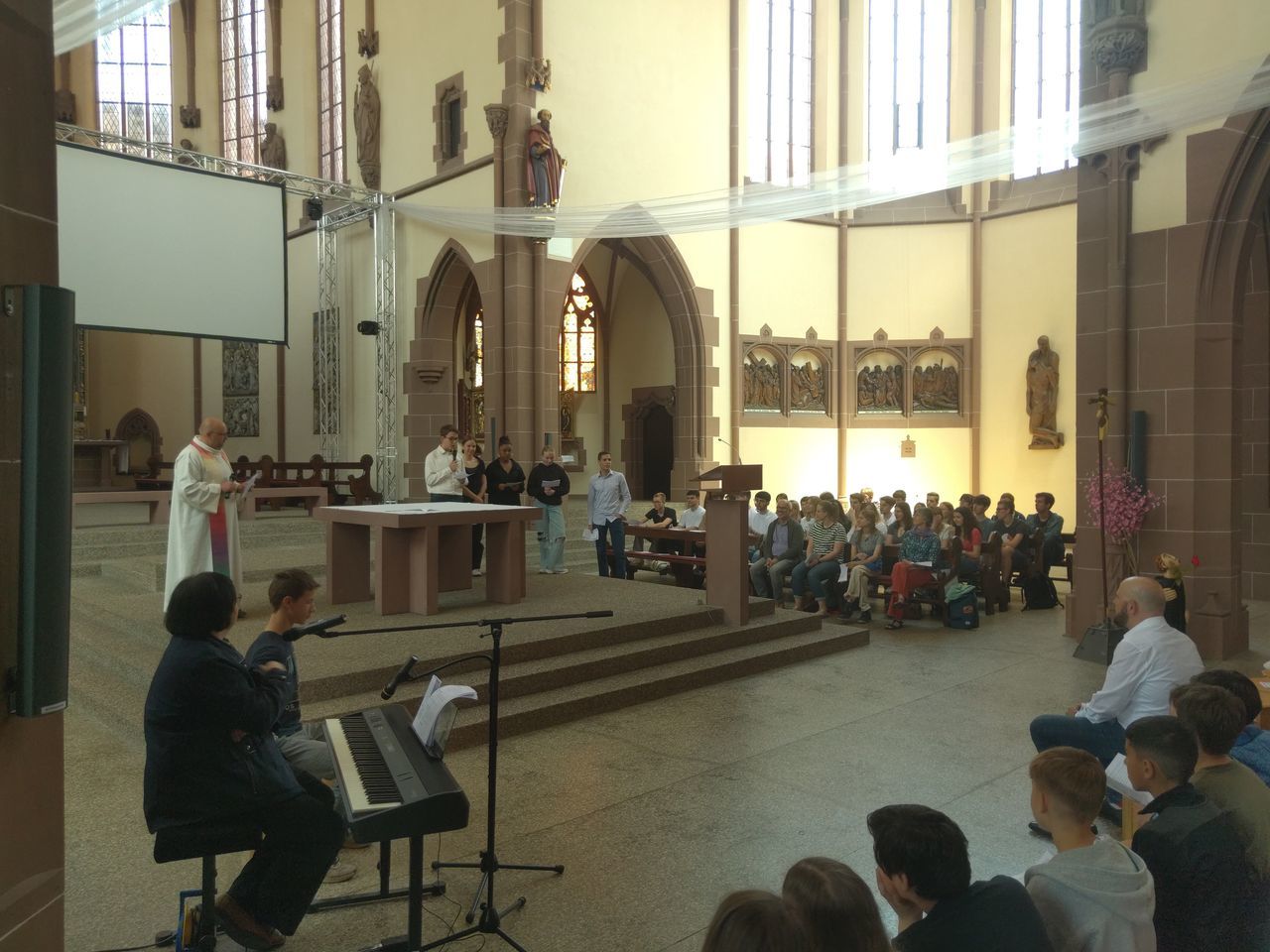 Am 26.5.2023, direkt vor den sehnsüchtig erwarteten Pfingstferien und dem Pfingstfest, fand der Pfingstgottesdienst für die Schulgemeinde des UGM statt. Wie Jugendpfarrer Manuel Gärtner in seiner Begrüßung betonte, war die Jugendkirche Samuel, in der der Pfingstgottesdienst traditionell stattfindet, prall gefüllt.
