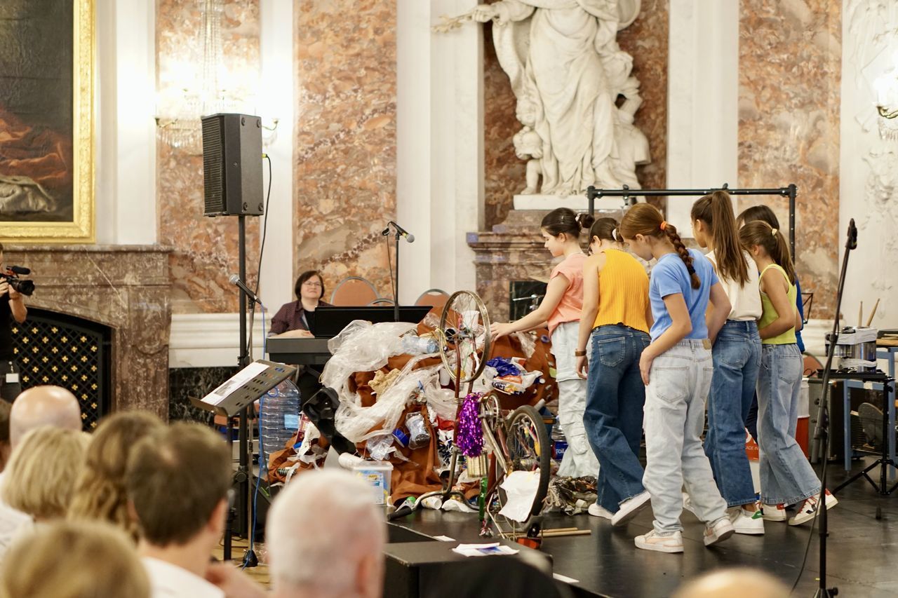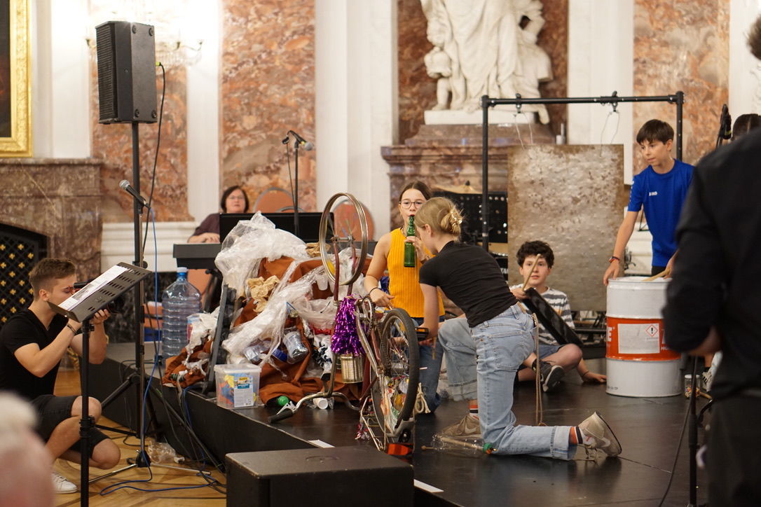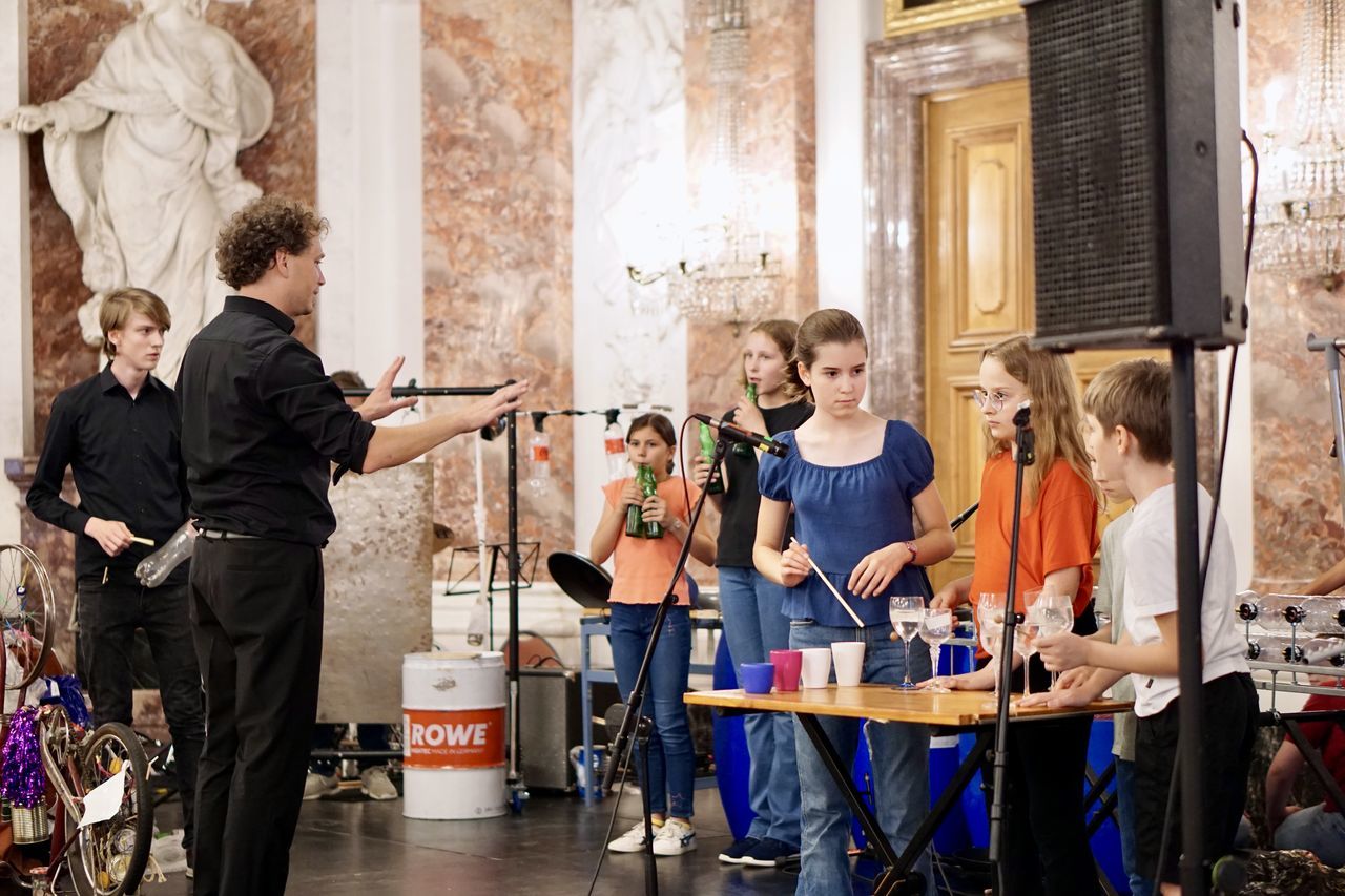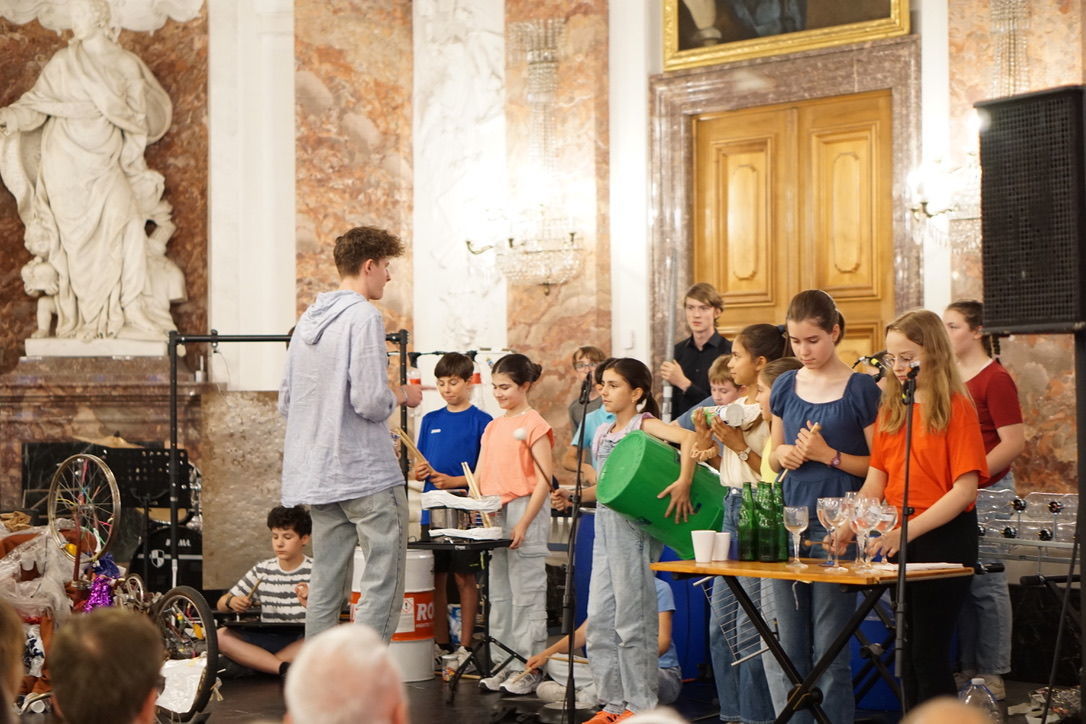 Das Schulorchester, die Streicherklasse und die Chöre des UGM gestalteten ein abwechslungsreiches Programm. Nicht nur der Auftritt im Schloss, sondern auch die Stücke des Upcycling-Orchesters, unter der Leitung von Herrn Grän, waren für eine Schulveranstaltung des UGM bisher einmalig. Allein durch das Upcyclen von gebrauchten Gegenständen und Müll, entstanden neue Instrumente, die das Publikum in ihren Bann zogen. Sowohl der Einzelauftritt des Upcycling-Orchesters als auch die Kooperation mit Orchester und Chor des UGM waren ein voller Erfolg.