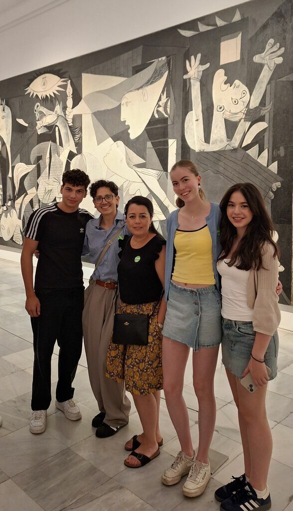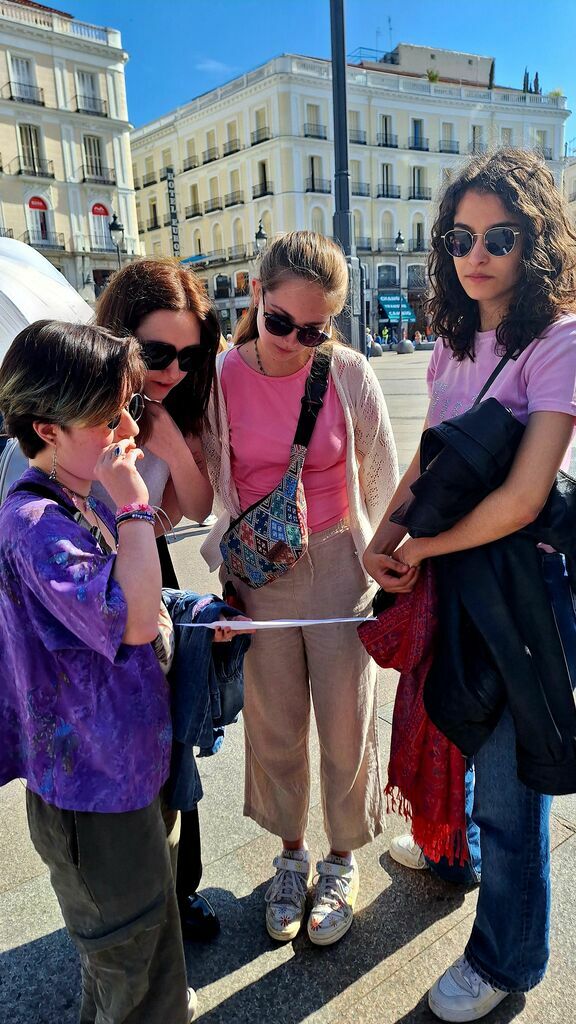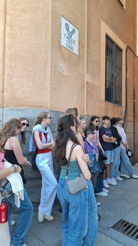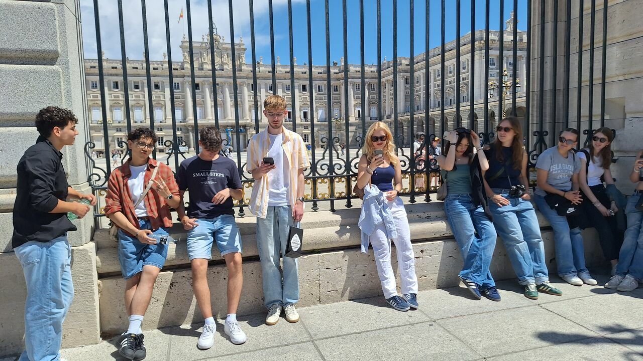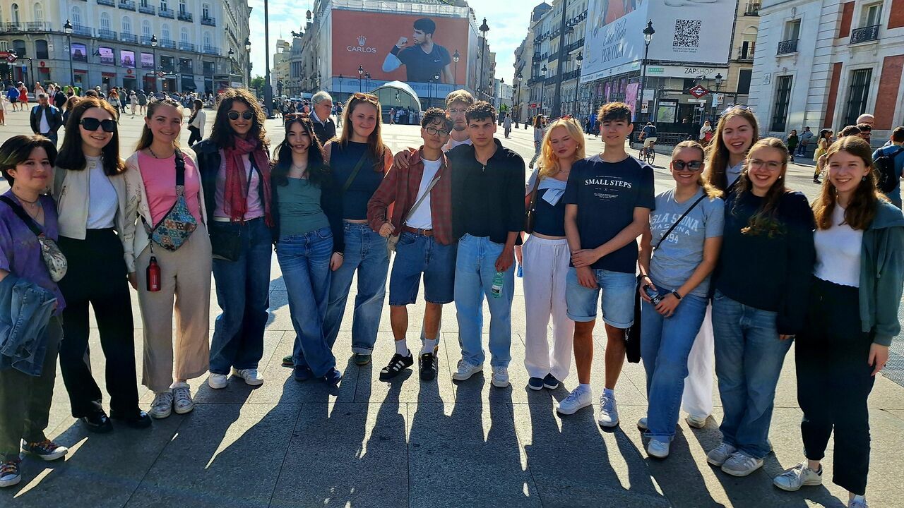 Direkt nach den Kommunikationsprüfungen der Kursstufe 2 fuhren die Spanischkurse der Kursstufen am Dienstag, 11. Juni 2024 nach Frankfurt, um von dort nach Madrid zu fliegen. Nach einem reibungslosen Flug kamen wir spät an der Haltestelle „Puerta del Sol“ an. Völlig geschafft, machten wir uns schließlich zu Fuß auf den Weg, um die letzten Meter zu bestreiten. Doch auch diese Etappe verlief anders als erwartet. Anstatt nur ein paar Minuten Fußweg erwarteten uns ungefähr 35 Minuten Wanderung durch das hügelige Madrid. Wie sich am Ende herausstellte, hatte uns Google Maps unseren Weg deutlich erschwert und uns einen ziemlichen Umweg vor die Nase gesetzt. Nachdem wir dann schließlich gegen Mitternacht am Hostel angekommen waren, hatten wir leider immer noch nicht zu Abend gegessen, weshalb wir dann noch bis um 00:30 Zeit hatten, uns mit Empanadas oder anderen spanischen Köstlichkeiten zu versorgen.