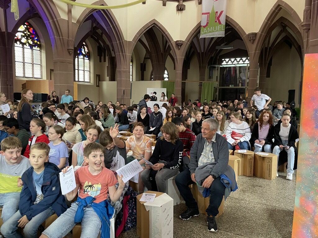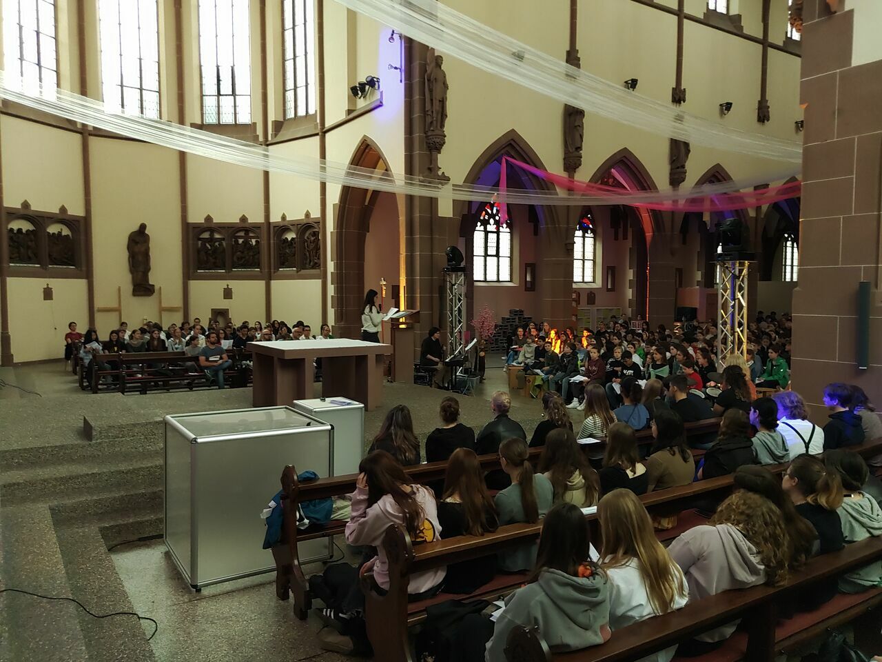Unter dem Motto „Miteinander füreinander“ feierte die gesamte Schulgemeinschaft am 17.05.2024 in der Jugendkirche Samuel Pfingsten, das Fest des Heiligen Geistes und seines Wirkens. In den Gebeten und kurzen Impulsen, die von Herrn Dr. Claret und Herrn Ohl vorgetragen wurden, aber auch in den musikalischen Beiträgen sowie einem Theaterstück wurde verdeutlicht, wie bedeutsam die Zusammenarbeit in der Gemeinschaft ist. Ebenso wurde die Kursstufe 2 verabschiedet, für welche dies der letzte Schulgottesdienst war.