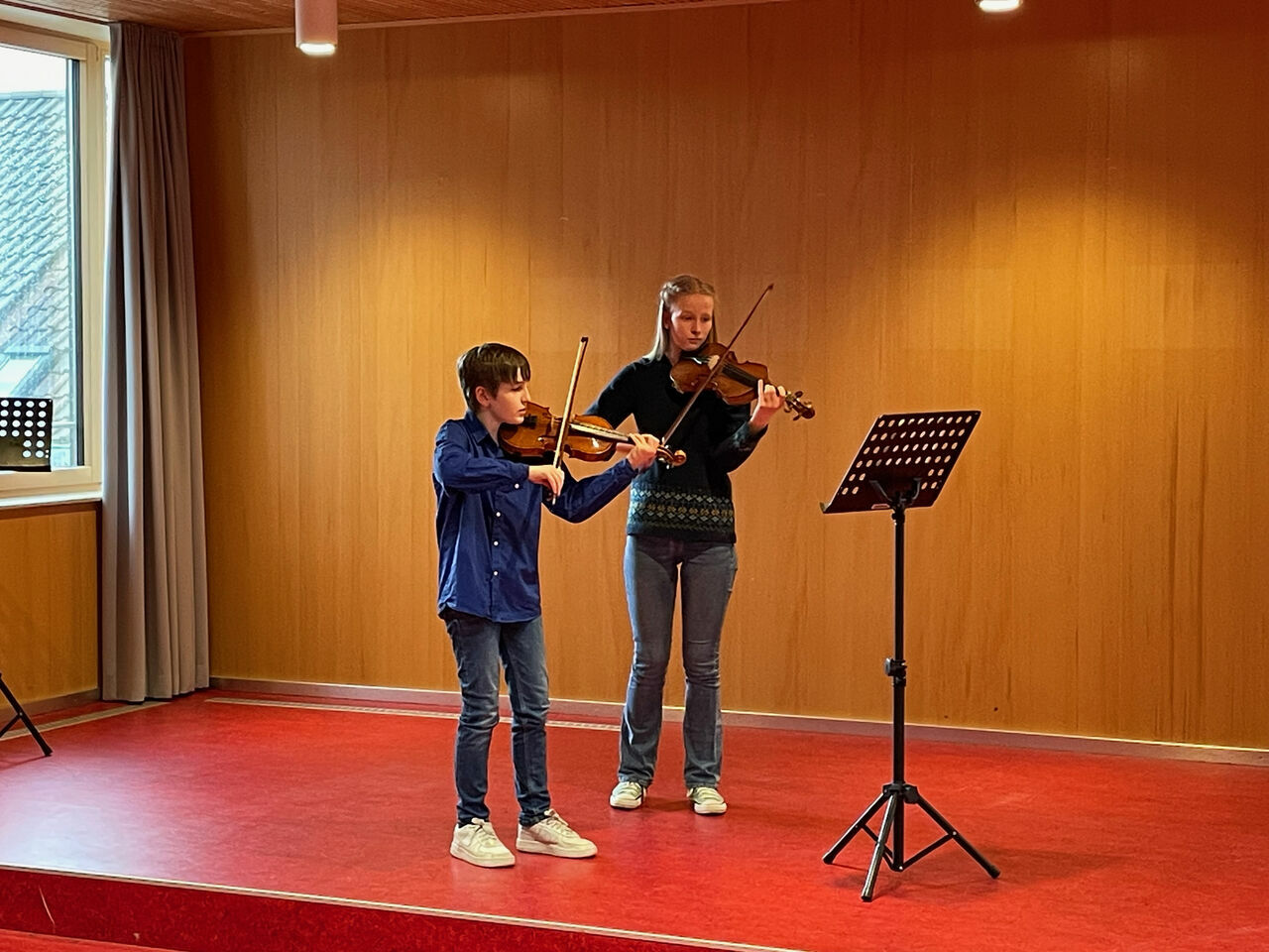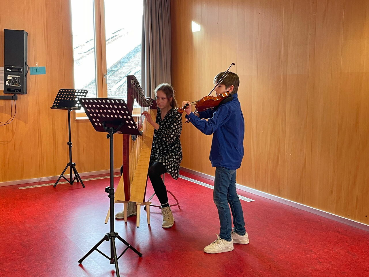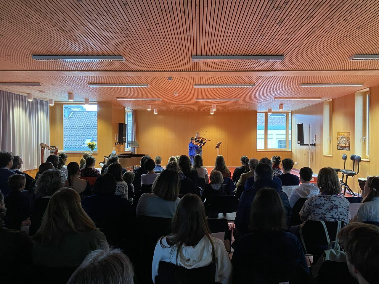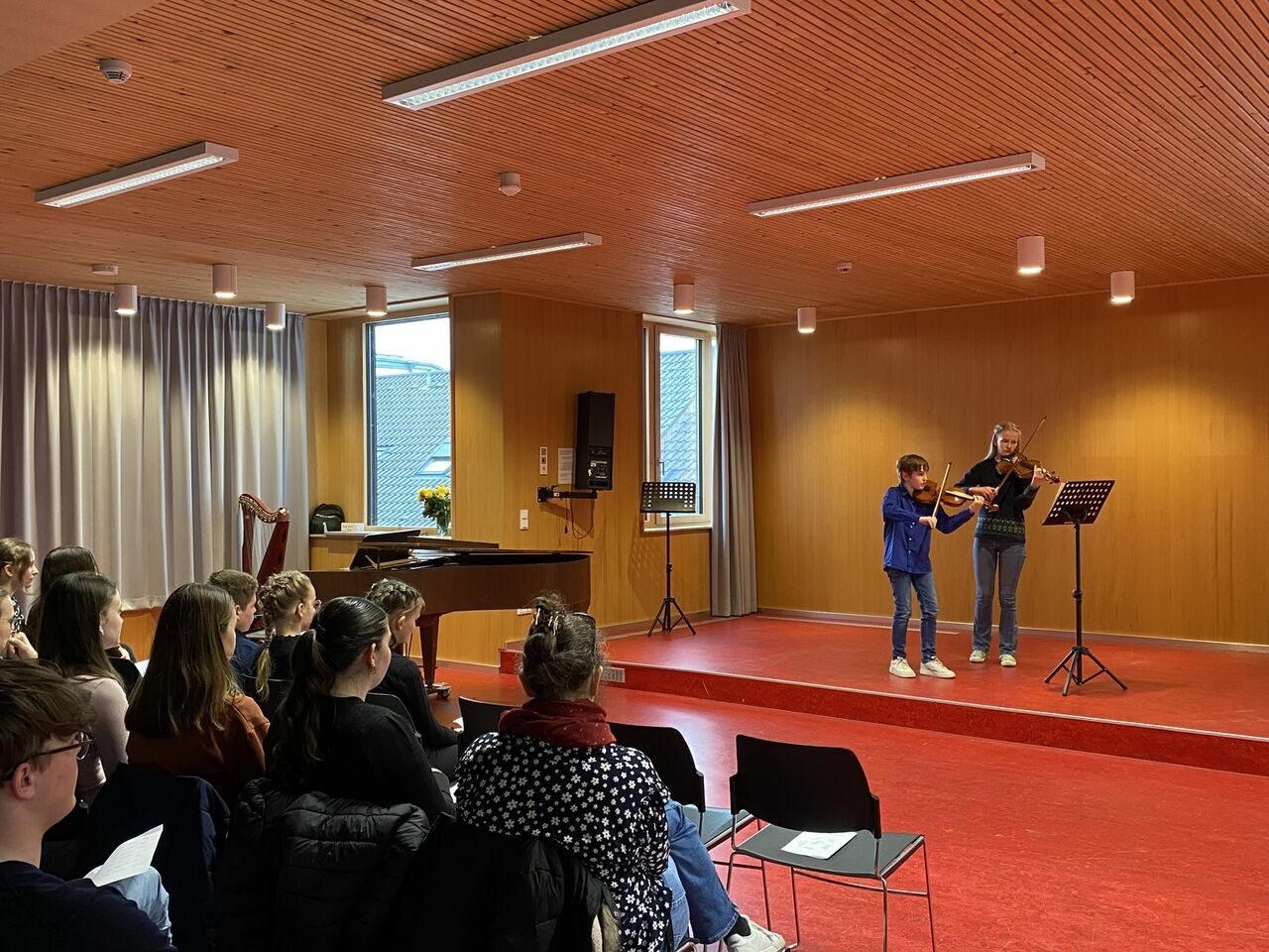 Die Schülerin Florestine Leverkus (KS 1) führte die Anwesenden durch den Abend, indem sie Informationen zu Komponisten, Epoche oder dem jeweiligen Stück vortrug. Das Publikum, bestehend aus Schülern, Lehrern und Eltern, durfte an diesem Abend eine Reise durch die verschiedensten Musikepochen und -stile erleben. 16 Musiker aus den unterschiedlichsten Jahrgangsstufen (und zwei Gäste) führten entweder Solo oder im Duett ihre fleißig erprobten Stücke wie „Menuette in G-Dur“ aus der Mannheimer Flötenschule oder „Der kleine Prinz auf seinem Planeten“ von Dieter Wendel auf. Ob Geige, Flügel oder Harfe: die Musik erfüllte die Luft und entführte die Zuhörer in die Welt der Klassik bis hin in die der Filmmusik.