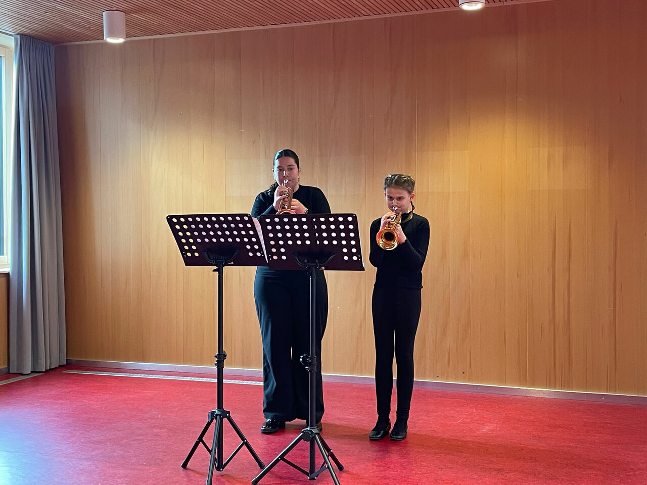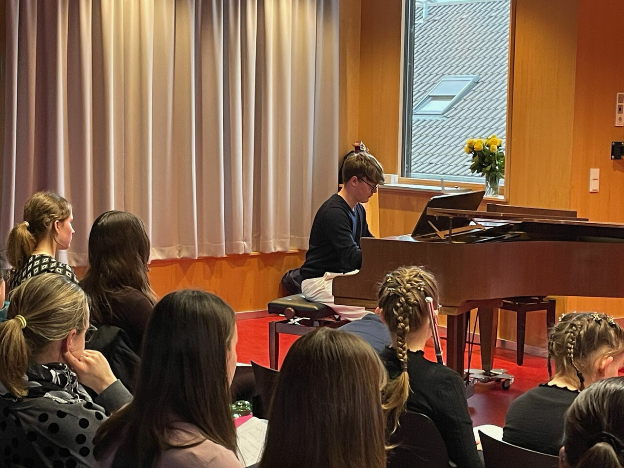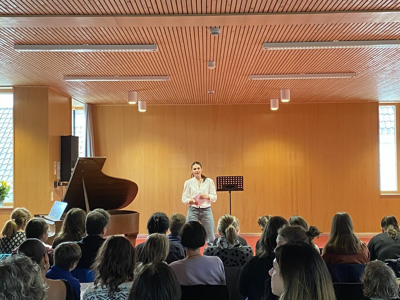 Die Schülerin Florestine Leverkus (KS 1) führte die Anwesenden durch den Abend, indem sie Informationen zu Komponisten, Epoche oder dem jeweiligen Stück vortrug. Das Publikum, bestehend aus Schülern, Lehrern und Eltern, durfte an diesem Abend eine Reise durch die verschiedensten Musikepochen und -stile erleben. 16 Musiker aus den unterschiedlichsten Jahrgangsstufen (und zwei Gäste) führten entweder Solo oder im Duett ihre fleißig erprobten Stücke wie „Menuette in G-Dur“ aus der Mannheimer Flötenschule oder „Der kleine Prinz auf seinem Planeten“ von Dieter Wendel auf. Ob Geige, Flügel oder Harfe: die Musik erfüllte die Luft und entführte die Zuhörer in die Welt der Klassik bis hin in die der Filmmusik.