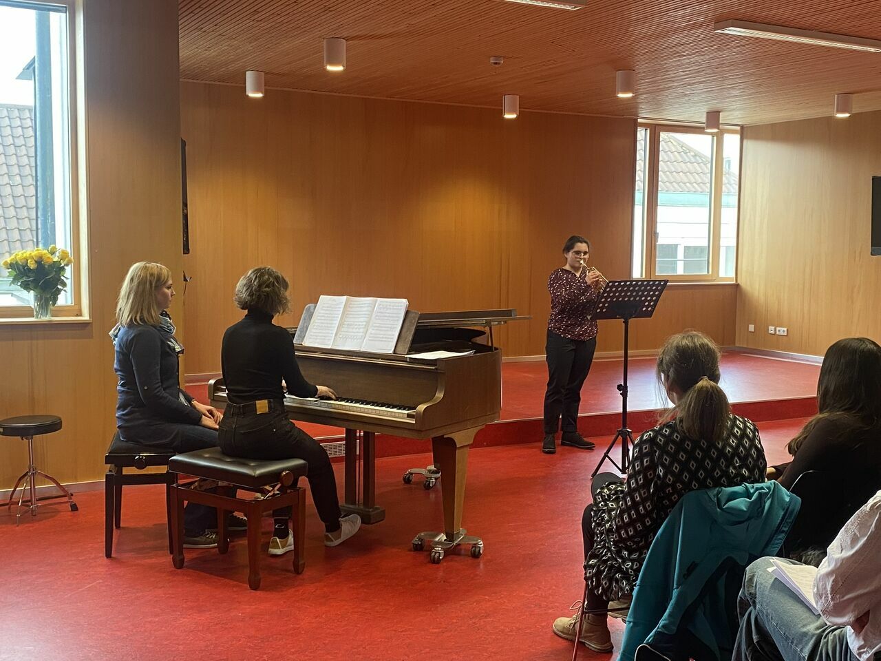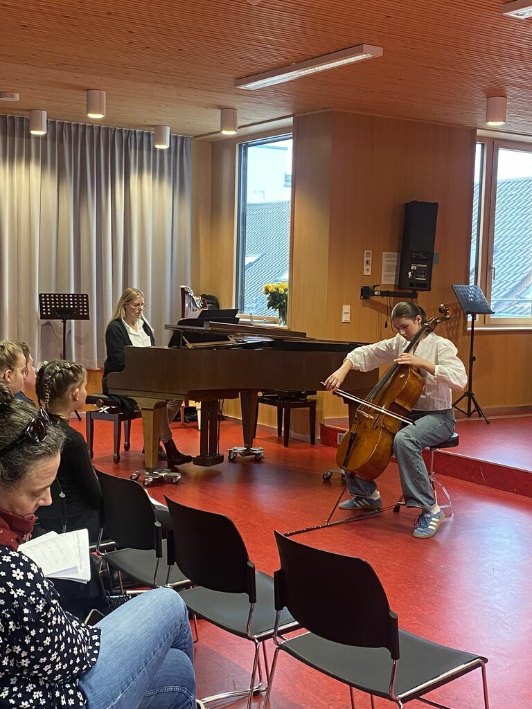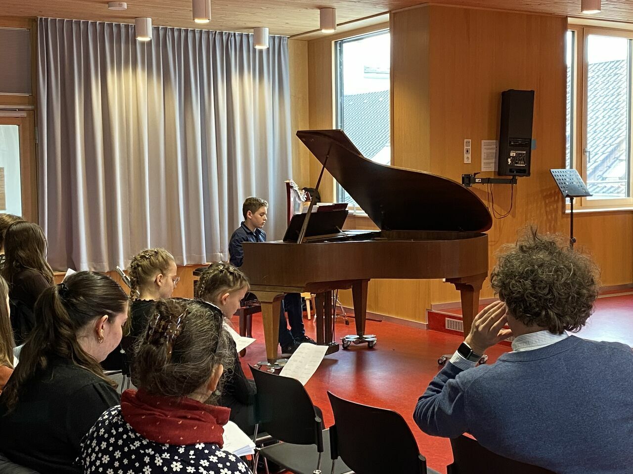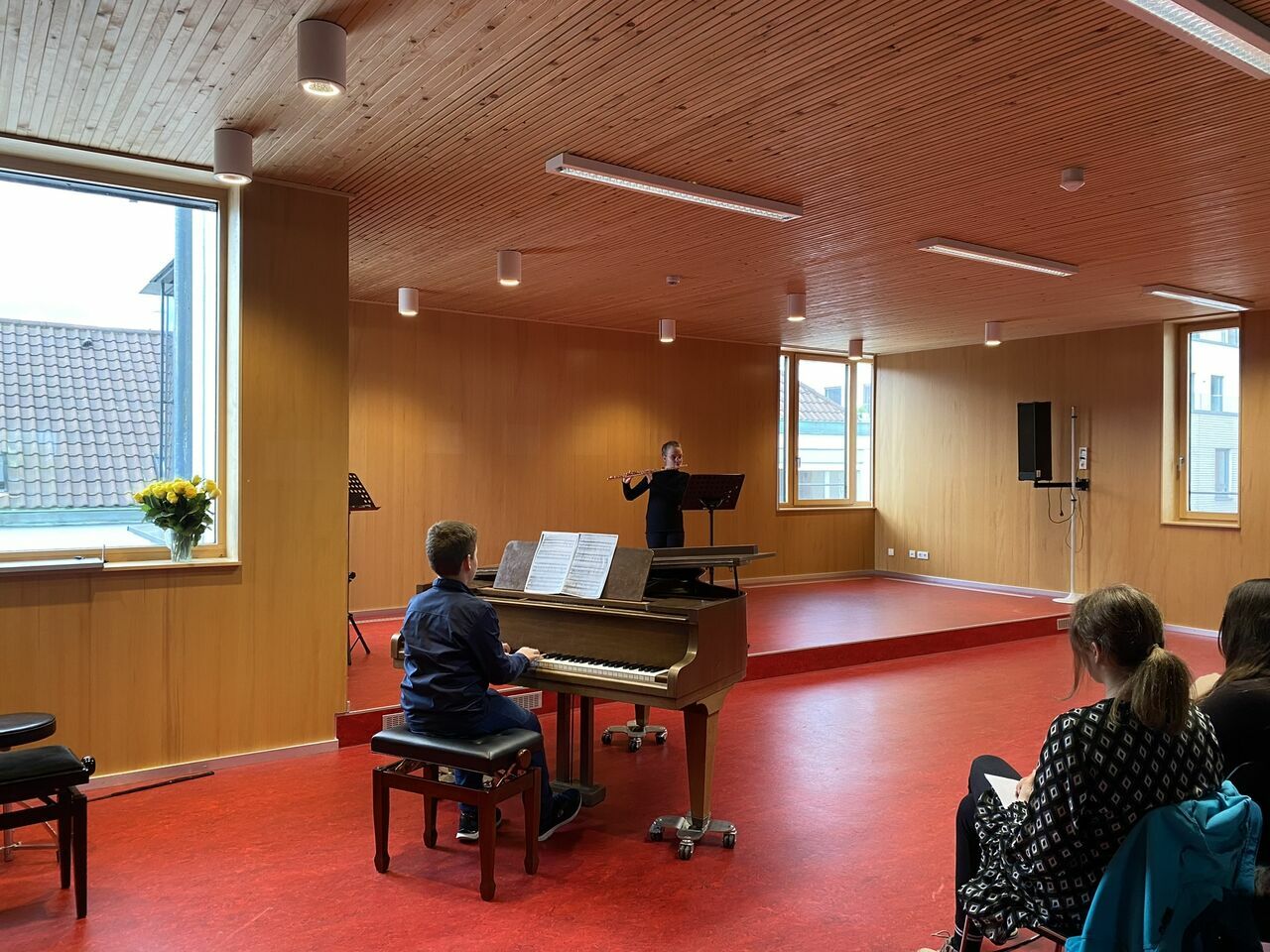 Die Schülerin Florestine Leverkus (KS 1) führte die Anwesenden durch den Abend, indem sie Informationen zu Komponisten, Epoche oder dem jeweiligen Stück vortrug. Das Publikum, bestehend aus Schülern, Lehrern und Eltern, durfte an diesem Abend eine Reise durch die verschiedensten Musikepochen und -stile erleben. 16 Musiker aus den unterschiedlichsten Jahrgangsstufen (und zwei Gäste) führten entweder Solo oder im Duett ihre fleißig erprobten Stücke wie „Menuette in G-Dur“ aus der Mannheimer Flötenschule oder „Der kleine Prinz auf seinem Planeten“ von Dieter Wendel auf. Ob Geige, Flügel oder Harfe: die Musik erfüllte die Luft und entführte die Zuhörer in die Welt der Klassik bis hin in die der Filmmusik.