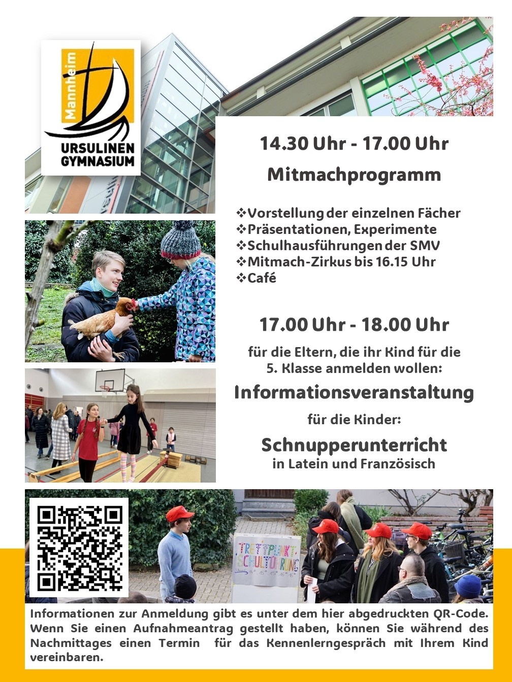 Es wird von 14.30 Uhr bis 17 Uhr wieder Informationen für Erwachsene und Mitmachangebote für die Kinder geben. Während ab 17 Uhr in der Turnhalle dann der Schulleiter interessierte Eltern über die Schule informiert, können die Kinder am Schnupperunterricht Latein oder Französisch teilnehmen. Das detaillierte Programm wird eine Woche vor dem Tag der offenen Tür hier abrufbar sein.