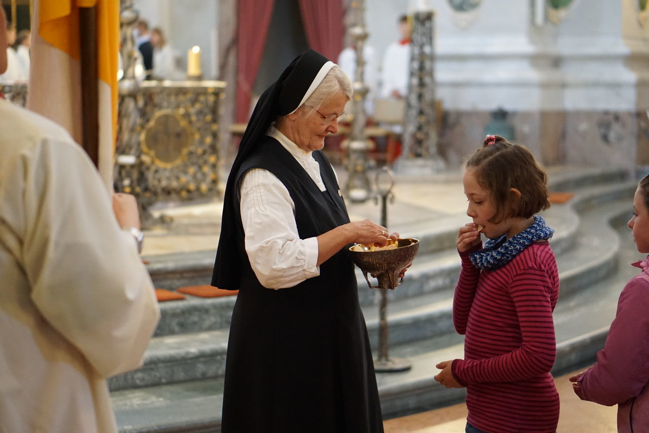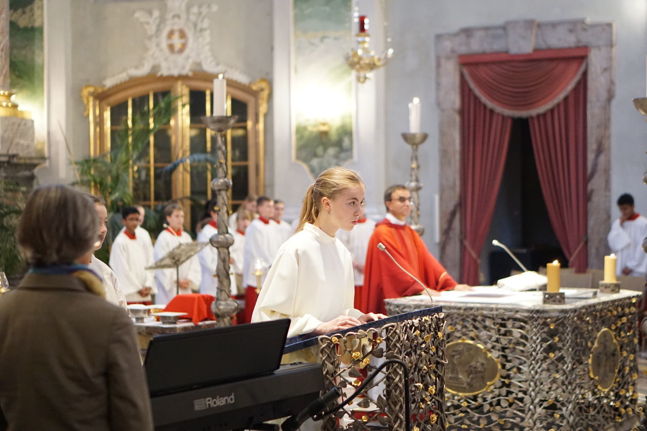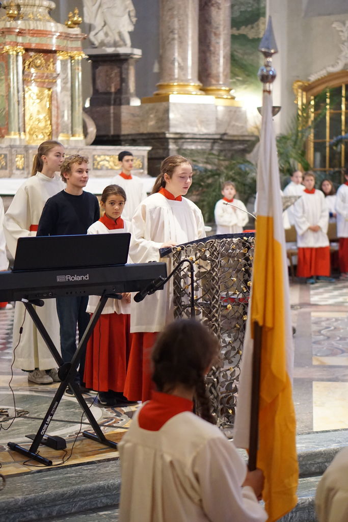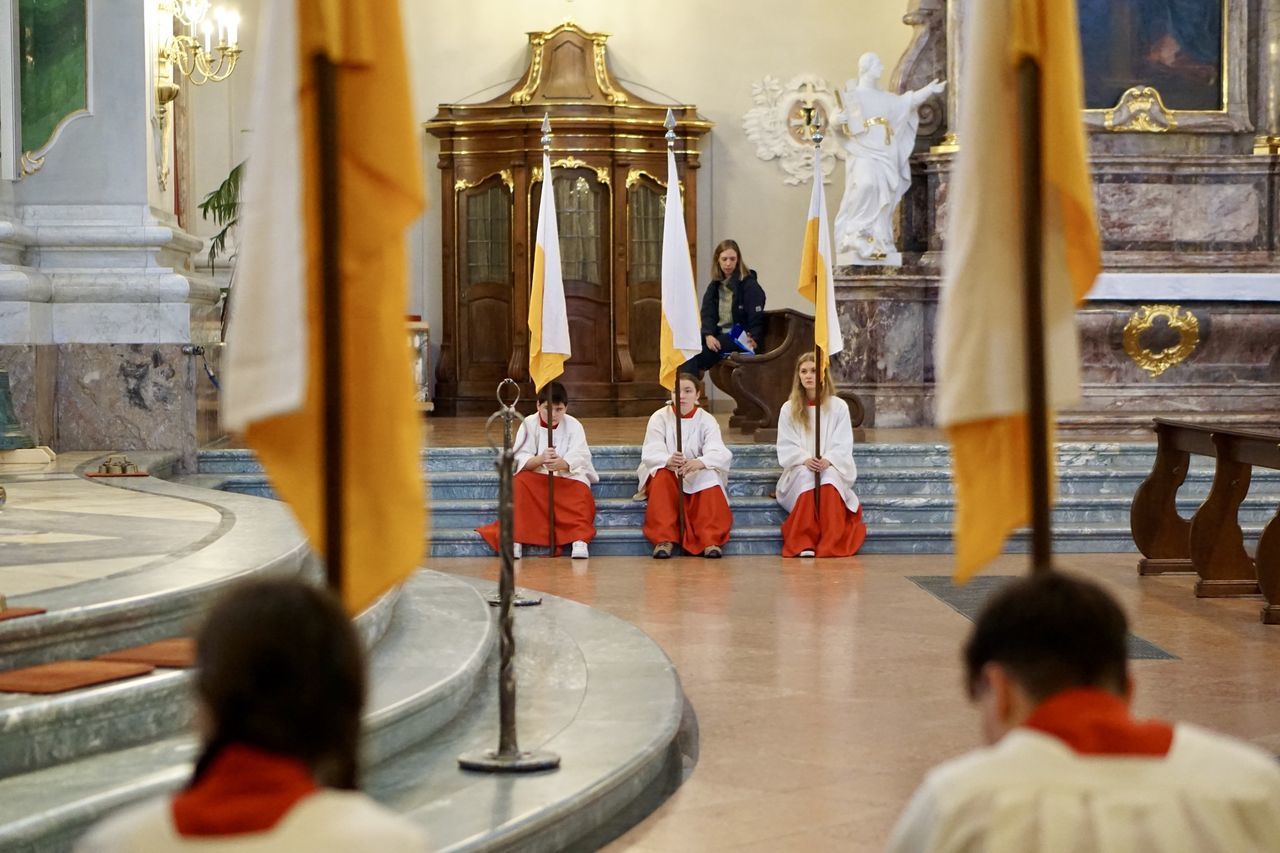 Zu Beginn der Feierlichkeit zogen zum Einzugslied eine Schar von rund 50 Ministranten ein, die gleichzeitig das diesjährige Thema im Gottesdienst darstellten. Der Gottesdienst drehte sich um die Fragen: Wie kann ich anderen dienen? Welchen Dienst kann ich anderen zugute leisten?