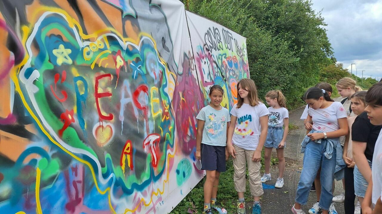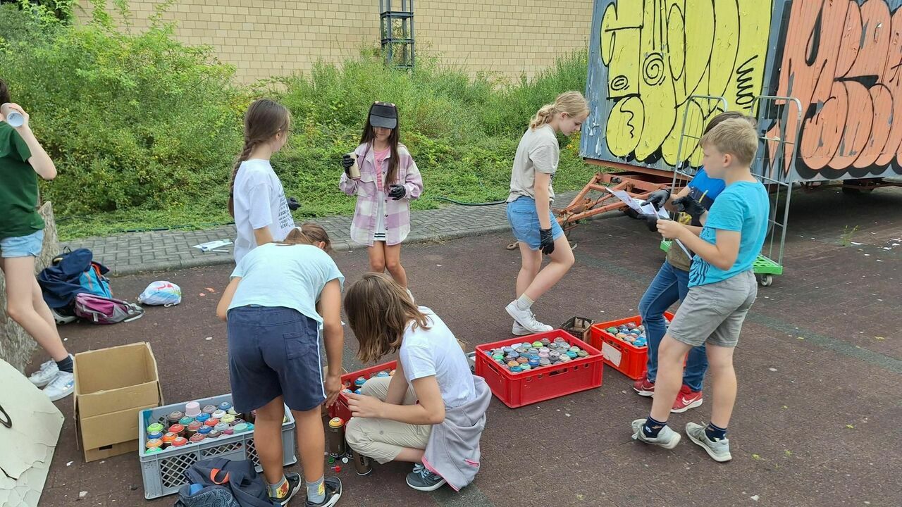 Wir, die Klasse 5b, erlebten am 23.07.24 einen Wandertag aufs Metropolinkgelände in der ehemaligen amerikanischen Patrick-Henry-Kaserne in Heidelberg. Frau Gürlich und Frau Rummel organisierten und begleiteten uns auf diesem Ausflug. Auf dem Metropolinkgelände angekommen, wurden wir von einem professionellen Graffitikünstler herumgeführt und er zeigte uns verschiedene Graffitigemälde von berühmten Graffitikünstlern. Unter anderem ein Gemälde, das in Blau und Rot gesprayt worden ist. Überrascht hat uns, dass das Bild unterschiedlich erschien - je nachdem, ob man es durch blaues oder rotes Licht ansah. Nachdem wir wichtige Informationen zum Sprayen erhalten hatten, taten wir uns in Gruppen zusammen, entwickelten ein Konzept und fingen anschließend an zu sprayen. Wir alle hatten sehr verschiedene Ideen und diese wurden kreativ umgesetzt. Von verschiedenen Tags bis zu lustigen Smileys war alles dabei. Wir hatten sehr viel Spaß und als alle fertig waren, machten wir einen Rundgang durch alle unsere Spray-Kunstwerke, welche von ihren Künstlern vorgestellt wurden. Dann durften wir noch mitgebrachte Sachen, wie Schuhe und T-Shirts besprühen. Insgesamt war dieser Tag sehr schön und wir fuhren glücklich mit den gesprayten Sachen wieder zusammen zurück zur Schule.