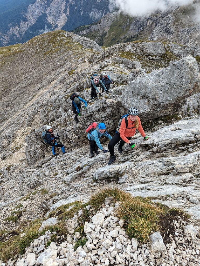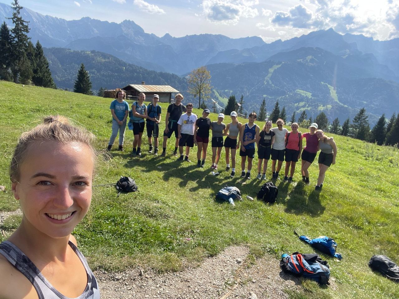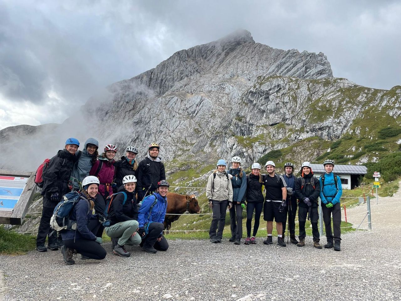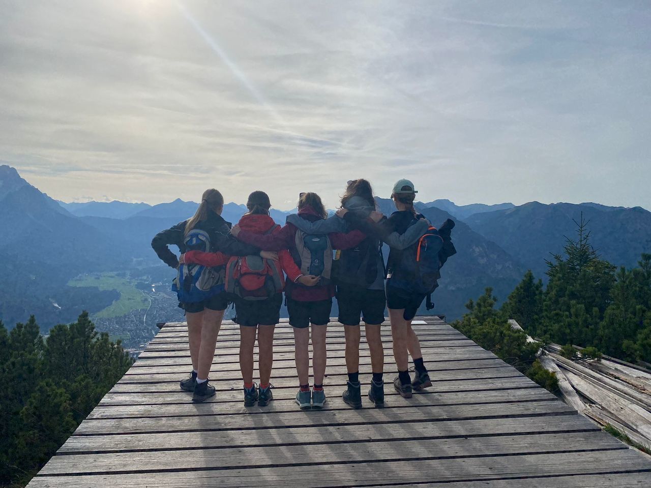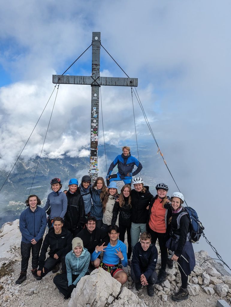 Tags darauf war uns die körperliche Anstrengung doch langsam anzumerken, was uns jedoch nicht weiter aufhielt. Voller Kampfgeist brach die gesamte Gruppe ein letztes Mal zusammen auf, um die Alpspitze gemeinsam zu erklimmen. Auch diesmal erwartete uns ein anspruchsvoller Weg durchwachsen von Leitern, Anstiegen und Klettereinlagen. Zudem begegneten wir einer Truppe der Bundeswehr, bis wir endlich den Gipfel erreichten. Erschlagen von der wortwörtlich atemberaubenden Aussicht, posierten wir für das wohlverdiente Gruppenfoto vor dem Gipfelkreuz. Auf demselben Wege kehrten wir zur Hütte an der Bergstation zurück, womit wir unsere letzte Wanderung gemeistert hatten. Wieder im Tal, ging es für uns zum Abschluss bayrisch essen, wonach wir den Abend mit einer großen Spielerunde ausklingen ließen.