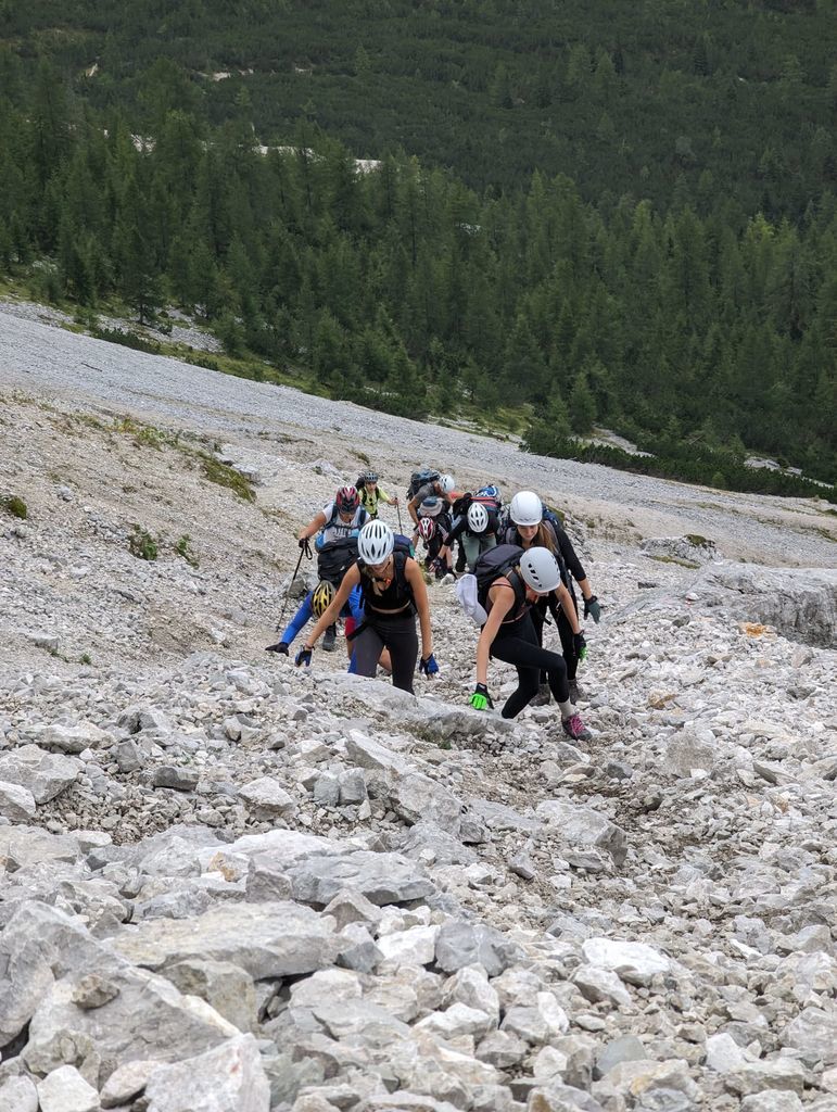 Am nächsten Morgen in aller Herrgottsfrühe stärkten wir uns für die anstehende Herausforderung am Frühstücksbuffet. Tupperdosen gepackt und Wanderschuhe geschnürt, fuhren wir mit der Zahnradbahn in Richtung Riffelriß. Kaum ausgestiegen, folgte schon der erste knackige Anstieg, der uns ordentlich ins Schwitzen brachte. Nachdem dieser überwunden war, wurde es nicht etwa leichter, sondern gar noch anspruchsvoller, da wir mit einem Geröllfeld konfrontiert wurden, welches wir überqueren mussten. Der klettersteigartige Wanderweg führte uns, mit Drahtseilen gesichert, am Abhang entlang, bis wir schließlich auf der Flucht vor den drohenden Regenwolken das ersehnte Plateau erreichten. Noch voller Adrenalin kehrten wir nach einer kurzen Pause schon wieder auf unsere Route zurück, um das Zwischenziel der Höllentalangerhütte vor dem großen Regen zu erreichen.