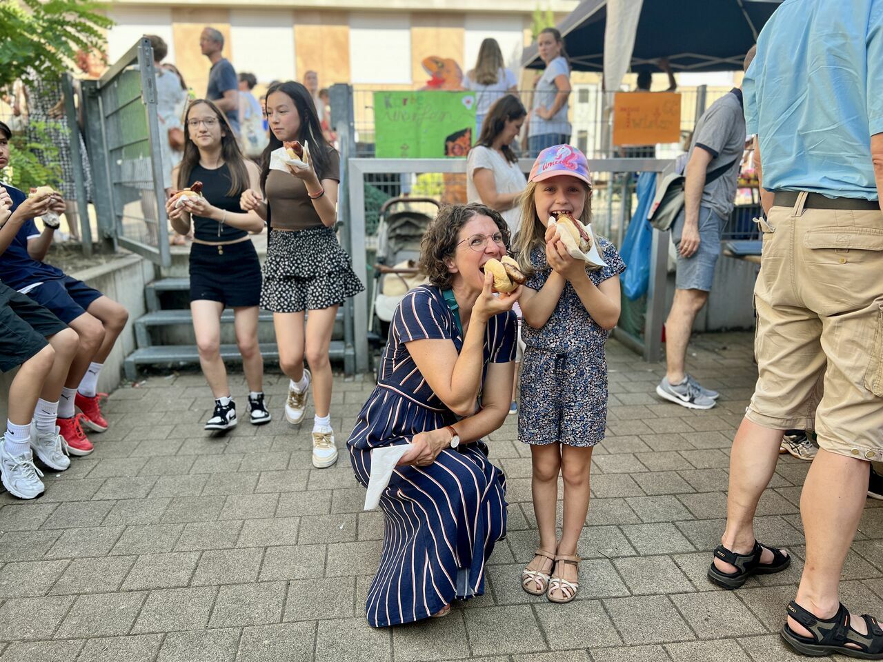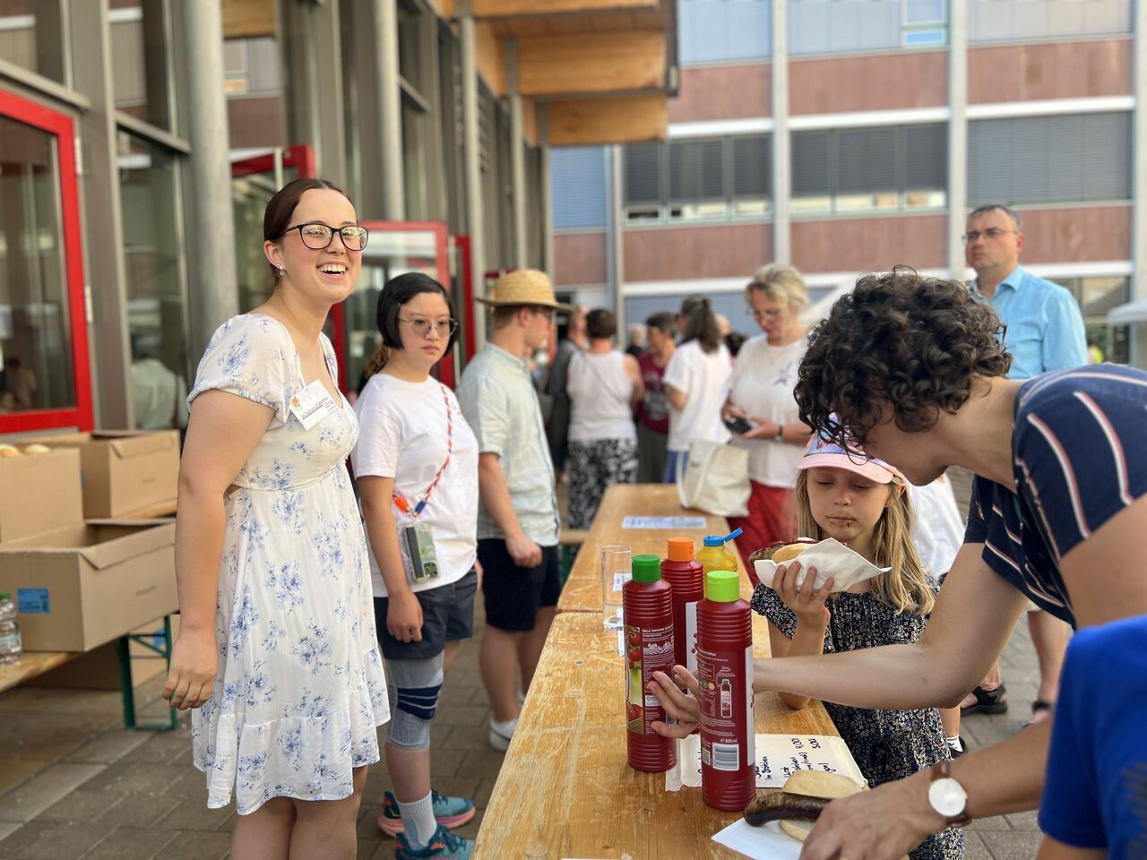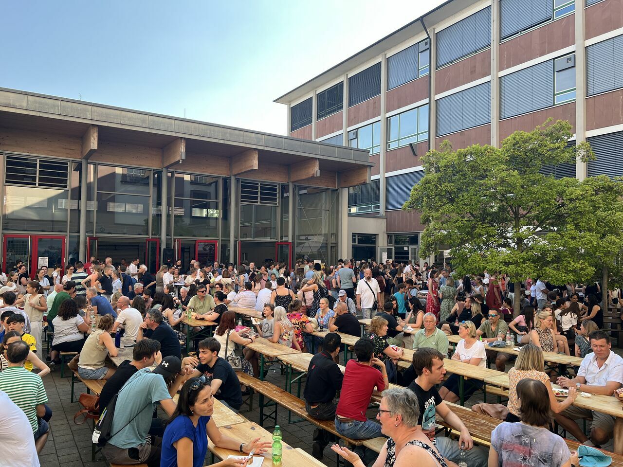 Am Freitag, dem 19. Juli, fand von 17 bis 21 Uhr das mit Spannung erwartete Sommerfest des UGM statt. Schon am Haupteingang begrüßten bunte Plakate die Gäste und informierten über die verschiedenen Attraktionen des Abends. Der große Hof war festlich mit Stehtischen und langen Esstischen ausgestattet, die Platz für alle Besucher boten. Die Schüler der 9. und 10. Klassen sorgten mit Hot Dogs, Cocktails und Salaten für eine ausgezeichnete Verpflegung. Zusätzlich gab es einen Imkerstand und einen Grill, an dem Eltern die Gäste kulinarisch verwöhnten. Im Foyer bot die KS1 köstliche Kuchen an, während die Coffee Roasters Kaffee aus eigener Produktion servierten.