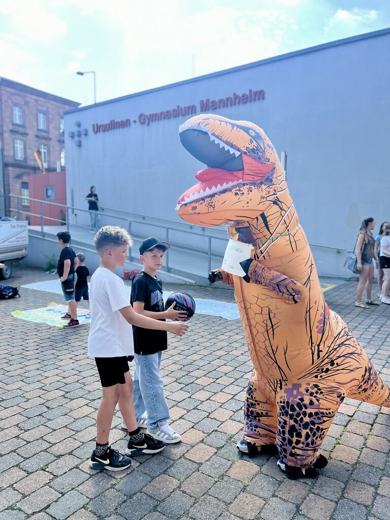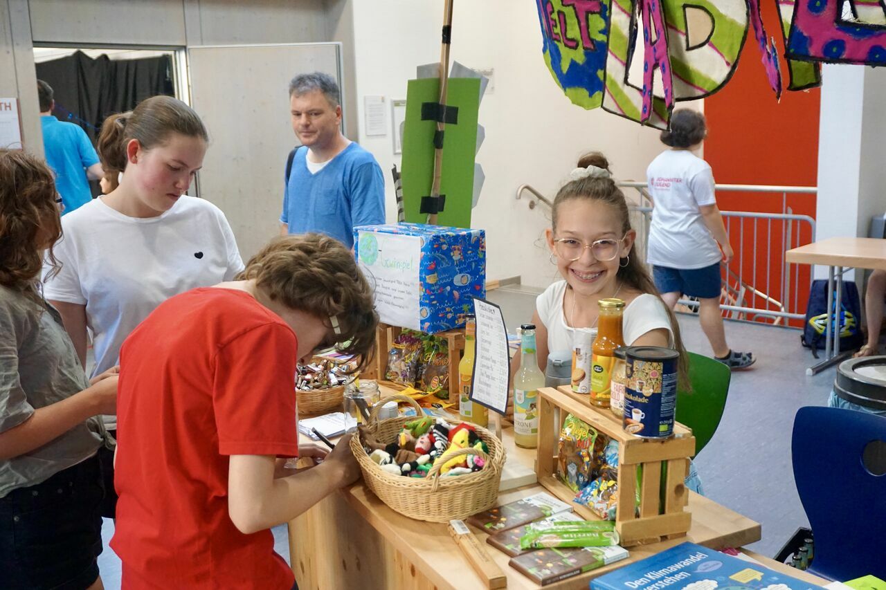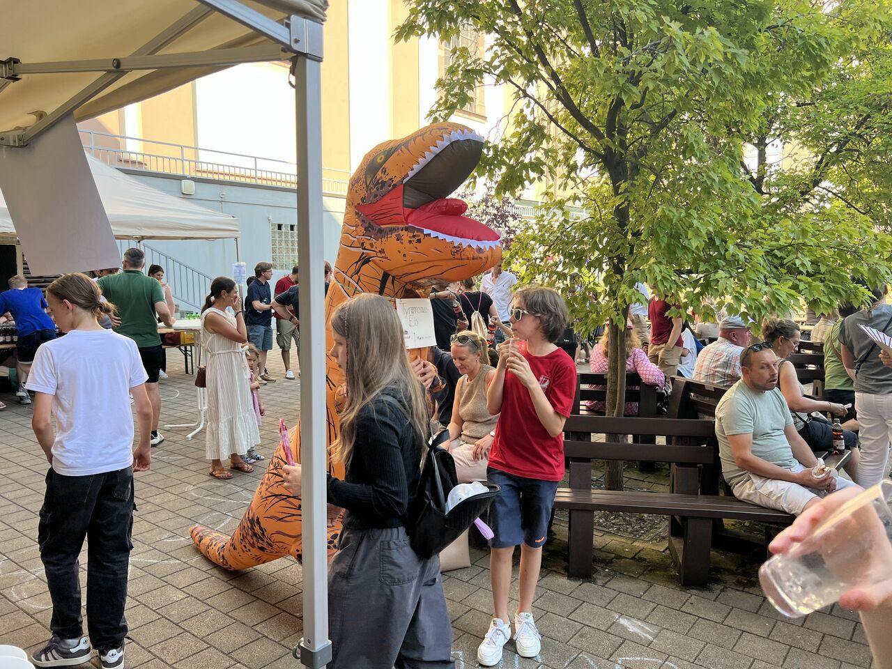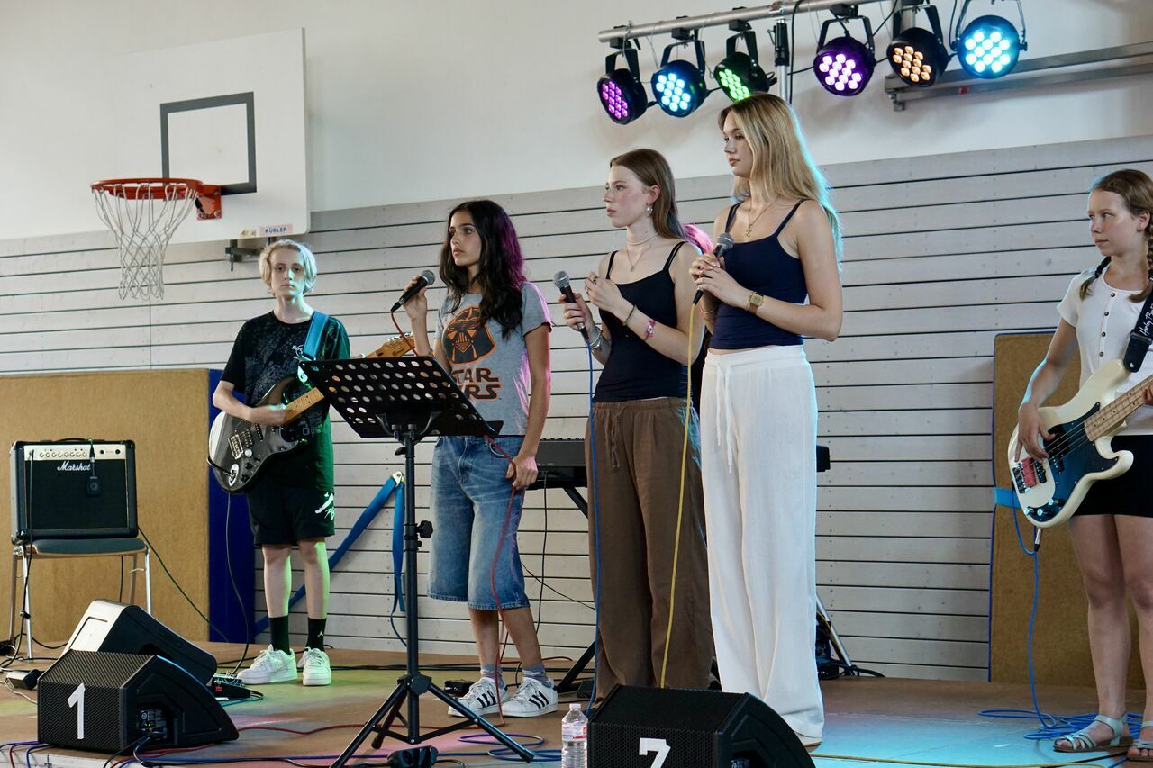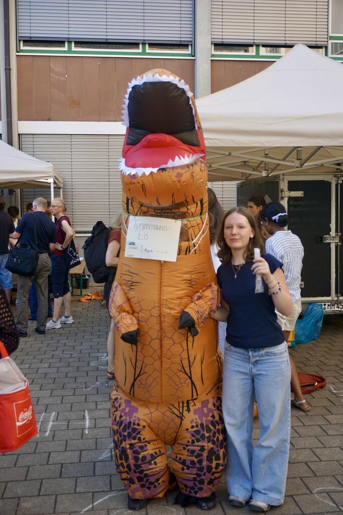 Abseits des großen Hofes hatten die Klassen der Unterstufe verschiedene Stände organisiert, darunter Tombolas, Dosenwerfen und spannende Parcours für die jüngeren Gäste. Ein kleines Highlight des Festes waren die Schüler in Dinokostümen, die fleißig für Eis Werbung machten. Um 17 Uhr trat das Upcycling-Orchester auf, dessen Instrumente ausschließlich aus recycelten Materialien wie Rasseln, Trommeln und Flöten gefertigt waren. Das Publikum war begeistert und belohnte die Darbietung mit großem Applaus. Um 18 Uhr folgte die Zirkusvorstellung der Fünftklässler unter der Leitung von Herrn Berberich. Das Programm bot eine beeindruckende Mischung aus Einradkunststücken, Seilvorführungen, Kugellaufen und Trapezeinlagen. Besonders bemerkenswert waren die Fünftklässler, die mit beeindruckender Geschicklichkeit das Gleichgewicht auf ihren Einrädern hielten. Um 19 Uhr sorgte die Schulband für ausgelassene Stimmung: Die zwei Sängerinnen, zwei Gitarristen, ein Schlagzeuger und ein Keyboardspieler begeisterten mit mitreißender Musik und ernteten frenetischen Beifall.