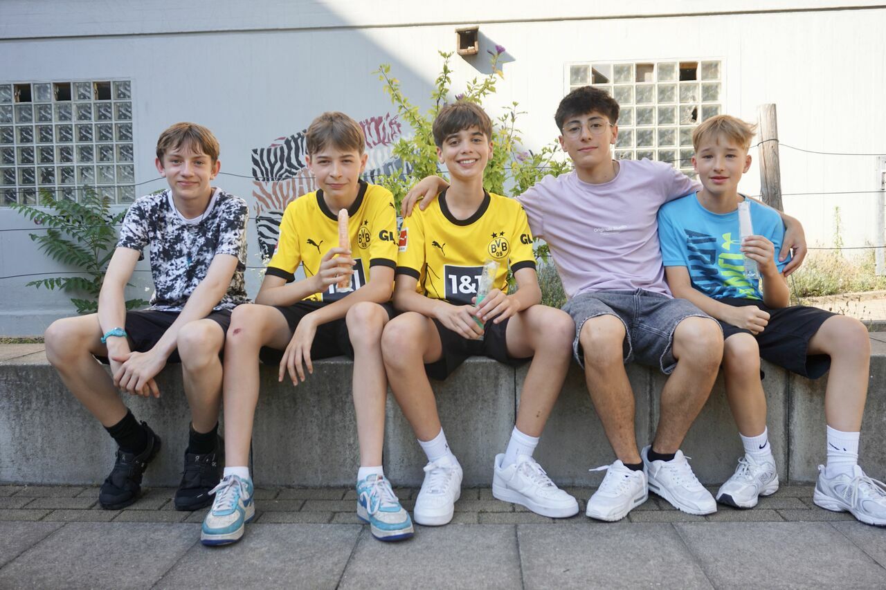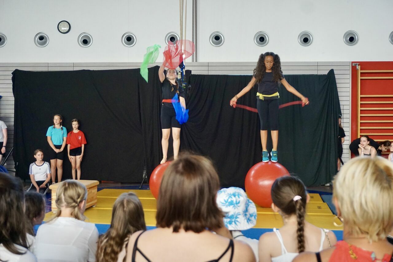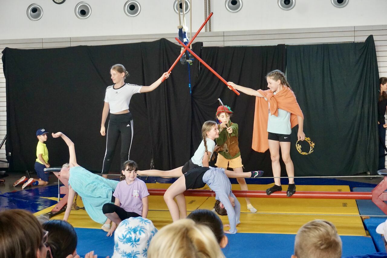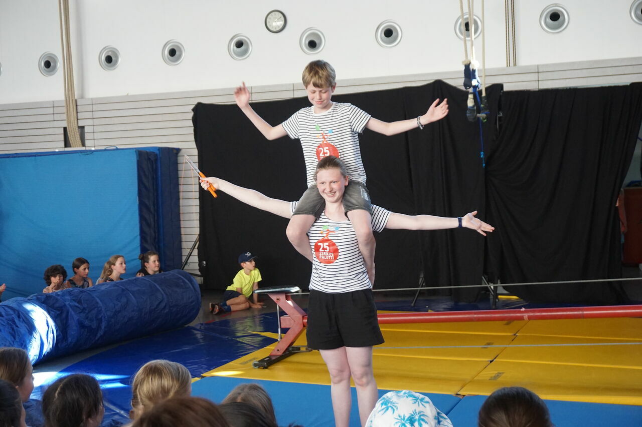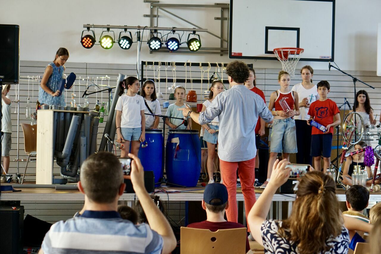 Abseits des großen Hofes hatten die Klassen der Unterstufe verschiedene Stände organisiert, darunter Tombolas, Dosenwerfen und spannende Parcours für die jüngeren Gäste. Ein kleines Highlight des Festes waren die Schüler in Dinokostümen, die fleißig für Eis Werbung machten. Um 17 Uhr trat das Upcycling-Orchester auf, dessen Instrumente ausschließlich aus recycelten Materialien wie Rasseln, Trommeln und Flöten gefertigt waren. Das Publikum war begeistert und belohnte die Darbietung mit großem Applaus. Um 18 Uhr folgte die Zirkusvorstellung der Fünftklässler unter der Leitung von Herrn Berberich. Das Programm bot eine beeindruckende Mischung aus Einradkunststücken, Seilvorführungen, Kugellaufen und Trapezeinlagen. Besonders bemerkenswert waren die Fünftklässler, die mit beeindruckender Geschicklichkeit das Gleichgewicht auf ihren Einrädern hielten. Um 19 Uhr sorgte die Schulband für ausgelassene Stimmung: Die zwei Sängerinnen, zwei Gitarristen, ein Schlagzeuger und ein Keyboardspieler begeisterten mit mitreißender Musik und ernteten frenetischen Beifall.