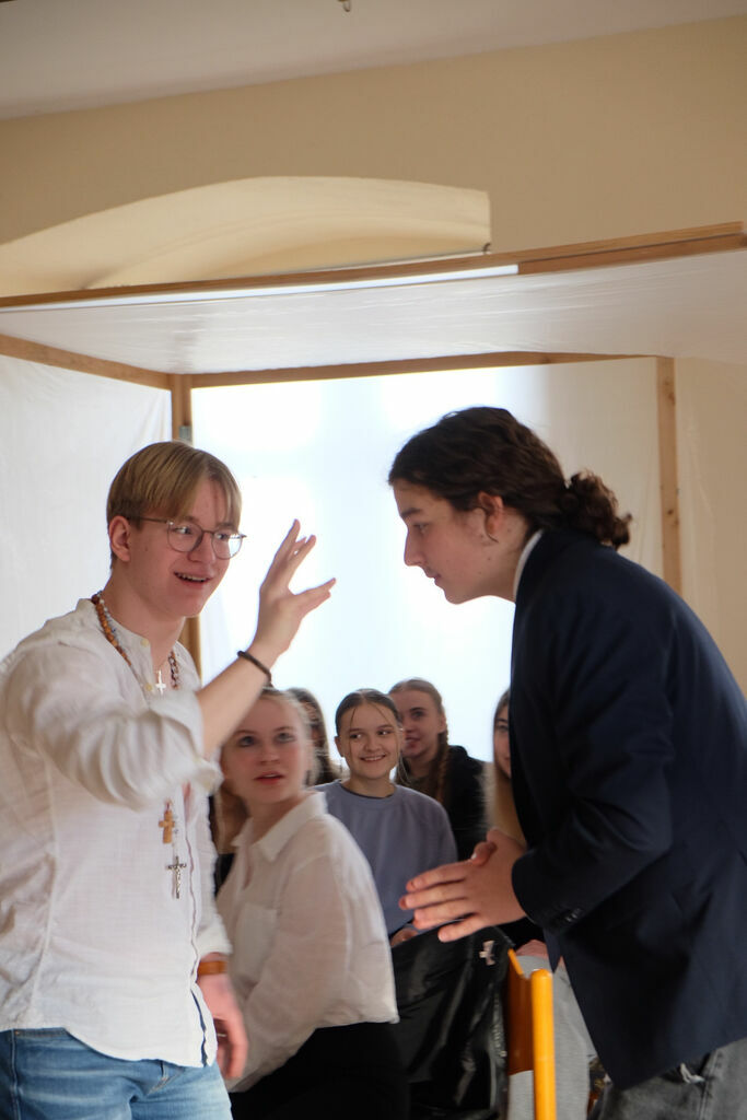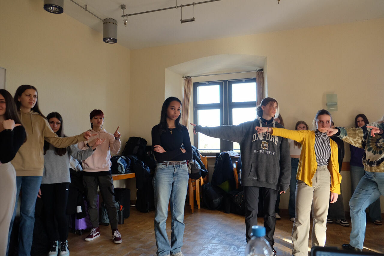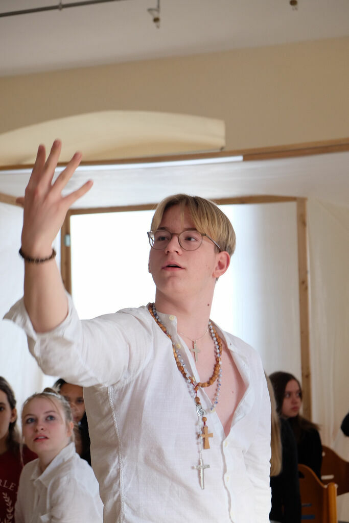 Die Anreise war am Montag, den 29.01.2024, gegen 9:00 Uhr. Wir trafen uns in einem Raum und begannen gleich mit dem Proben. In den Pausen schauten wir uns die Jugendherberge und die Natur rund um die Burgruine an. Um 14:00 Uhr durften wir dann unsere Zimmer beziehen. Die Zimmereinteilung war angenehm und es herrschte gute Stimmung, als es Mittagessen gab. Nach dem Essen teilten wir uns in zwei Gruppen auf und probten einzelne Szenen und Auftritte, um nach ca. 1 ½ Stunden der jeweils anderen Gruppe unsere erarbeiteten Szenen und Auftritte vorzuführen. Dieses Konzept zog sich durch alle Proben. Gegen 19:00Uhr machten wir uns auf den Weg in den Speisesaal, um das lang ersehnte Abendessen einzunehmen. Am Abend gab es eine letzte Probe vor der Nachtruhe. Im Anschluss saßen wir alle gemütlich zusammen und unterhielten uns. So lernten wir uns Abend für Abend besser kennen und wertschätzen.