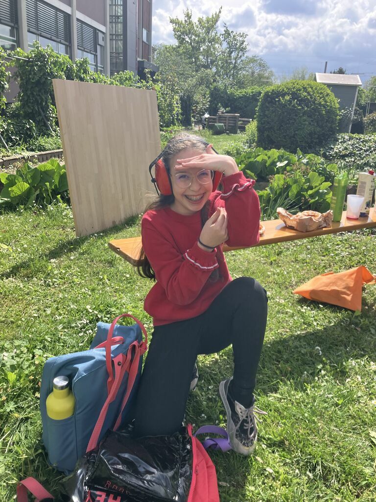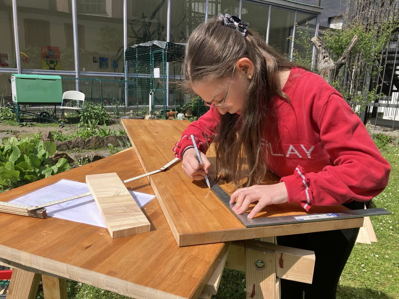 Deshalb haben wir uns zum ersten Mal am 17.04.2024 zu dritt am Nachmittag bei wunderschönem Wetter im Garten des UGM getroffen. Frau Brems und ich haben erstmal angefangen auf den Brettern die richtigen Maße einzuzeichnen.